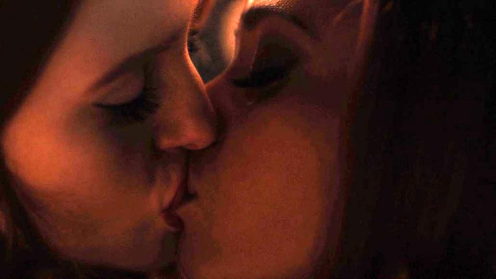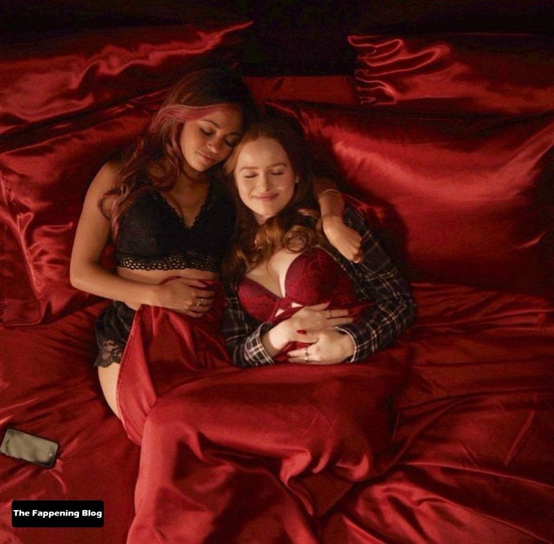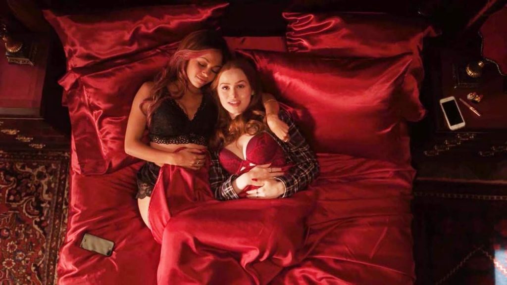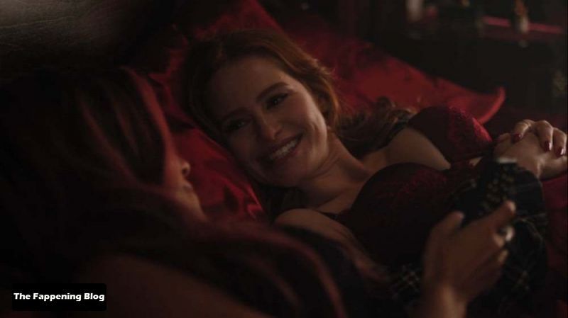 There is the scene of two hotties, Madelaine Petsch & Ashleigh Murray’s lesbian kiss from ‘Riverdale’! There is gorgeous redhead Madelaine Petsch is seen showing deep cleavage in a red bra, and Ashleigh Murray wearing a blacktop. They’re at first seen from above talking and then looking at their cell phones, before they roll over and start the lesbian action, kissing and moaning!