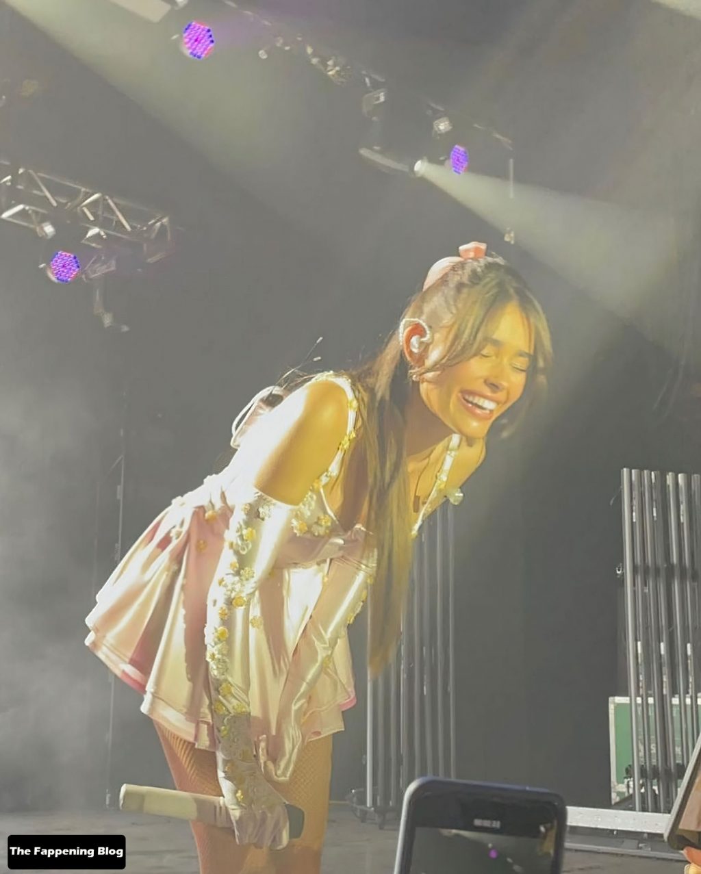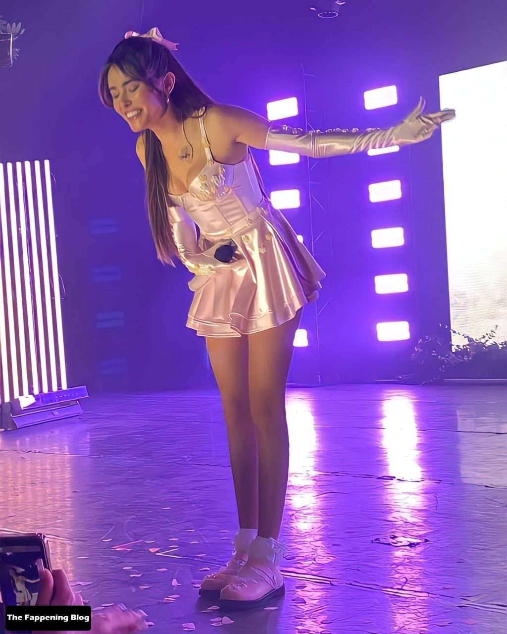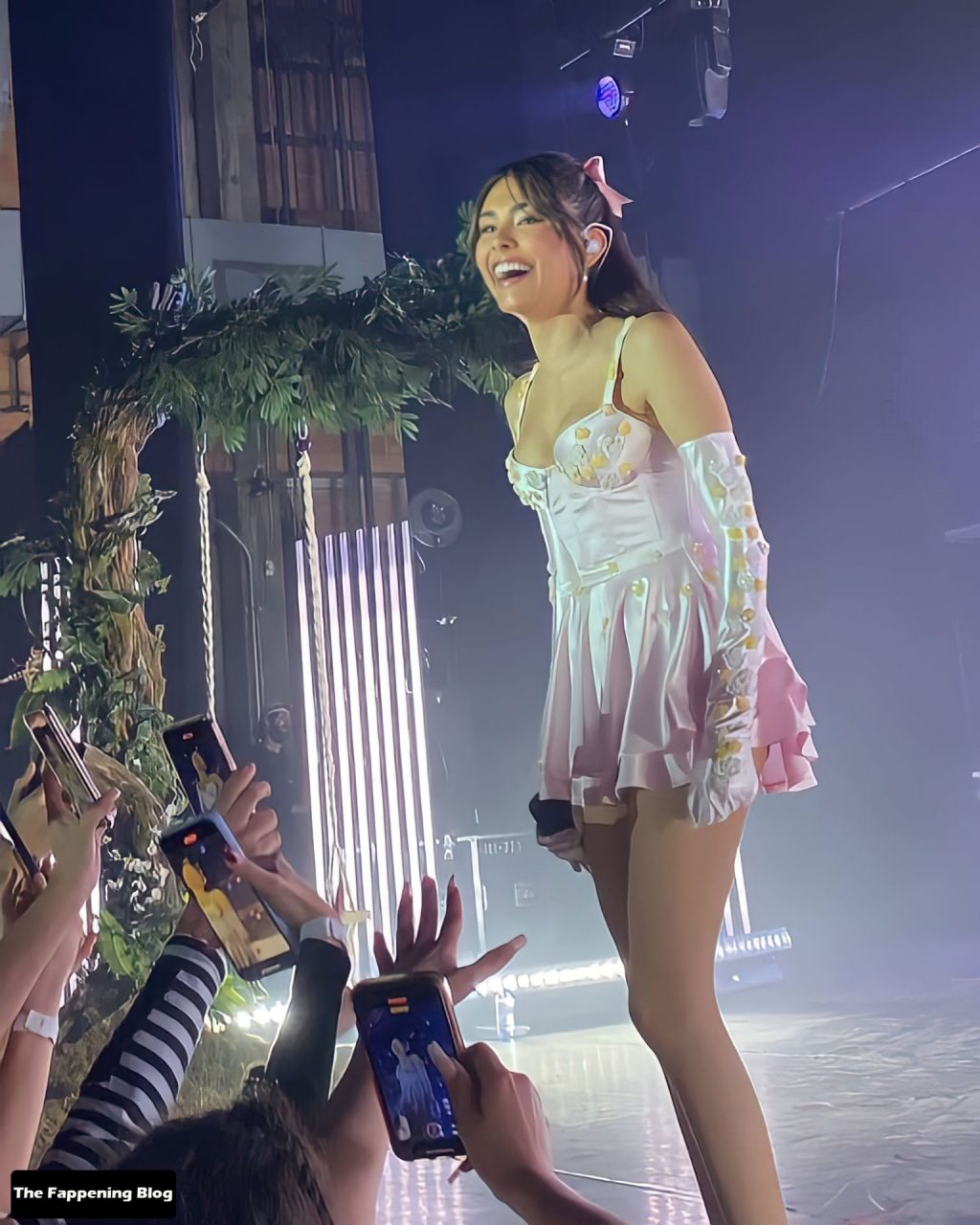 Певица и звезда The Fappening Мэдисон Бир показывает свои сексуальные ноги и грудь в красивых платьях во время выступления на сцене в Торонто, 18.10.2021.