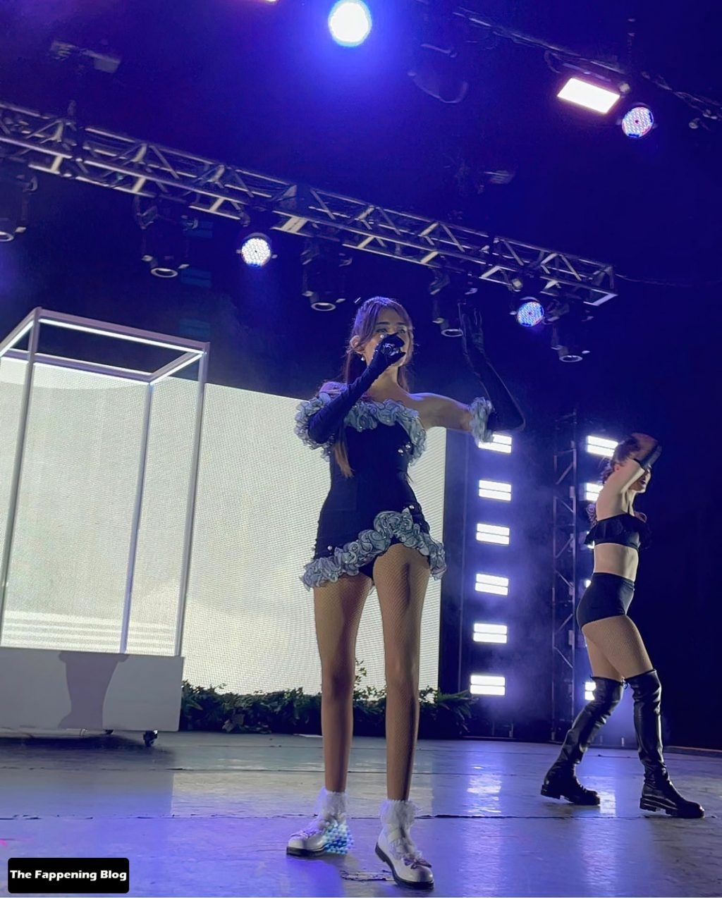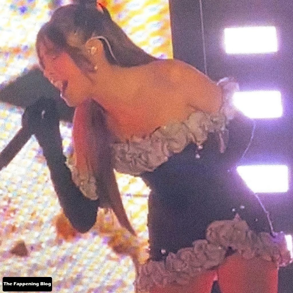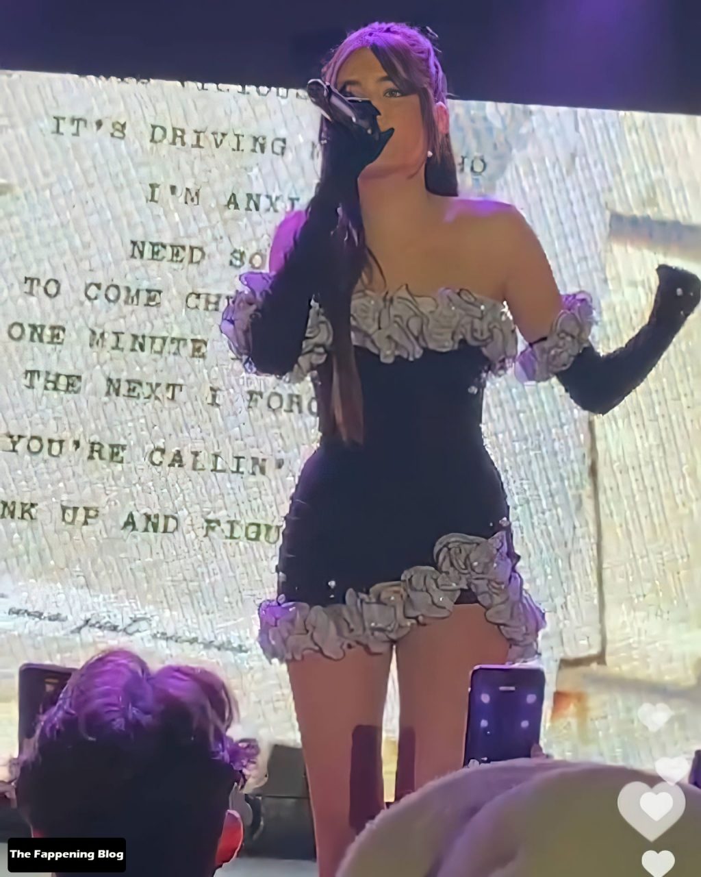 Певица и звезда The Fappening Мэдисон Бир показывает свои сексуальные ноги и грудь в красивых платьях во время выступления на сцене в Торонто, 18.10.2021.