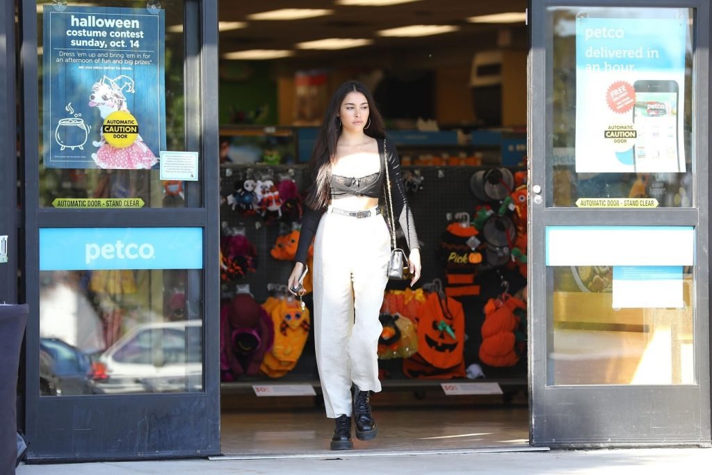 Певица Мэдисон Бир (19) остановилась, чтобы купить некоторые товары для собак в Petco в Лос-Анджелесе, 10/10/2018. Мэдисон была в откровенном наряде с открытым черным свитером спереди, который показывал ее черный бюстгальтер и подтянутый живот, пока она брала пеленки для щенков.