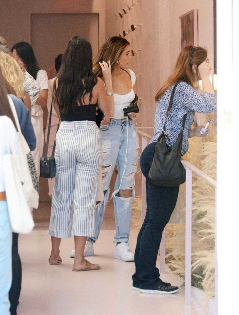 Певица Мэдисон Бир в белом топе с глубоким вырезом и рваных джинсах привлекает внимание вместе со своими сексуальными подругами во время шопинга в Беверли-Хиллз, 22.04.2019.