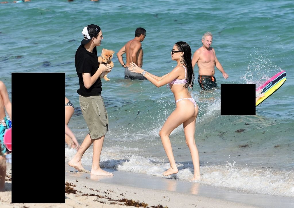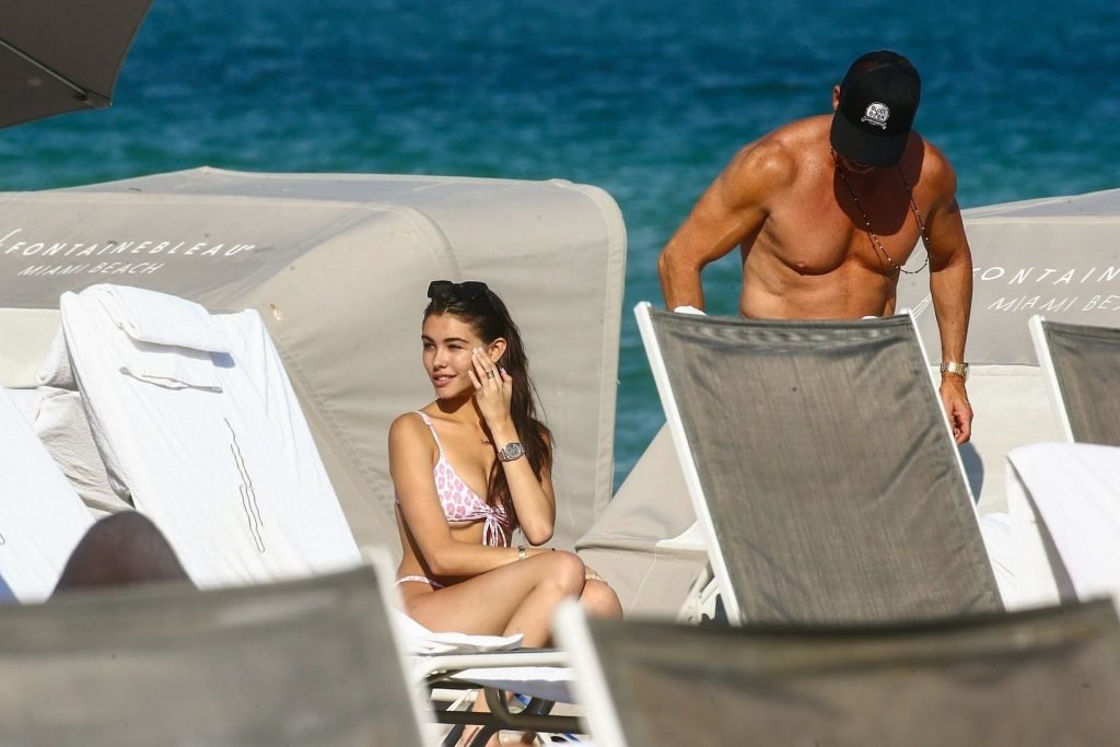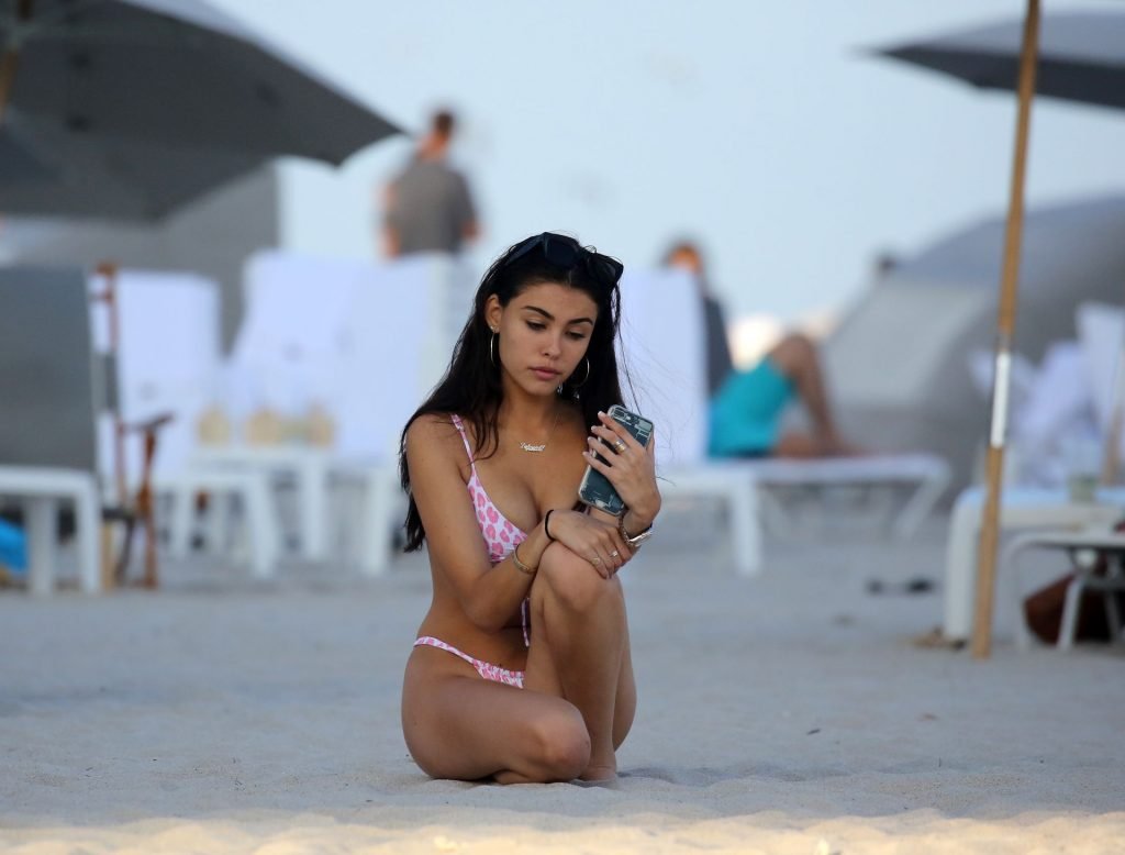 Мэдисон Бир демонстрирует свое потрясающее тело на пляже в Майами, 21.11.2018. 19-летняя американская певица была в крошечном бело-розовом бикини.
