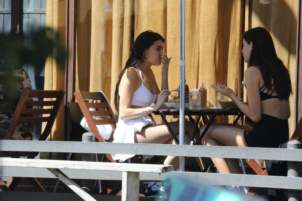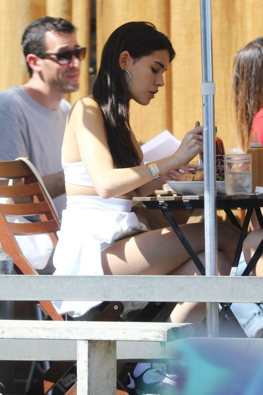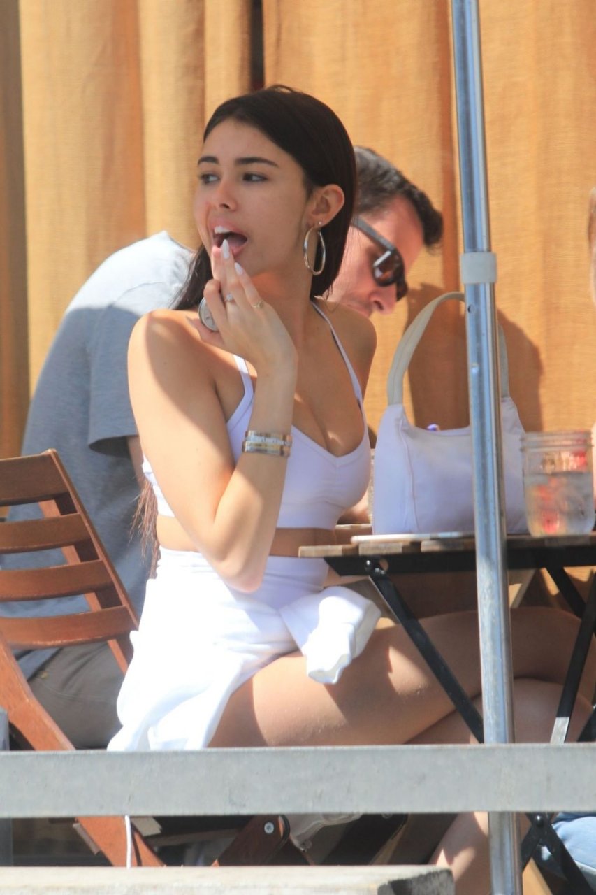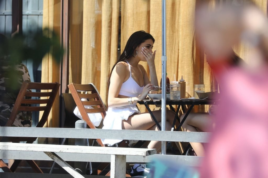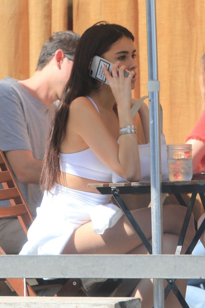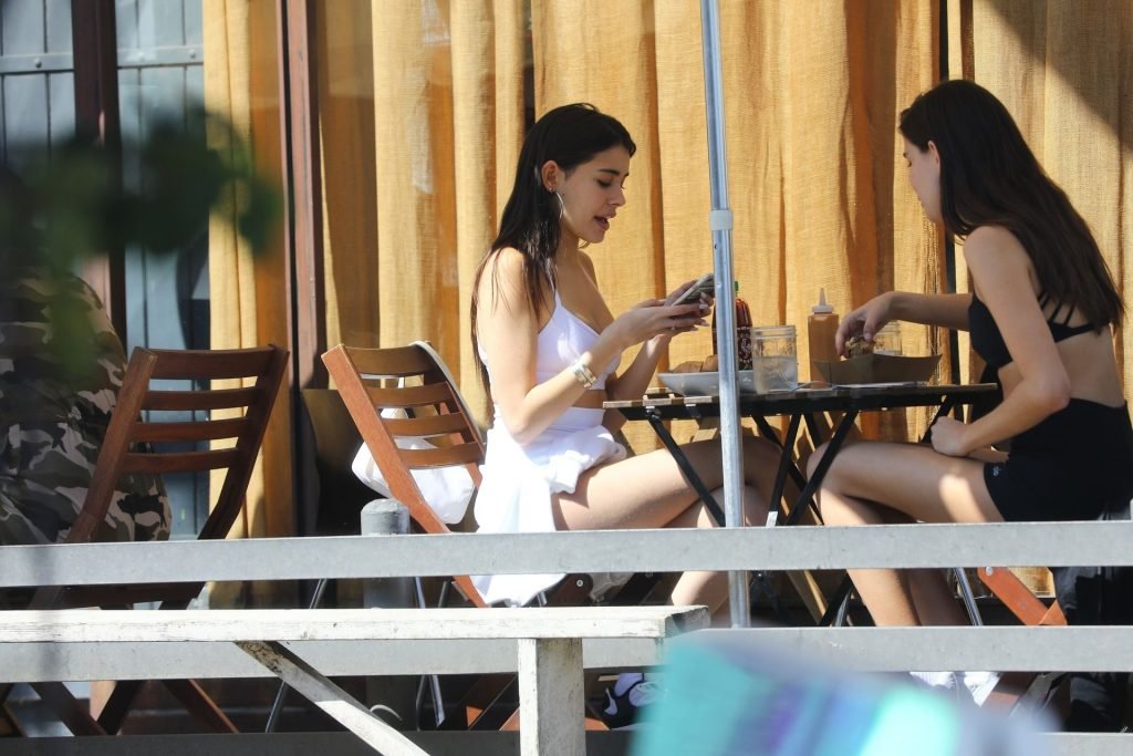 Мэдисон Бир демонстрирует свою стройную фигуру в белых коротких шортах и подходящем кроп-топе, пока она и подруга выбирают джинсы после обеда на свежем воздухе вместе в Уэст-Голливуде, 18.03.2019.