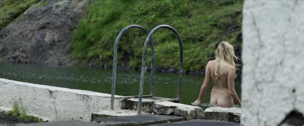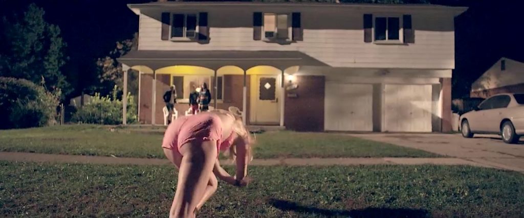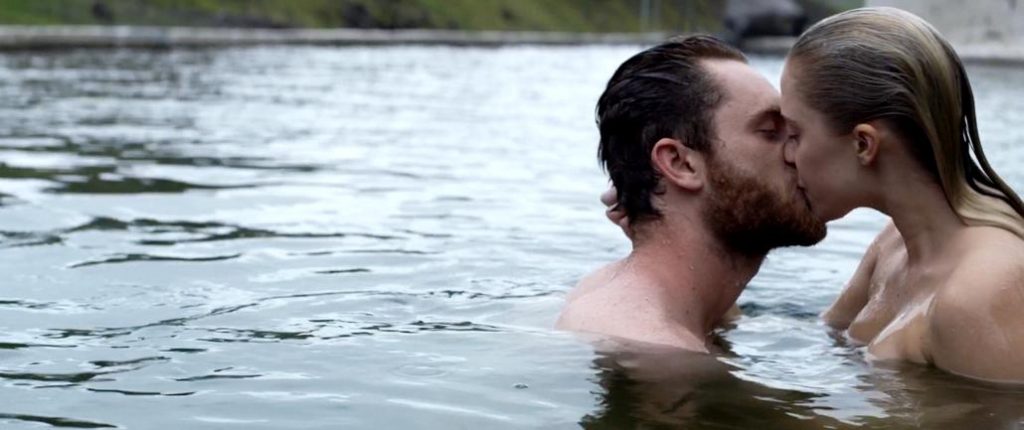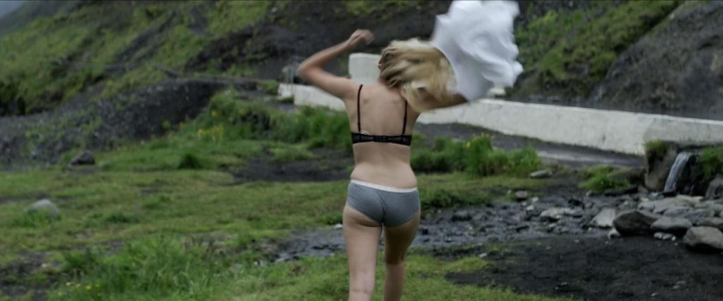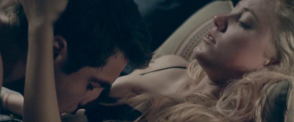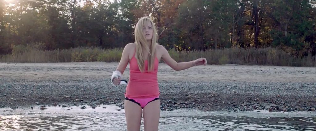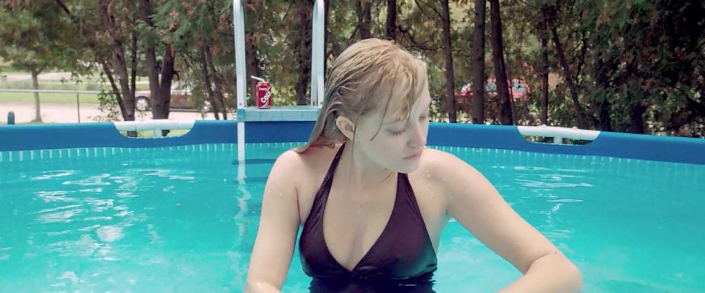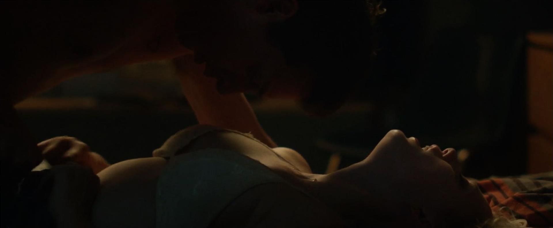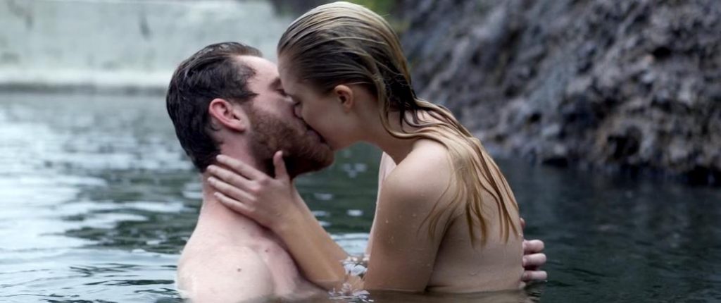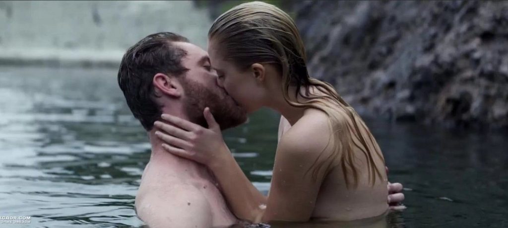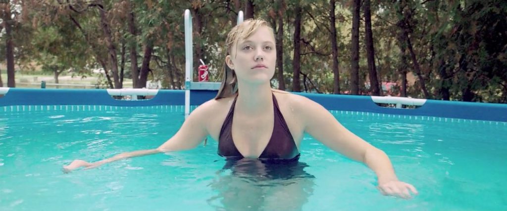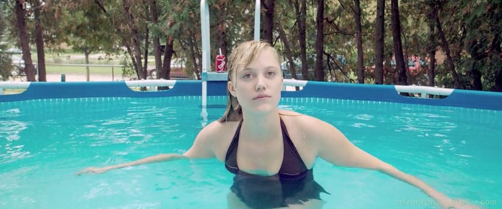Maika Monroe is pulling a dress off while walking across a patch of grass toward a pool of water. We see her underwear first, and then see her bare butt as she steps naked into the water. We then see a guy following after her and joining her in the pool, Maika showing cleavage as she makes out with him.