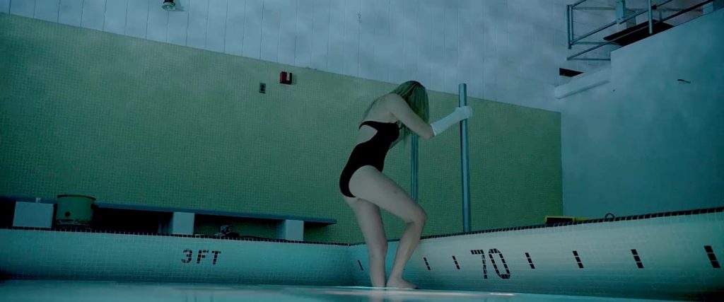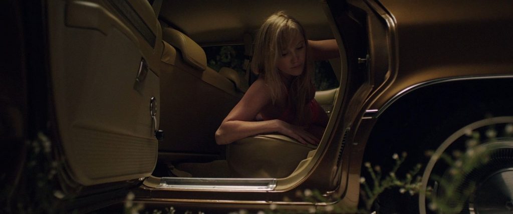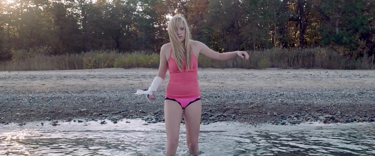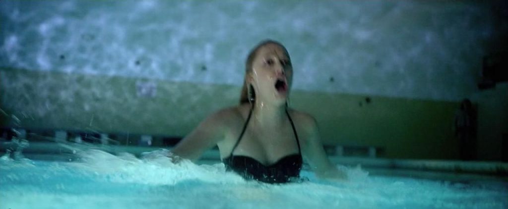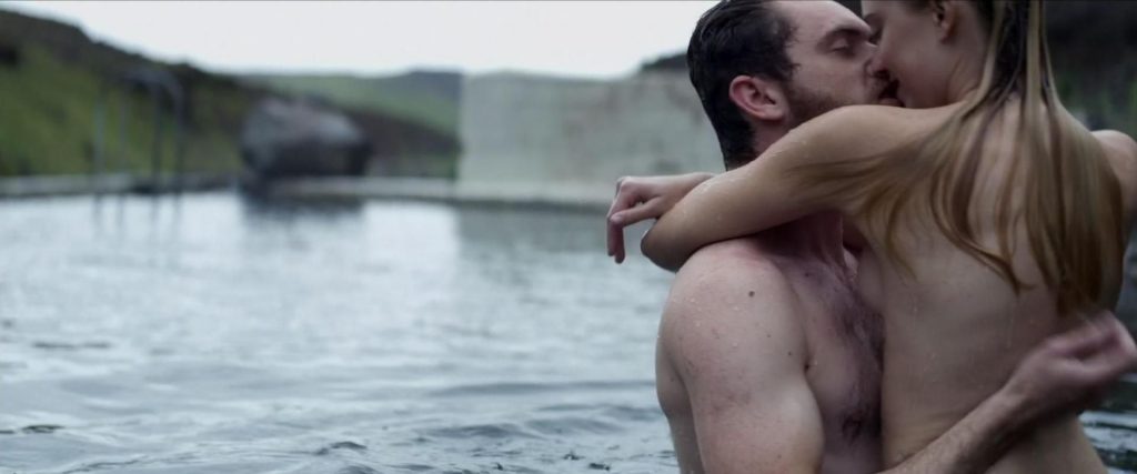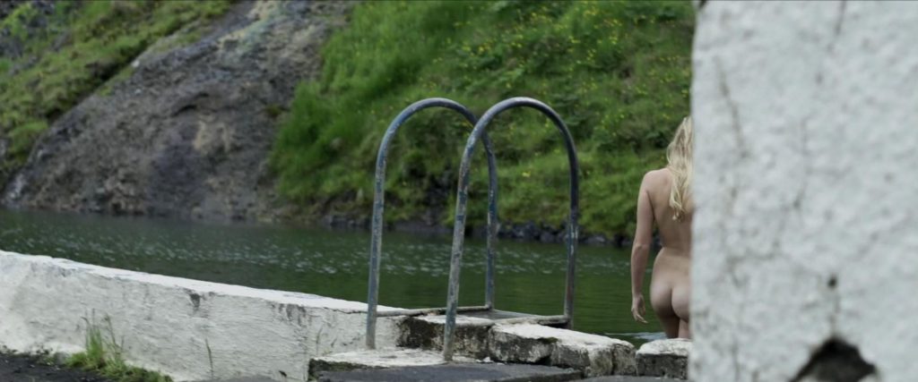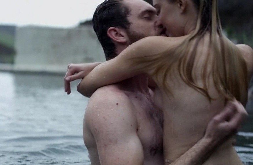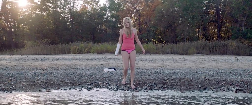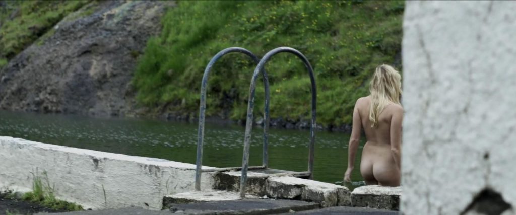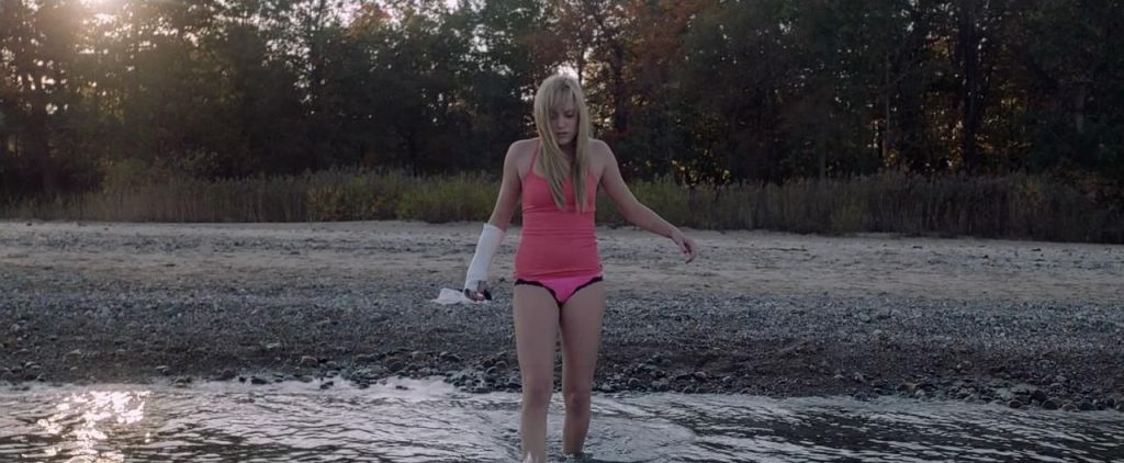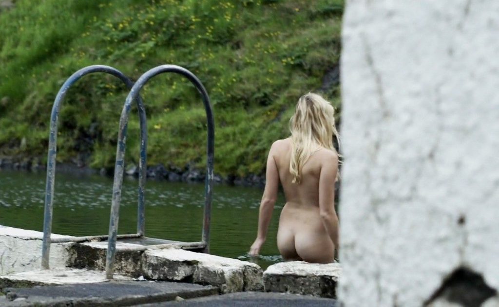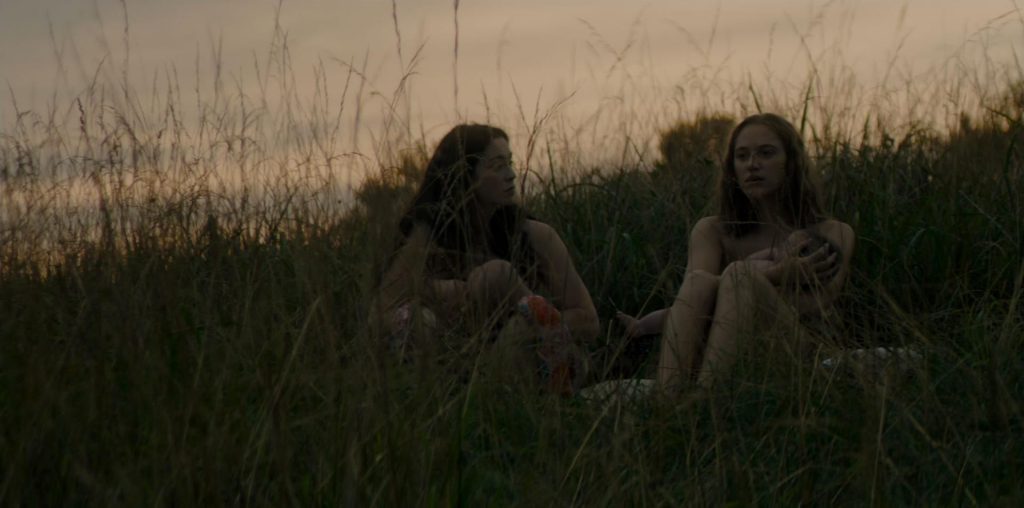 Maika Monroe is pulling a dress off while walking across a patch of grass toward a pool of water. We see her underwear first, and then see her bare butt as she steps naked into the water. We then see a guy following after her and joining her in the pool, Maika showing cleavage as she makes out with him.