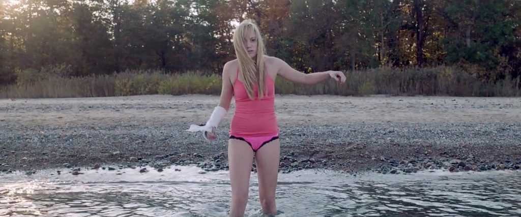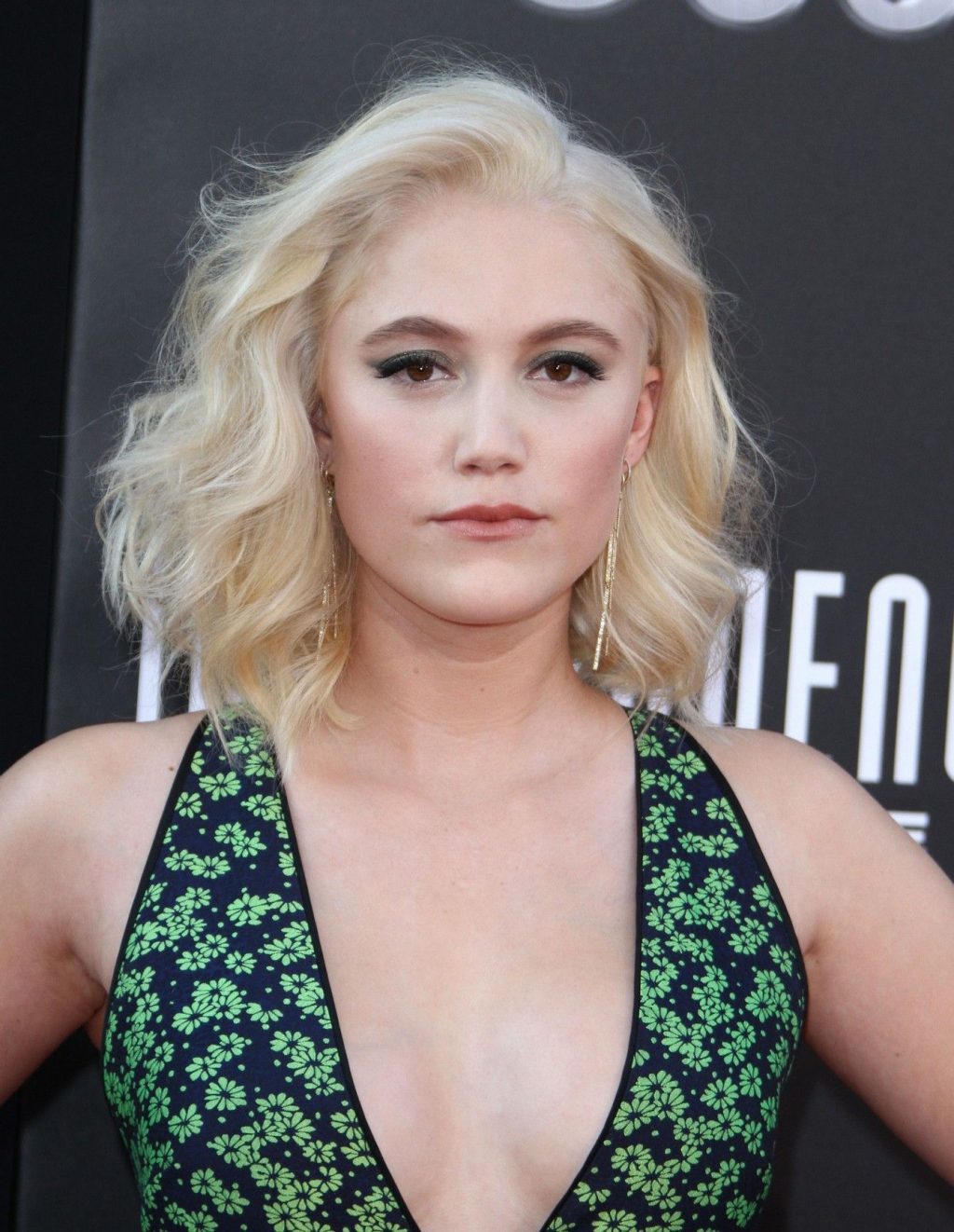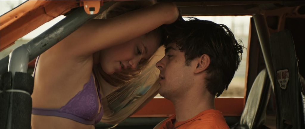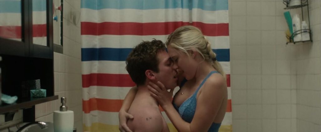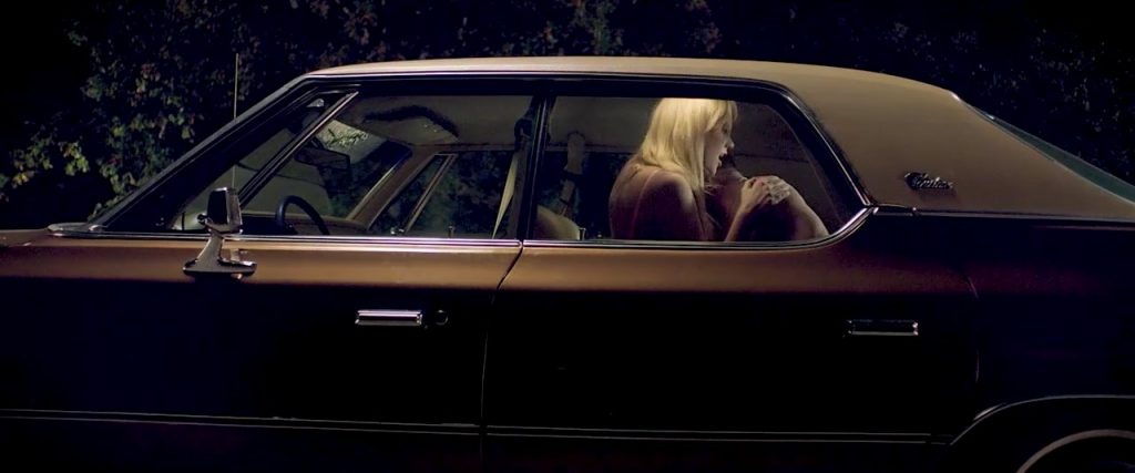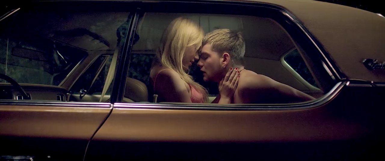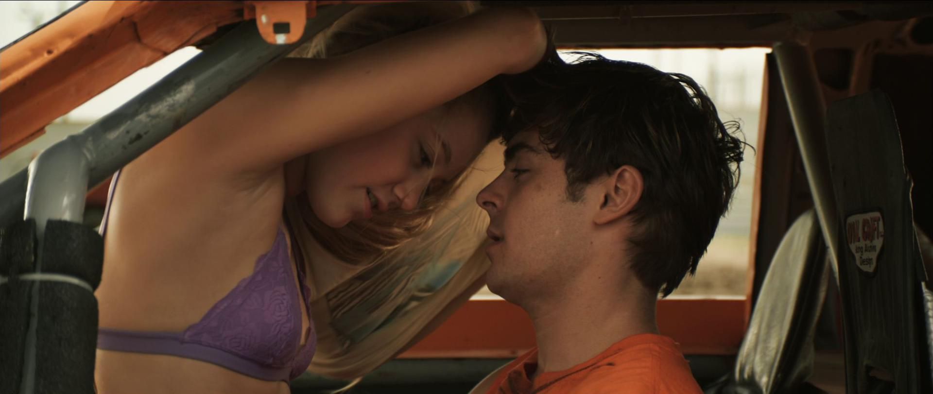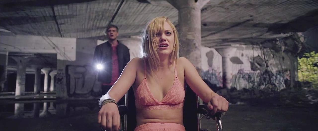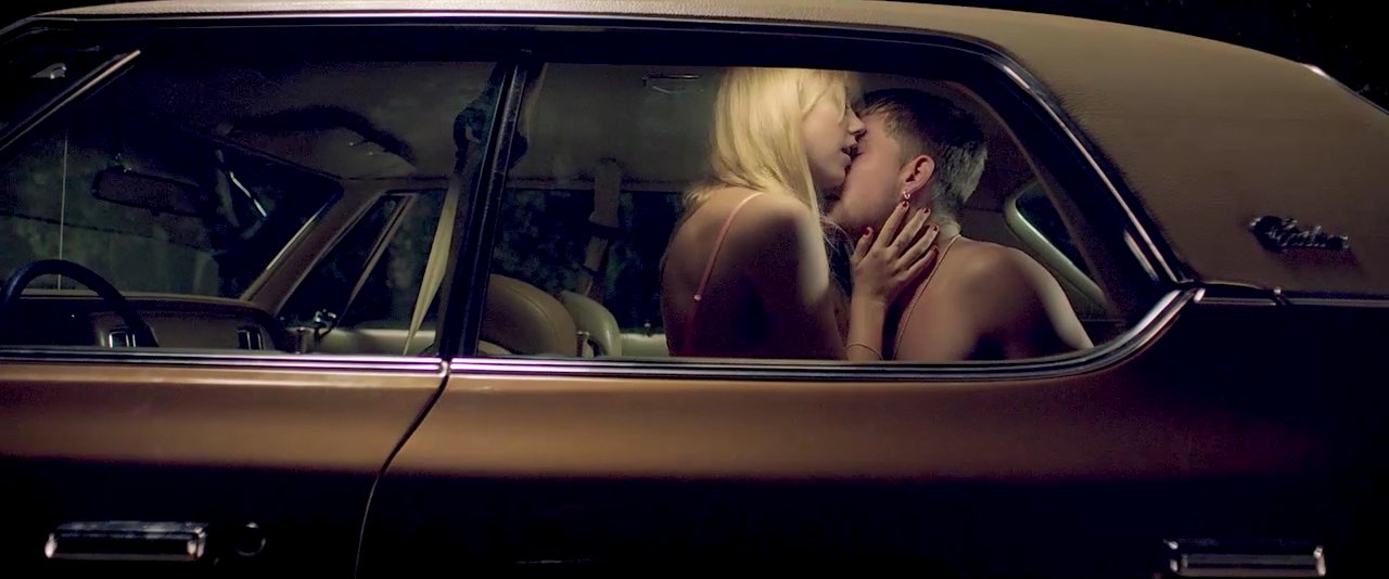 Maika Monroe is pulling a dress off while walking across a patch of grass toward a pool of water. We see her underwear first, and then see her bare butt as she steps naked into the water. We then see a guy following after her and joining her in the pool, Maika showing cleavage as she makes out with him.