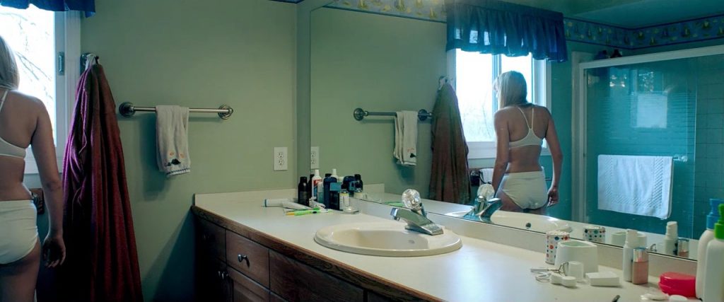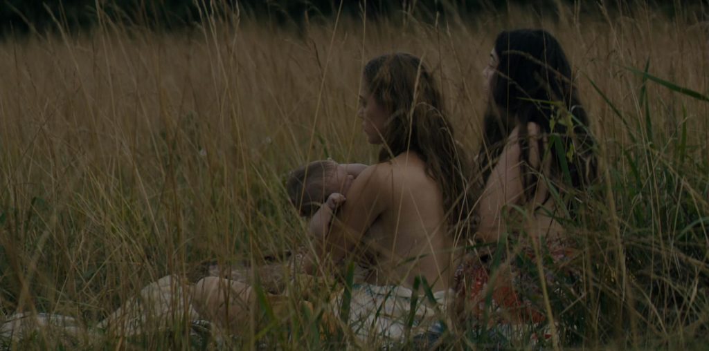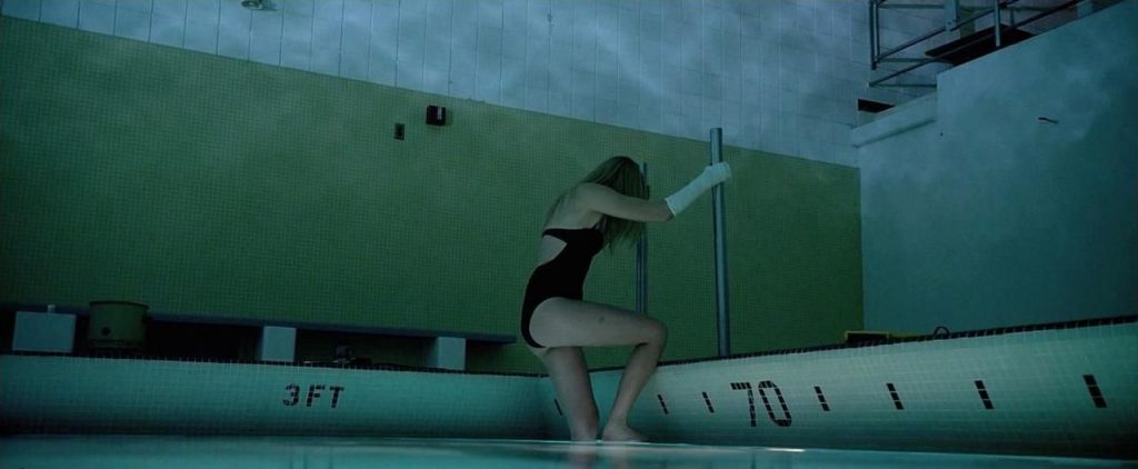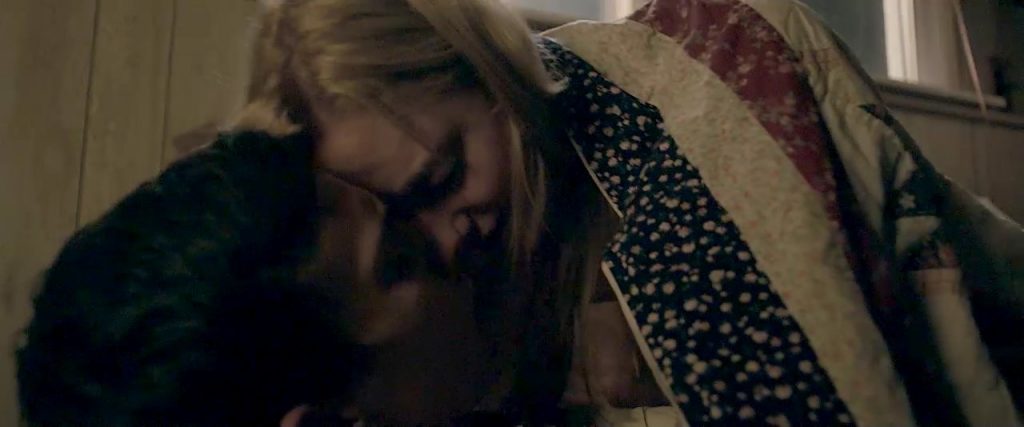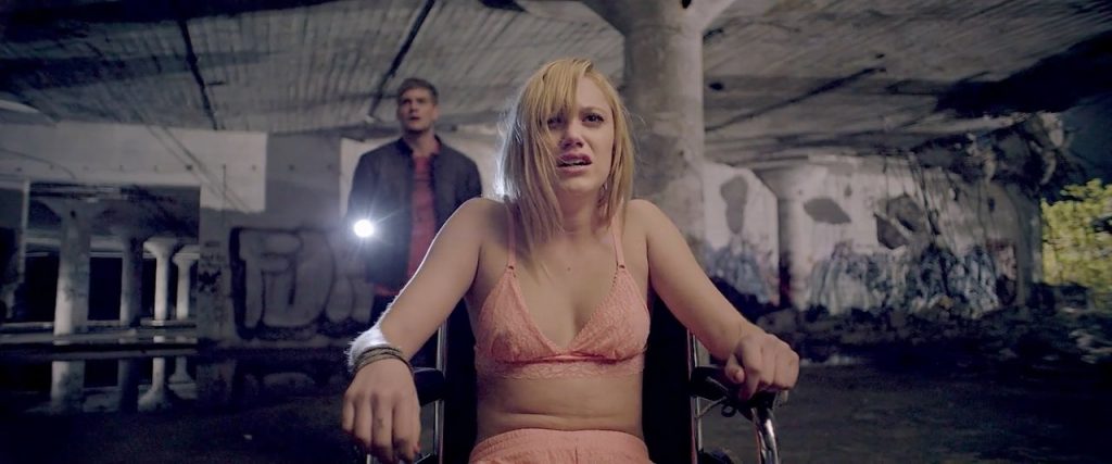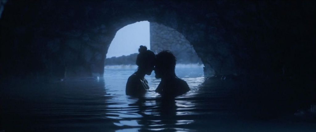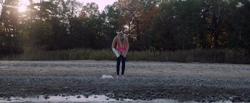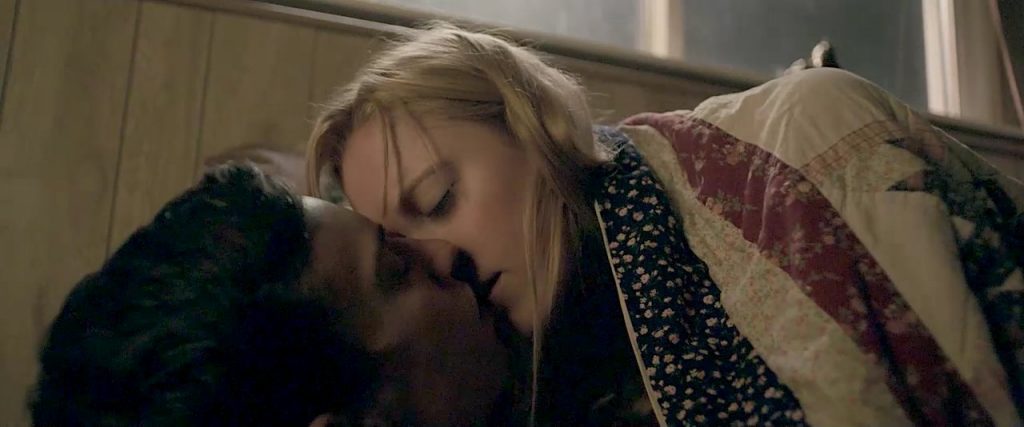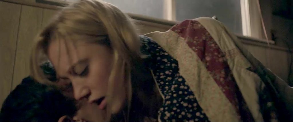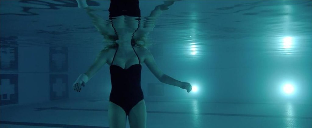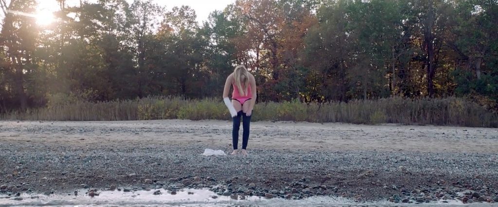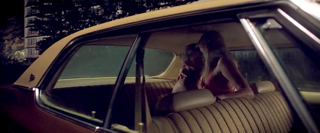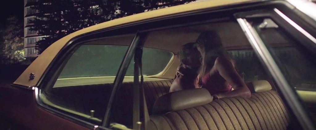 Maika Monroe is pulling a dress off while walking across a patch of grass toward a pool of water. We see her underwear first, and then see her bare butt as she steps naked into the water. We then see a guy following after her and joining her in the pool, Maika showing cleavage as she makes out with him.