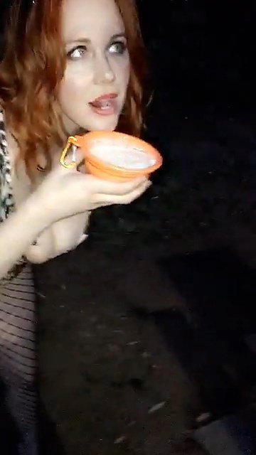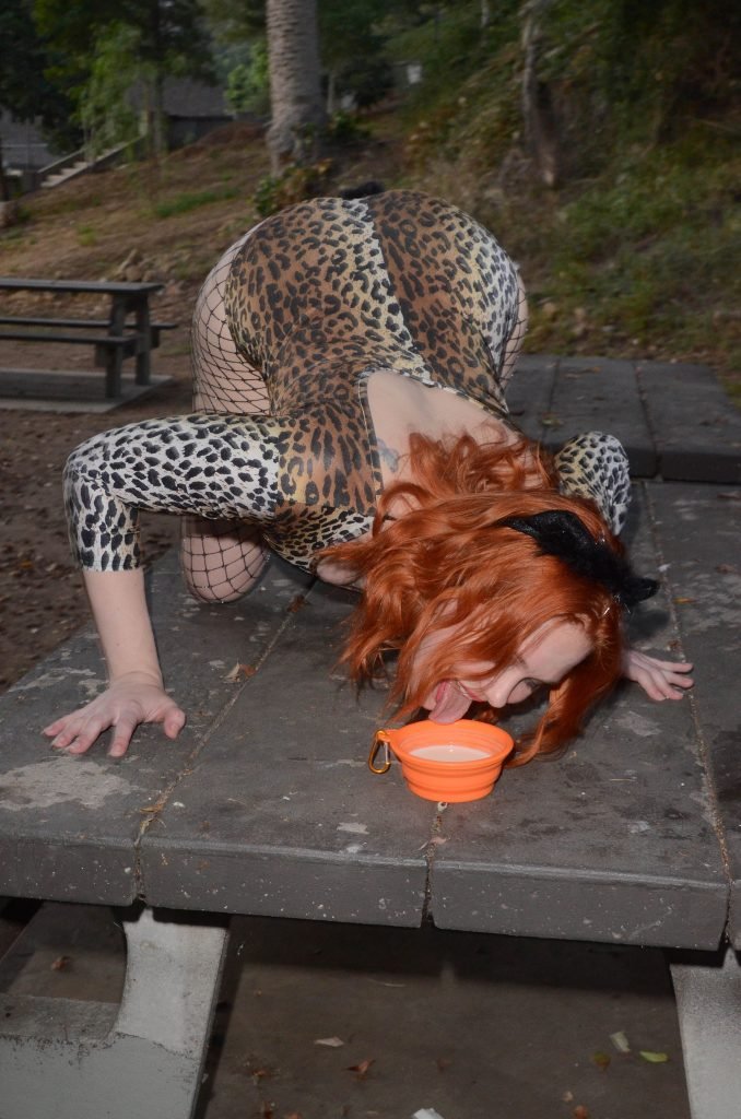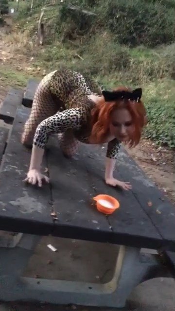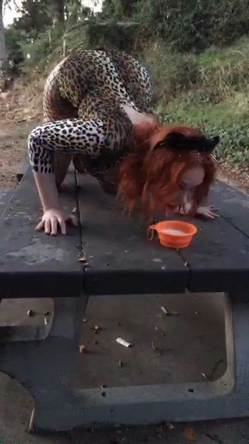 40 лет, пьёт молоко из грязной миски на парковой пикниковой скамейке, одетая в кошачий костюм из магазина за доллар.