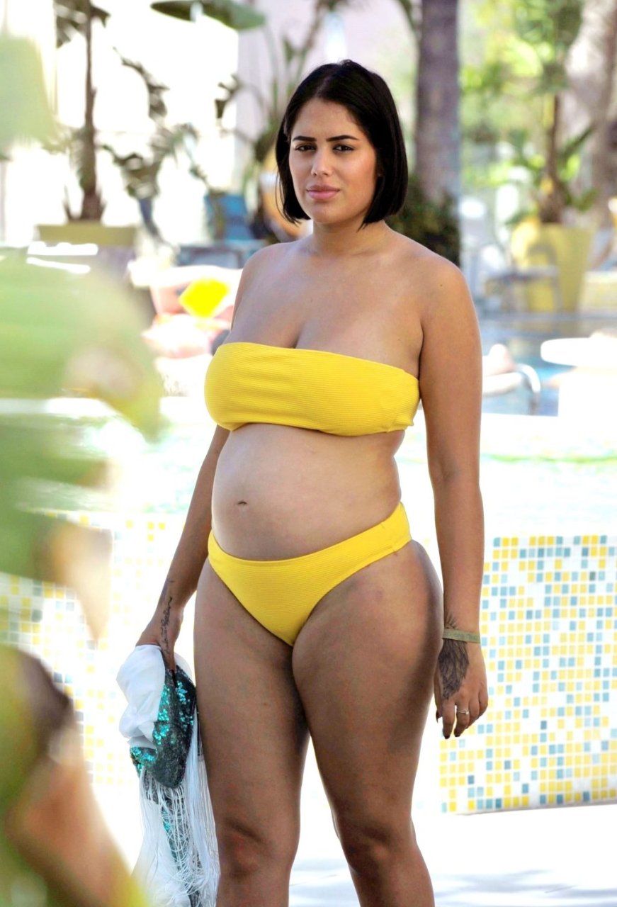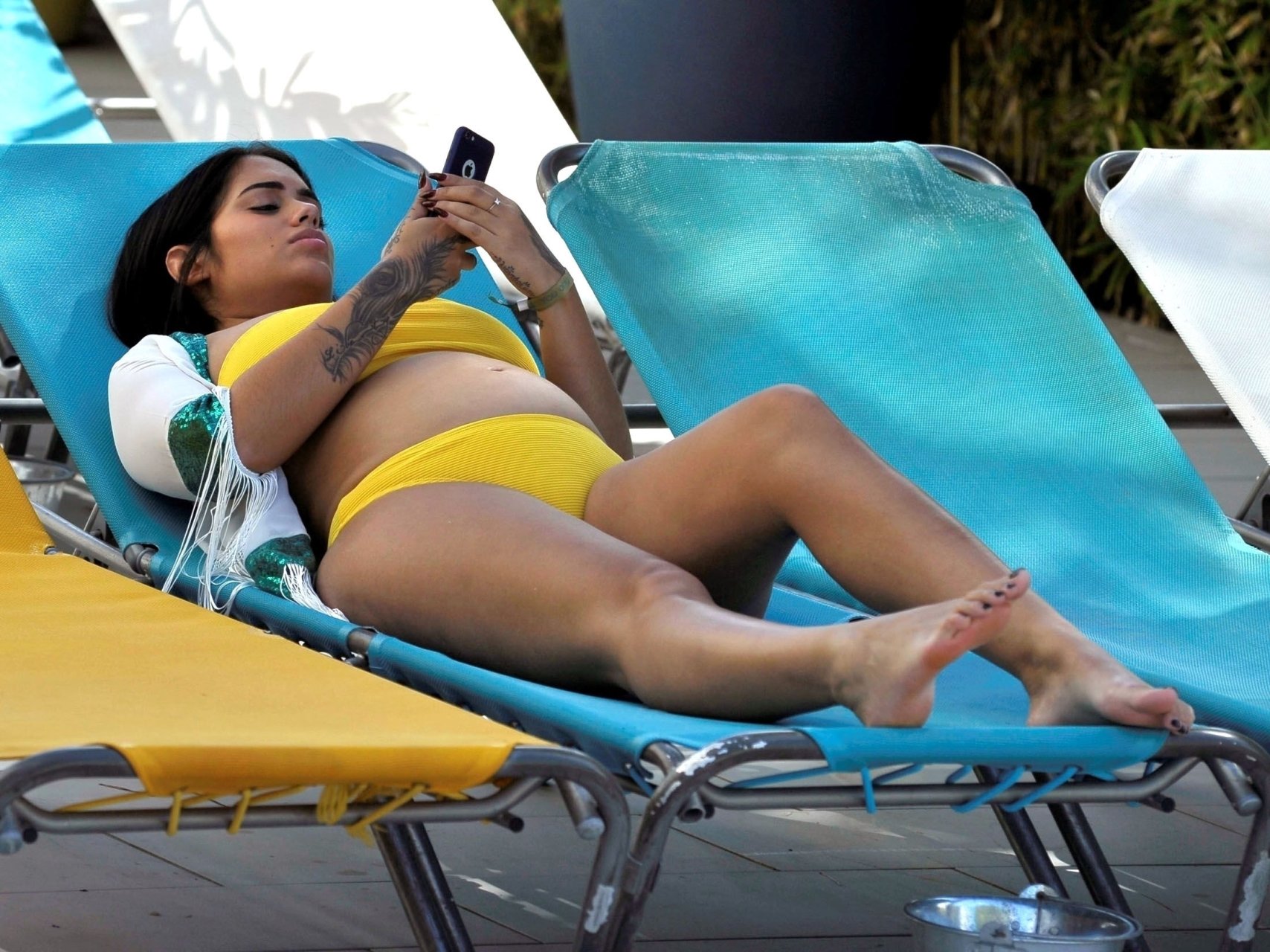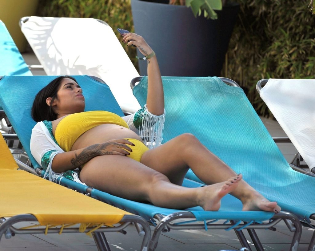 Беременная звезда шоу Love Island Малин Андерссон демонстрирует свой животик в ярко-желтом бикини во время солнечного отпуска, наслаждаясь днем у бассейна в Испании, 22.10.2018.