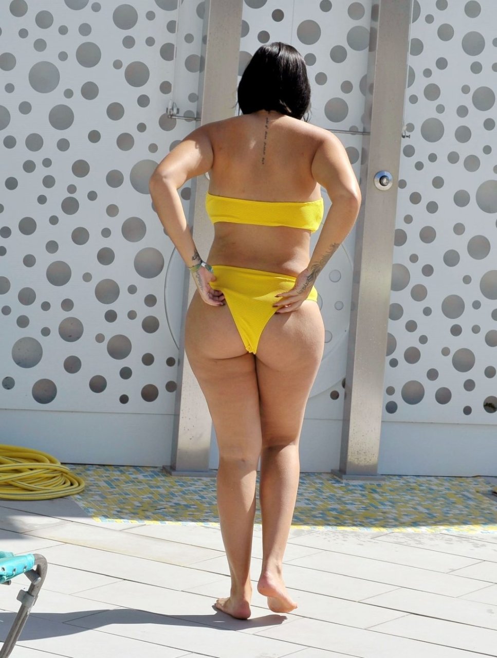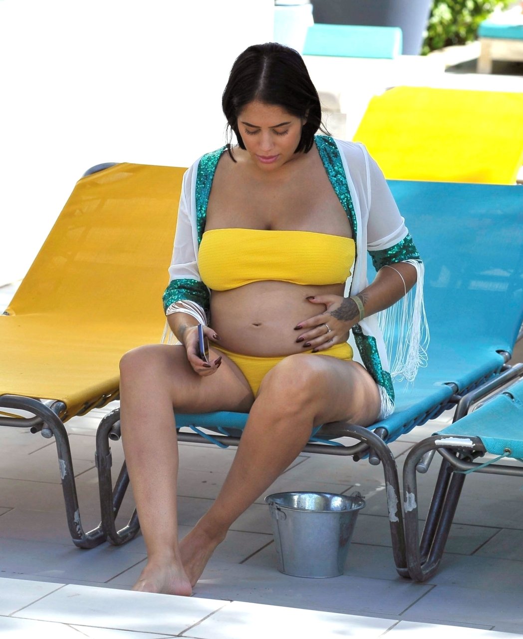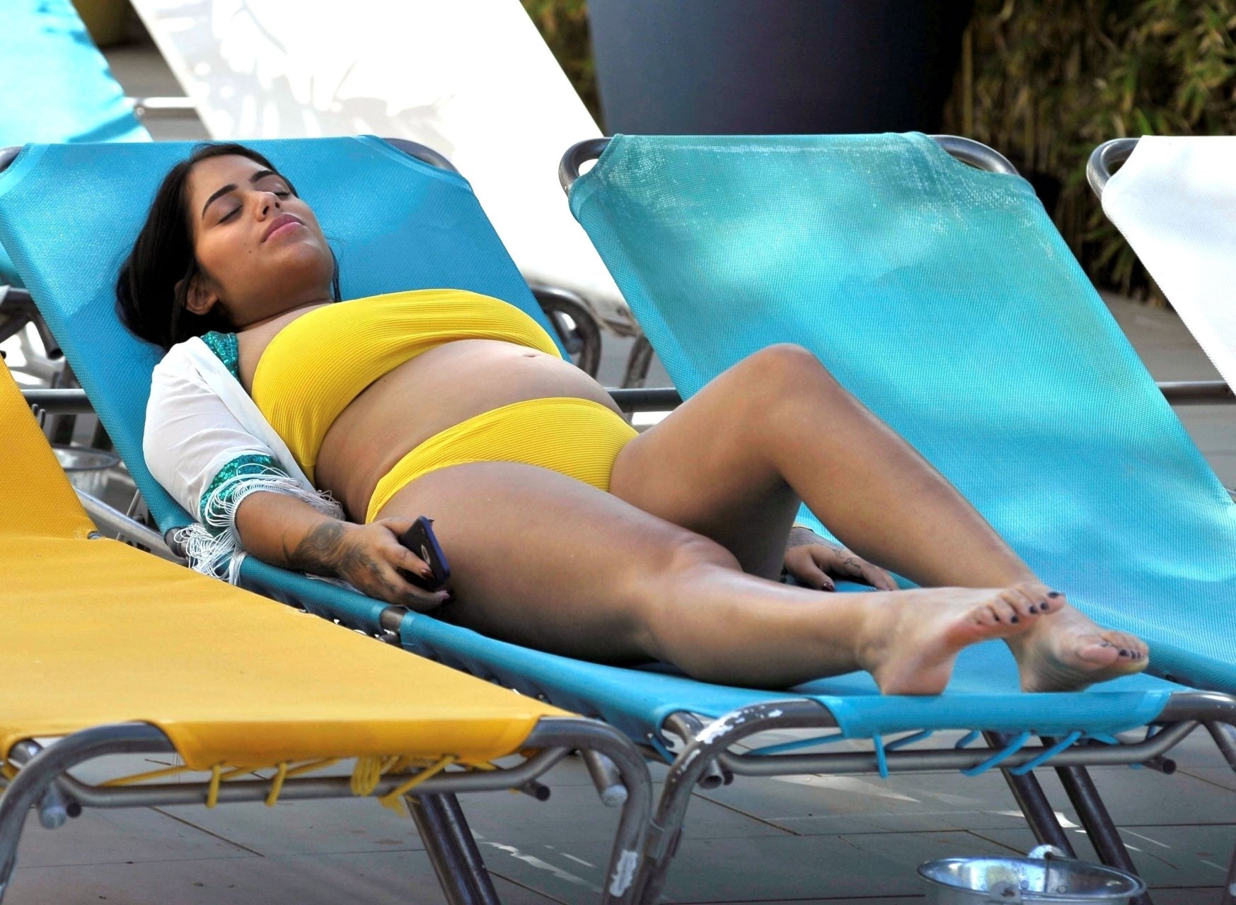 Беременная звезда шоу Love Island Малин Андерссон демонстрирует свой животик в ярко-желтом бикини во время солнечного отпуска, наслаждаясь днем у бассейна в Испании, 22.10.2018.