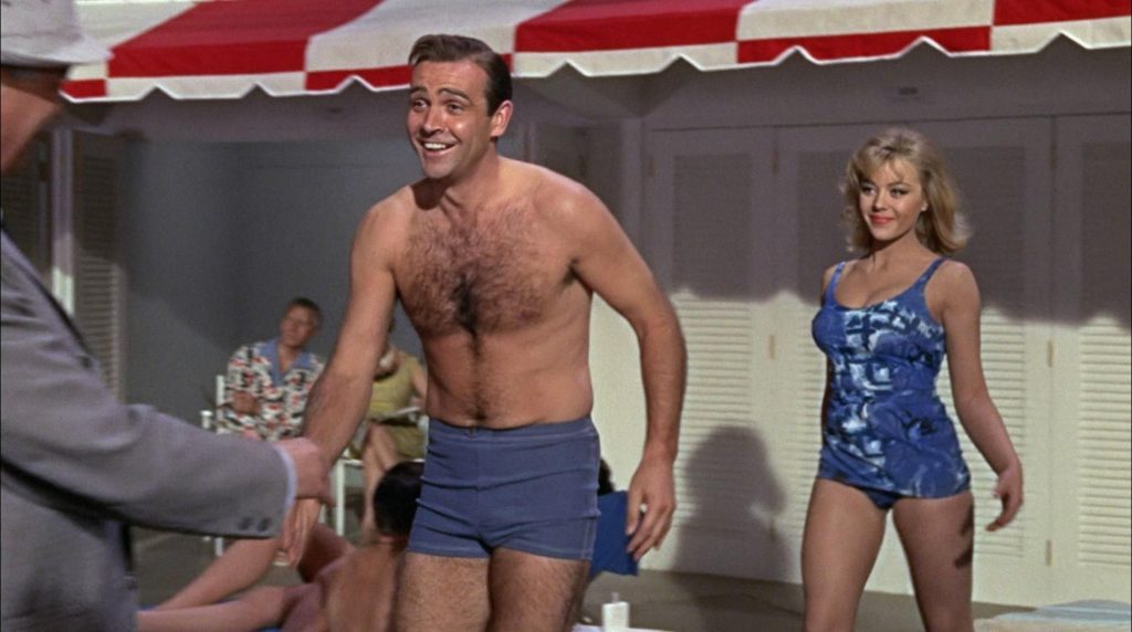 И она была девушкой, покрытой золотой краской, на которую проецировали видео в титульной последовательности, но она НЕ была мёртвой девушкой, покрытой золотой краской, в отеле. Это была Ширли Итон.