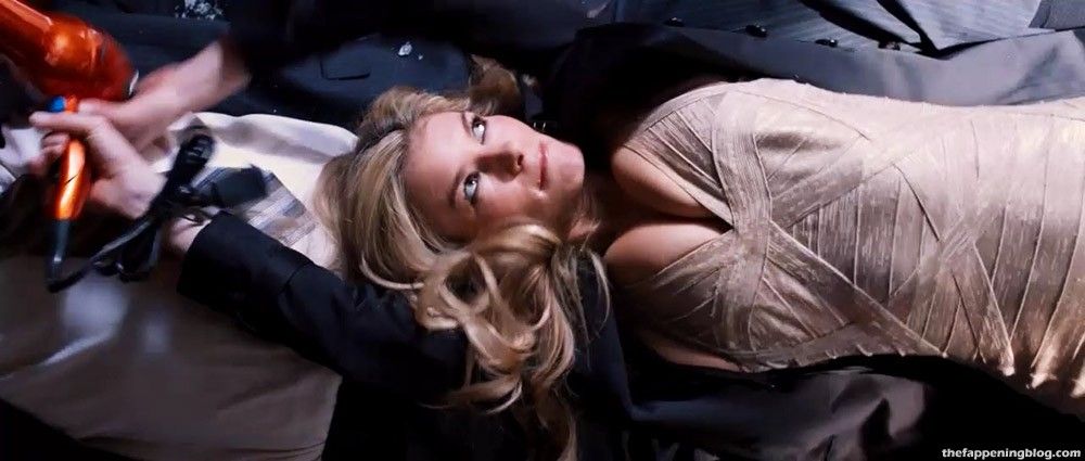 Supermodel Marisa Miller shows a lot of cleavage in a low-cut beige dress, as she’s lying on the ground. Then she grabs hold of a hairdryer which is trying to drag her away, as some guys stare down at her on the ground.
