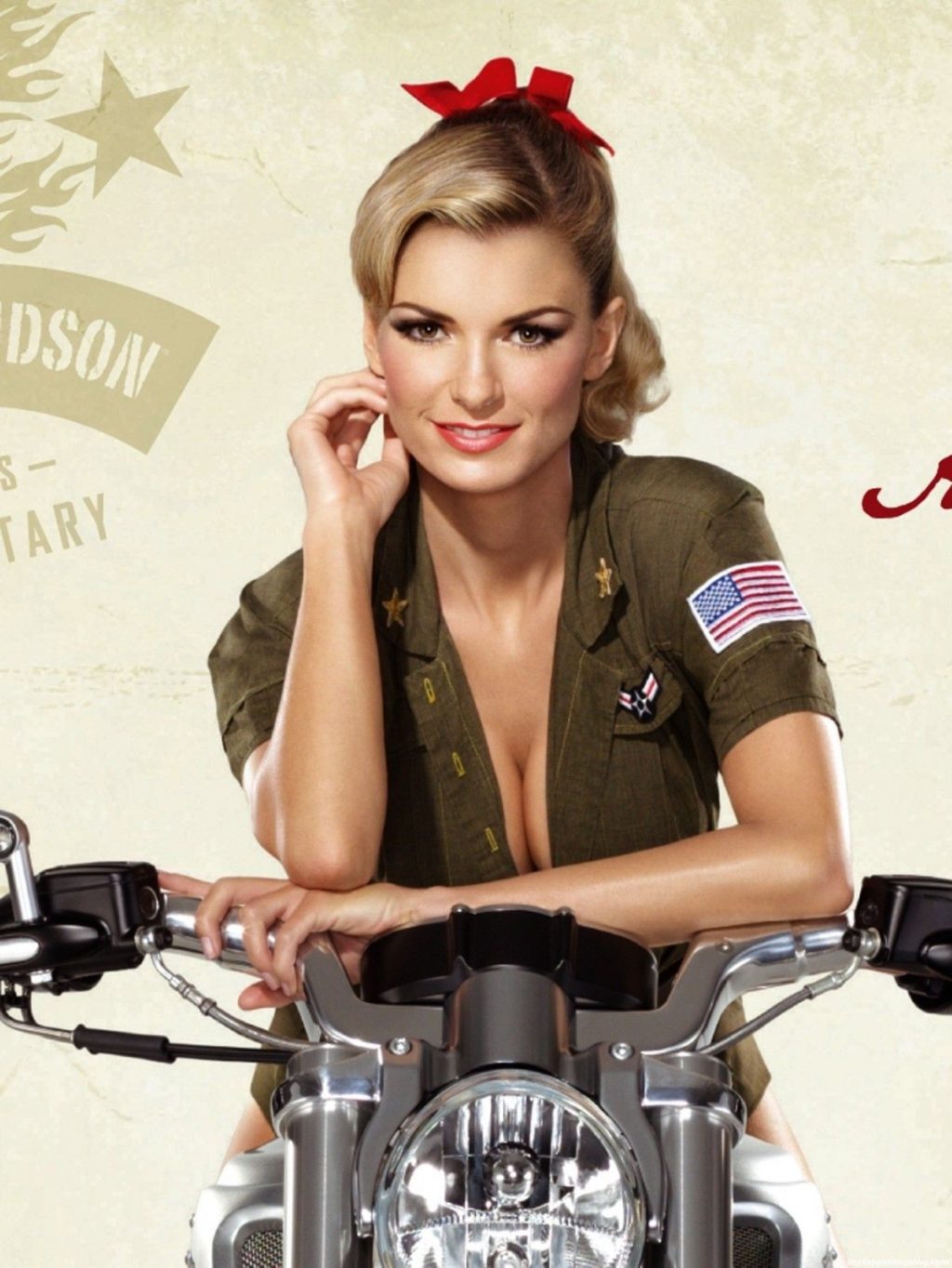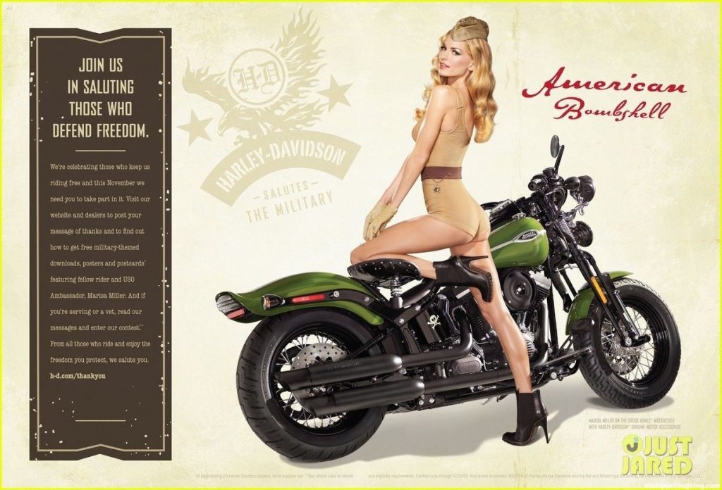 Sports Illustrated swimsuit model Marisa Miller is wearing a red bustier with black panties, a garter, and stockings. Then she poses for a photographer in front of a motorcycle before a guy walks up and interrupts him for a bit.