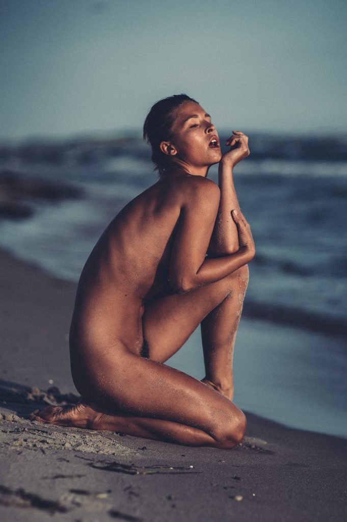 Обнажённая модель, фотограф и тревел-блогер Marisa Papen показала своё загорелое тело на пляже в фотосессии Томаса Агатца в Дании (июль 2018).