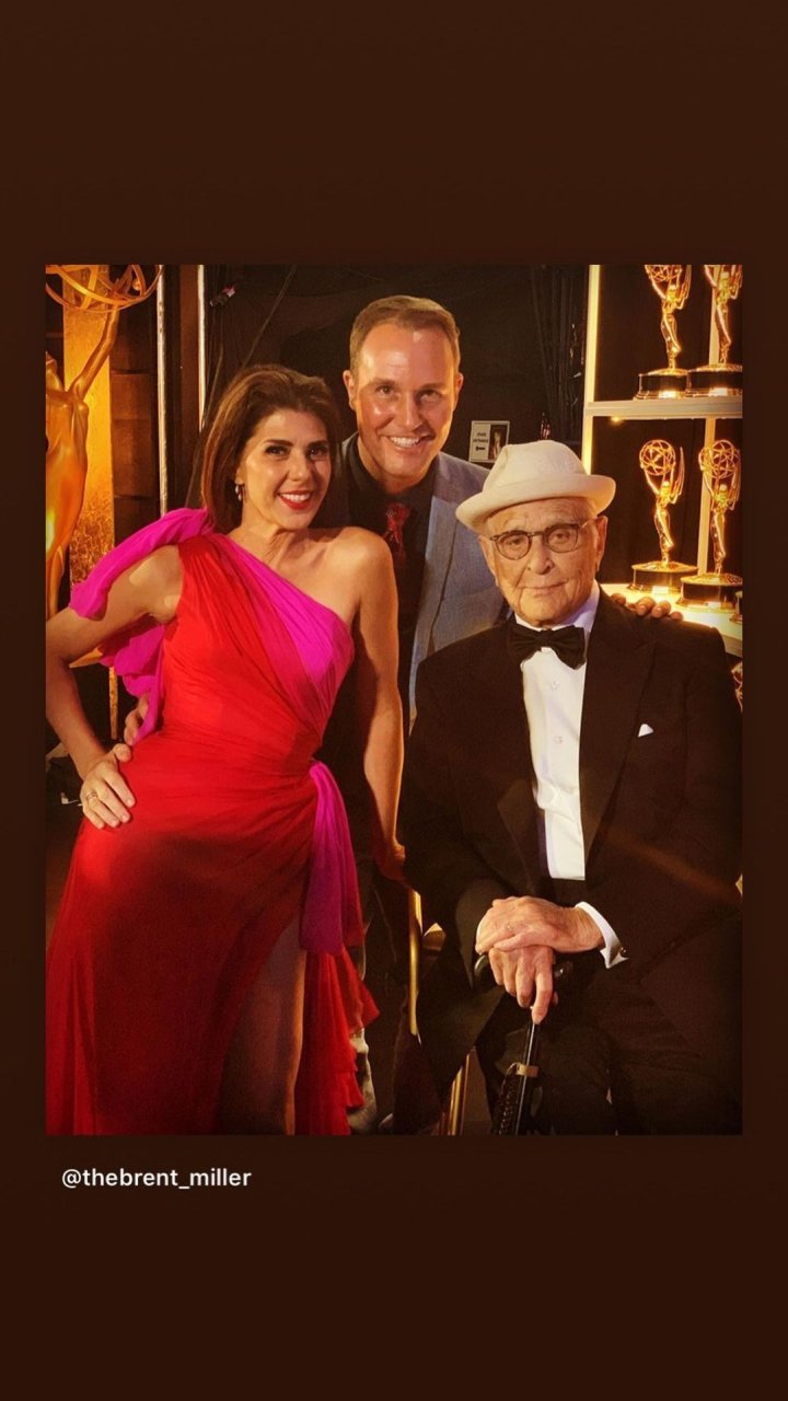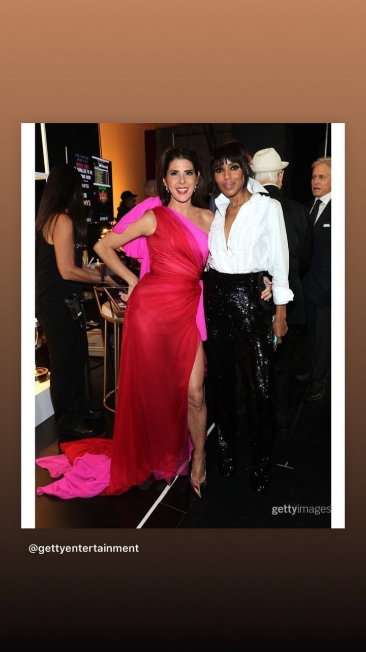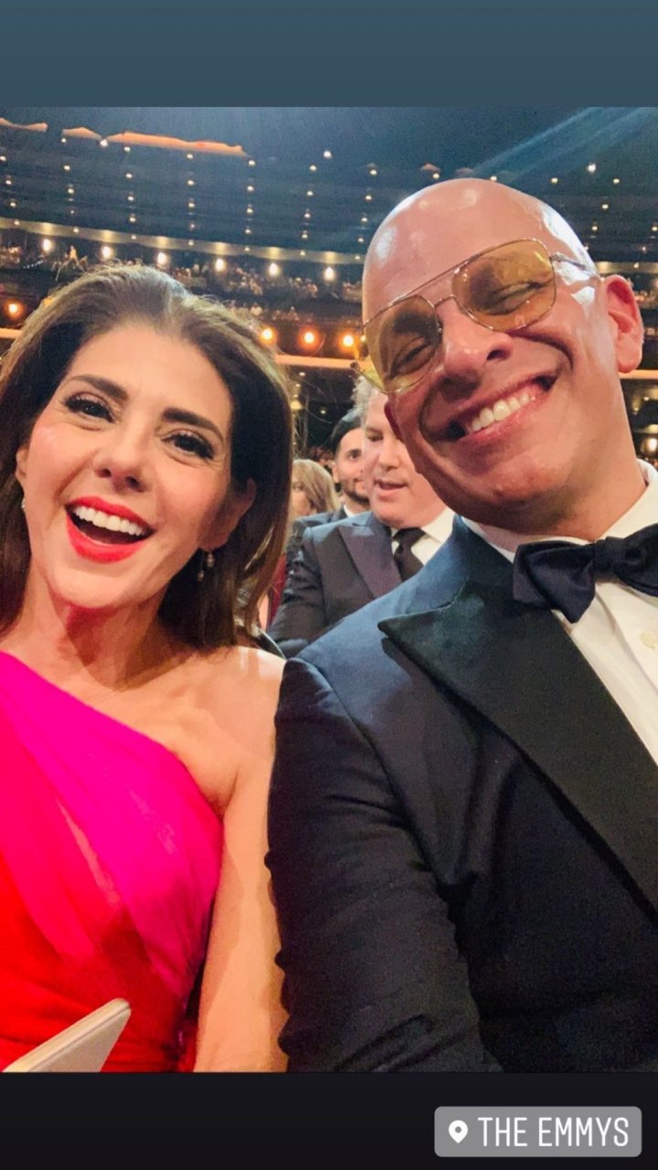 Дизайнеры снова повторили красно-розовый стиль. 54-летняя американская актриса, обладательница Оскара Мариса Томей была сфотографирована с Марком Субиасом и другими знаменитостями на 71-й церемонии вручения премии Primetime Emmy в Лос-Анджелесе, 22.09.2019.