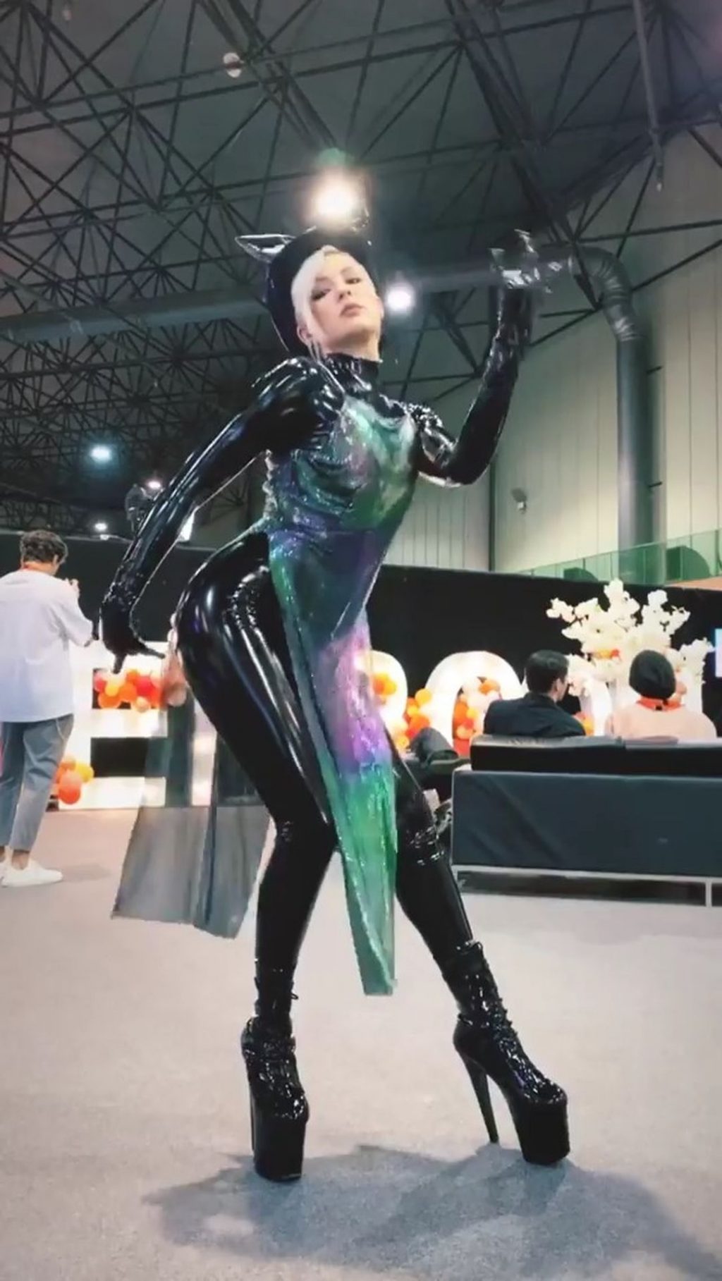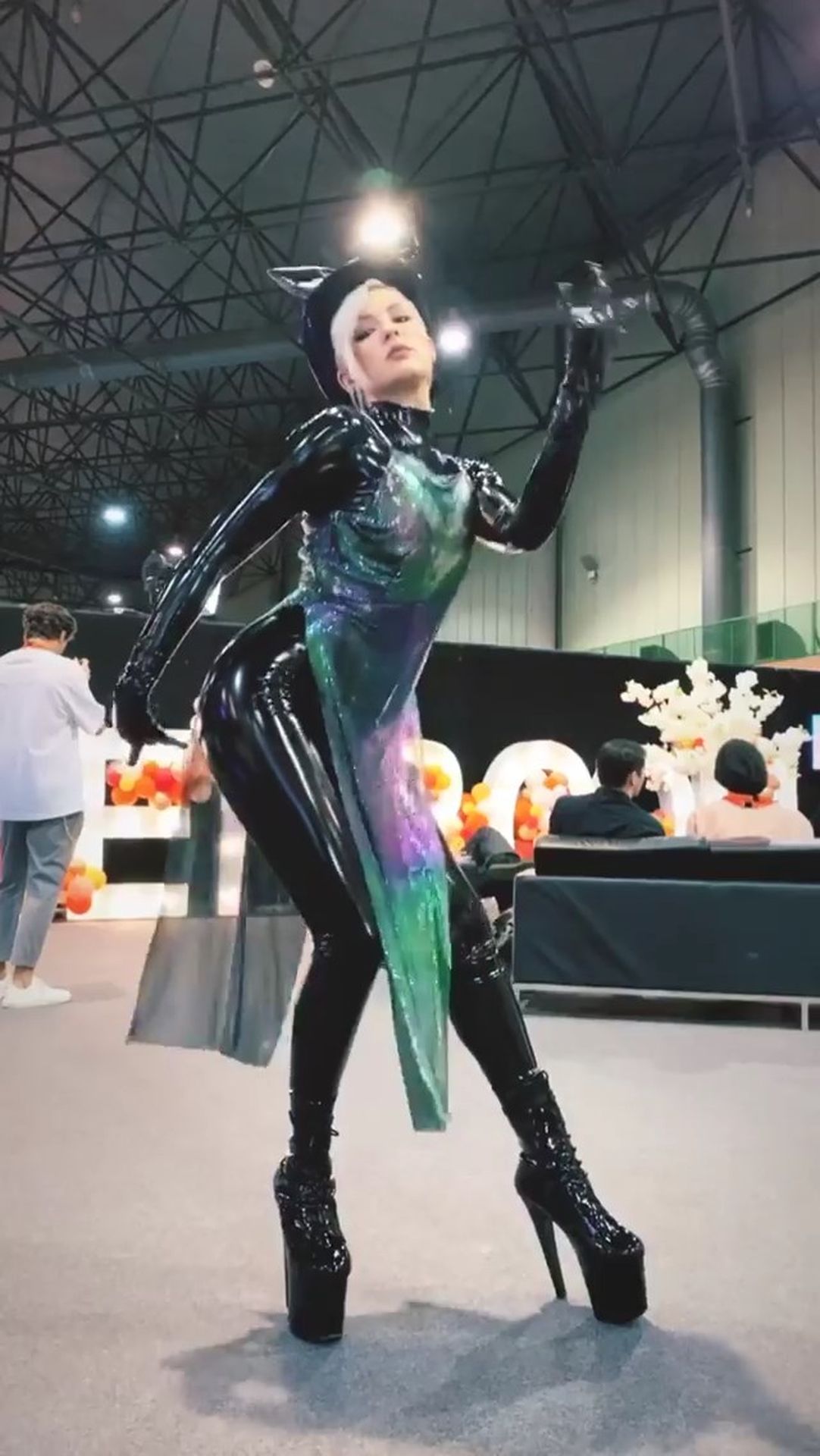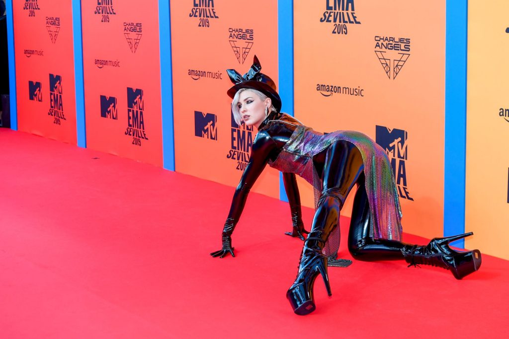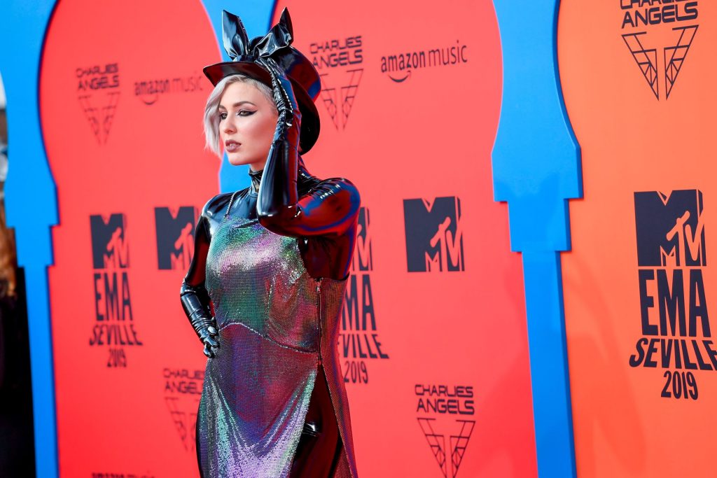 Maruv позирует в горячем латексном наряде на красной дорожке при прибытии на MTV Europe Music Awards в Конференц- и выставочном центре FIBES в Севилье 3 ноября 2019 года. MARUV (Maruv; настоящее имя Анна Корсун) — 27-летняя украинская певица, композитор и продюсер.