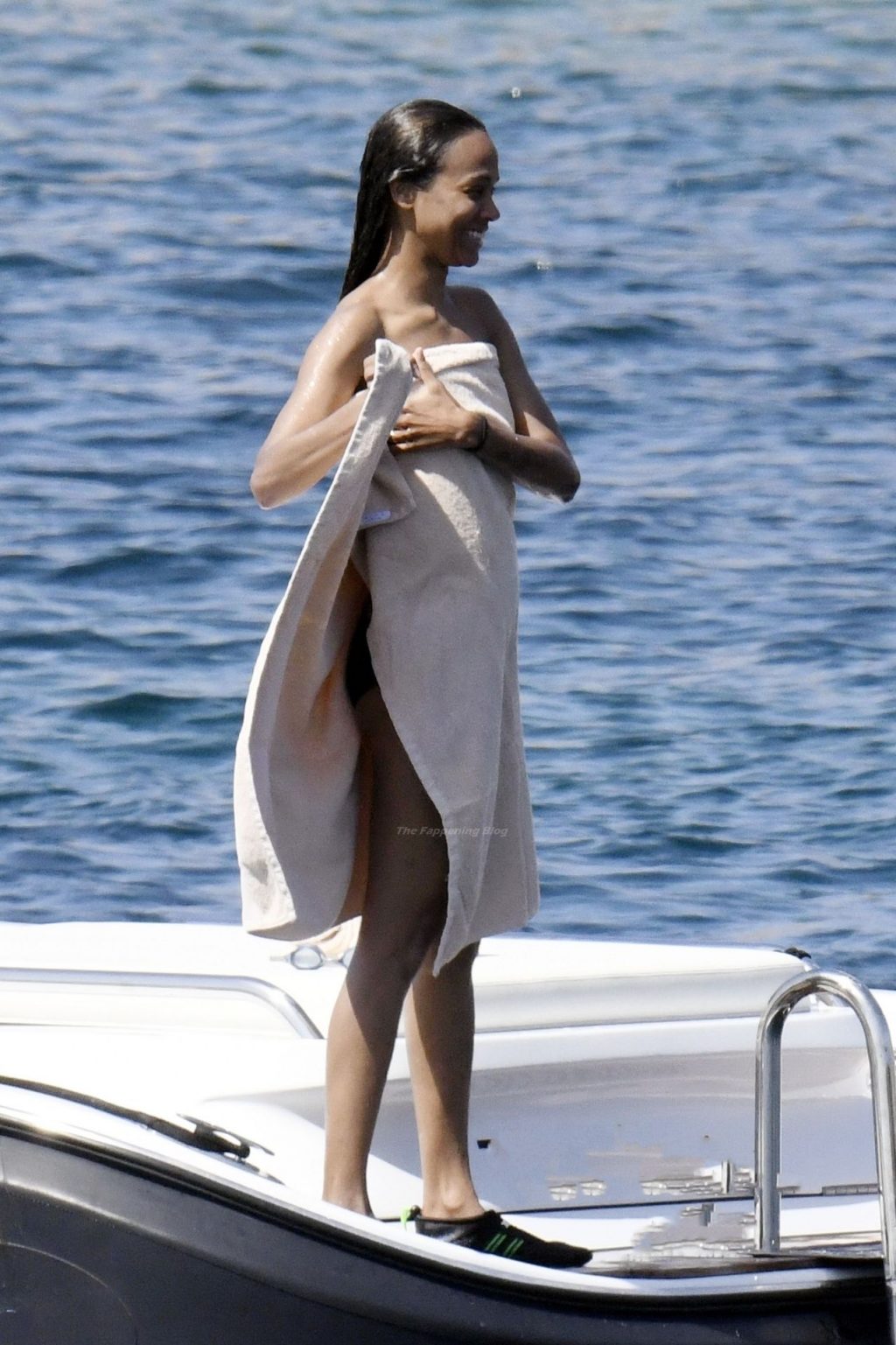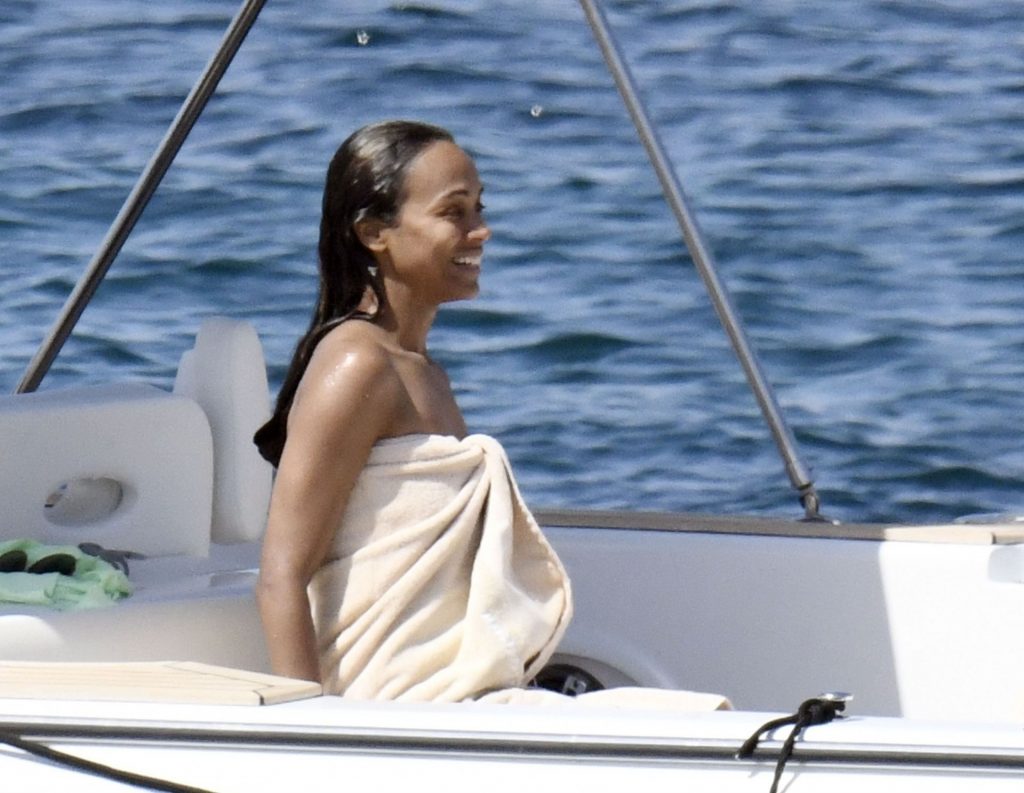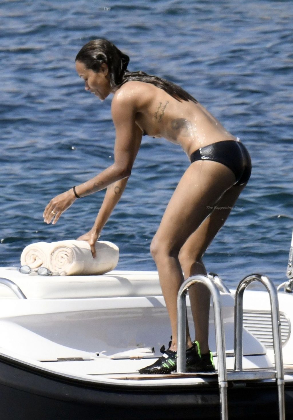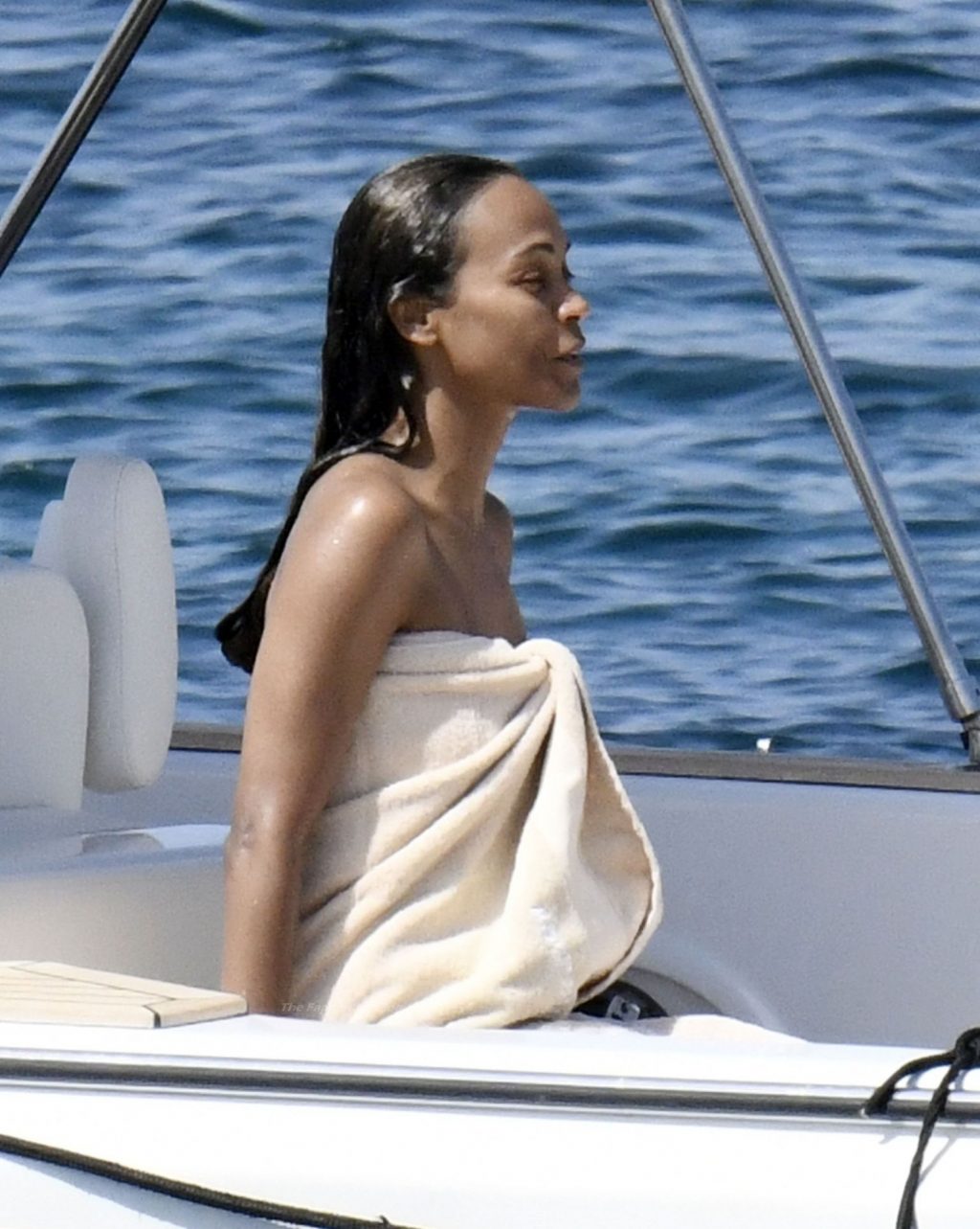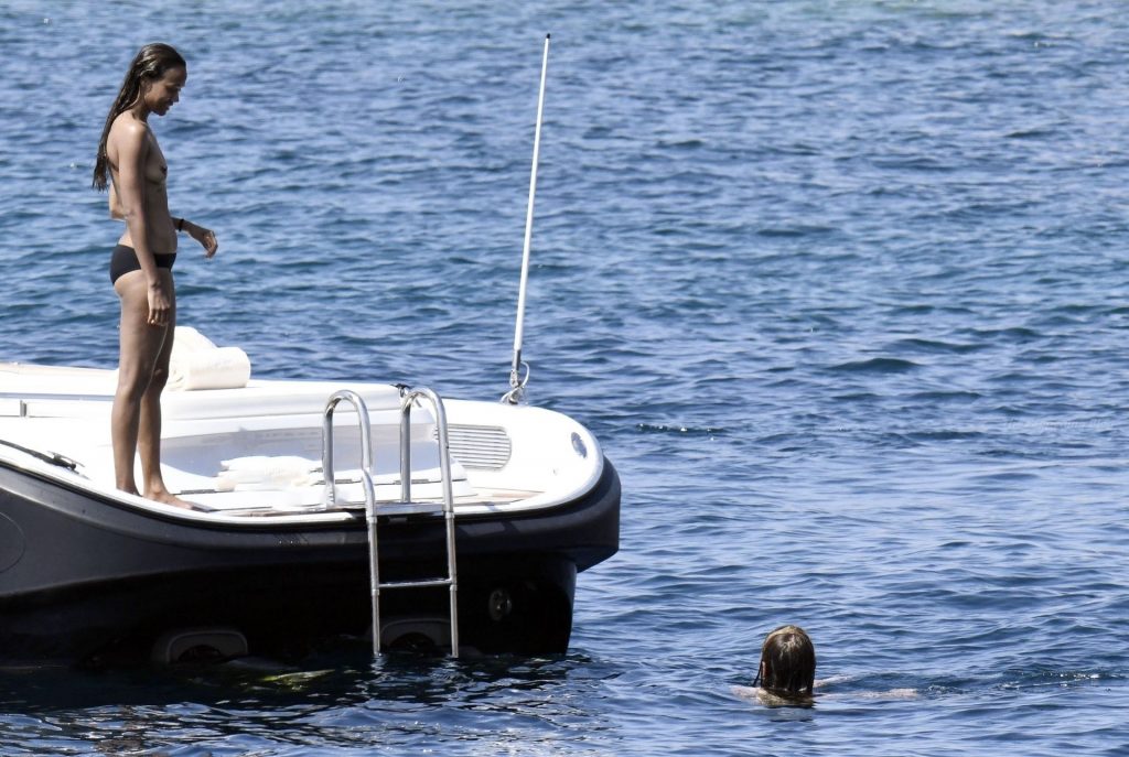 Сексуальная американская актриса Зои Салдана загорает топлесс под жарким итальянским солнцем во время своего солнечного отпуска на Сардинии, 15.08.2021.