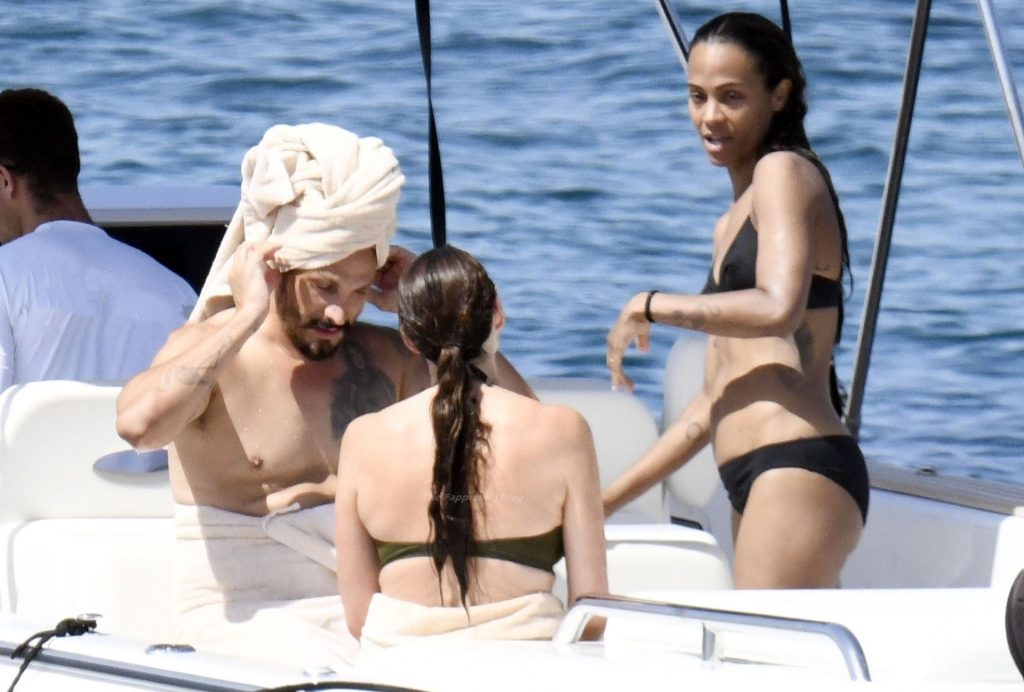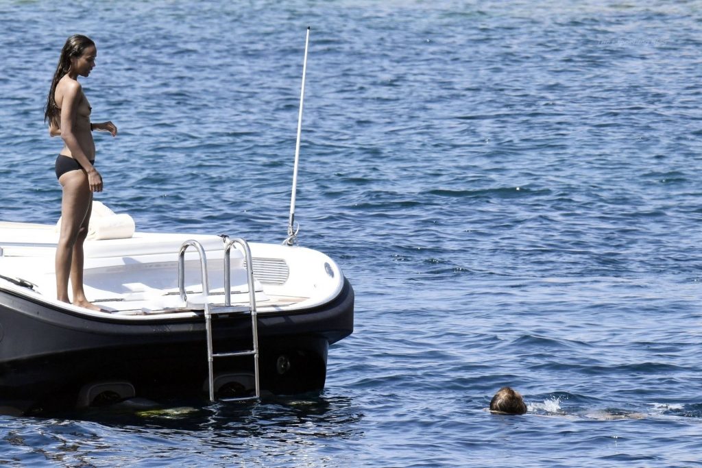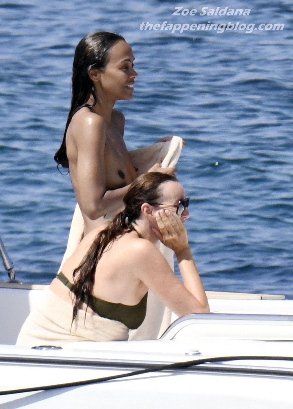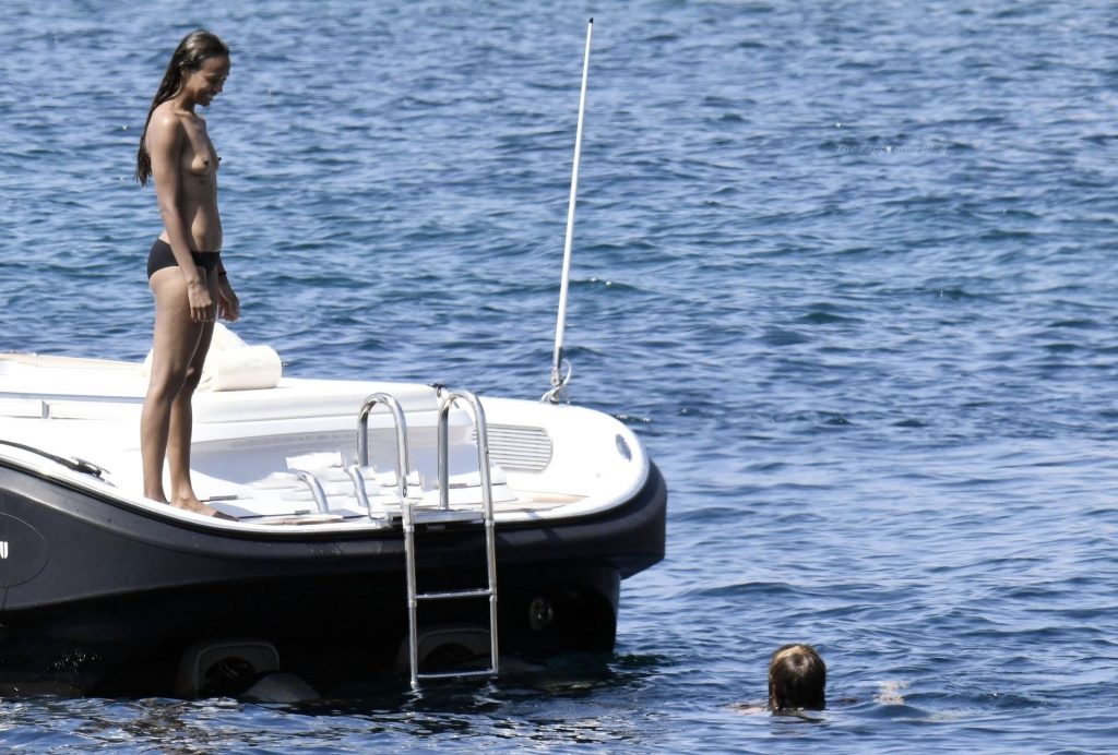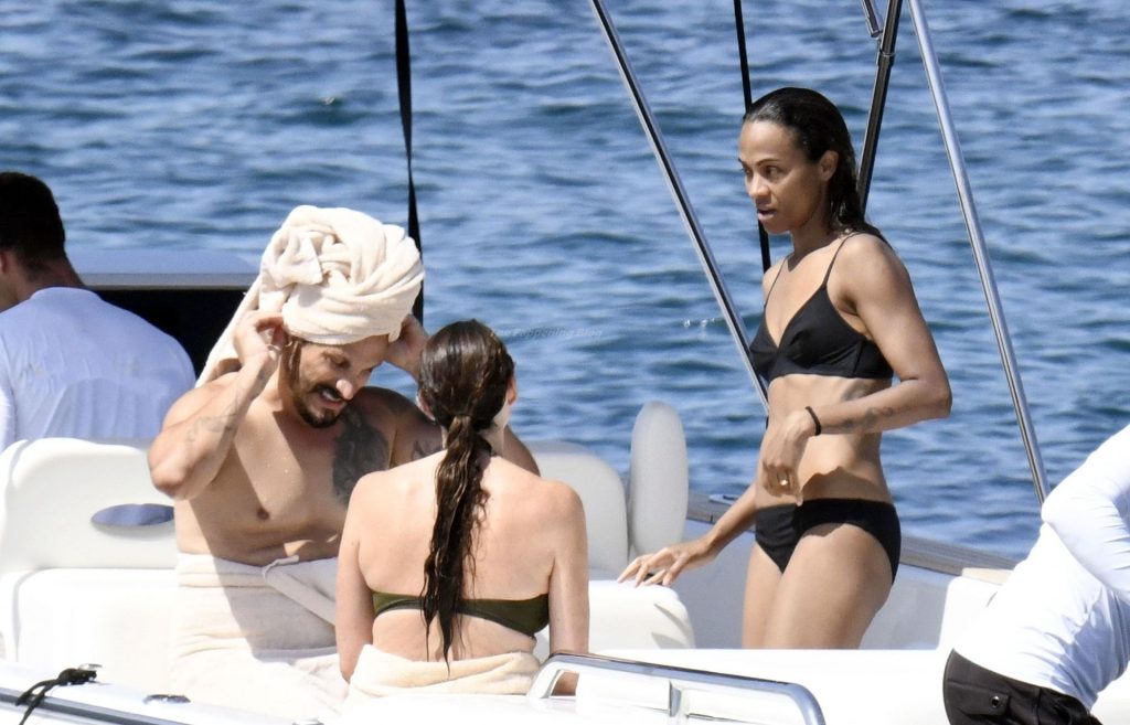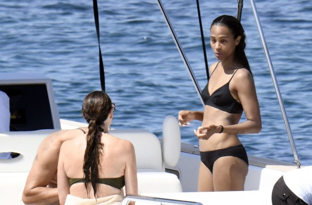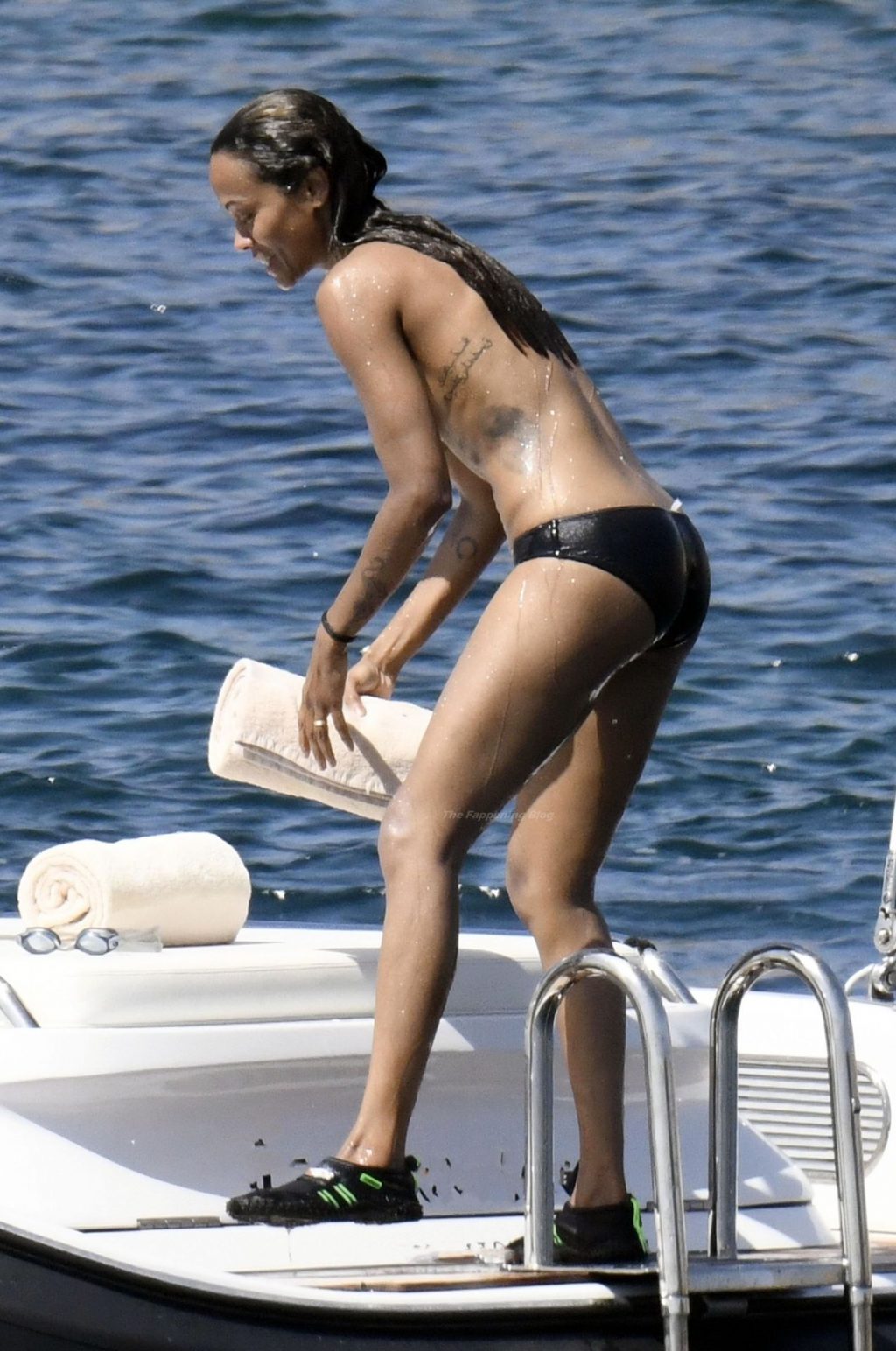 Сексуальная американская актриса Зои Салдана загорает топлесс под жарким итальянским солнцем во время своего солнечного отпуска на Сардинии, 15.08.2021.