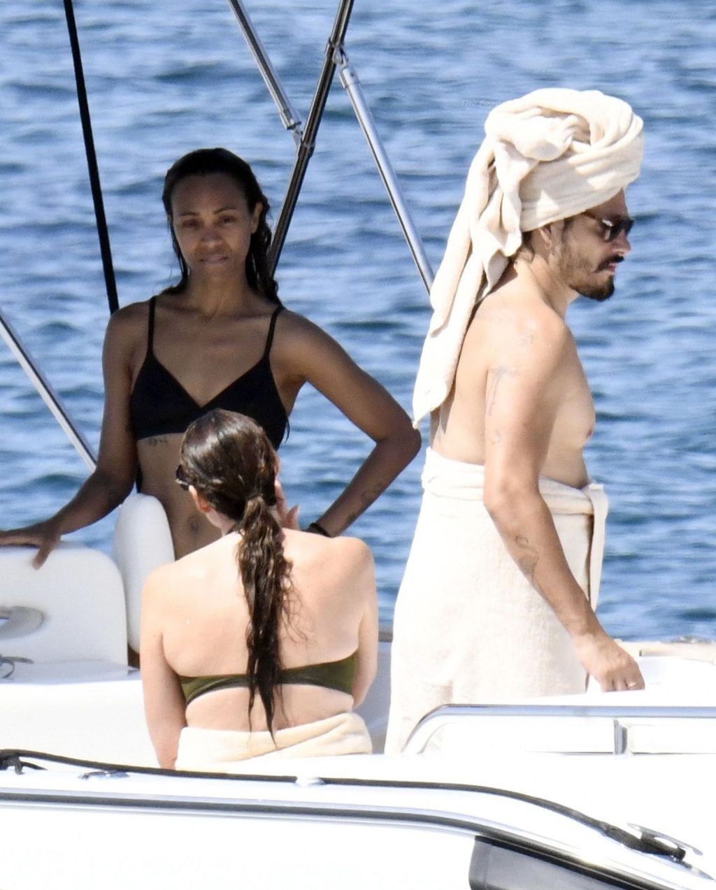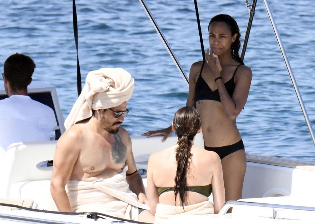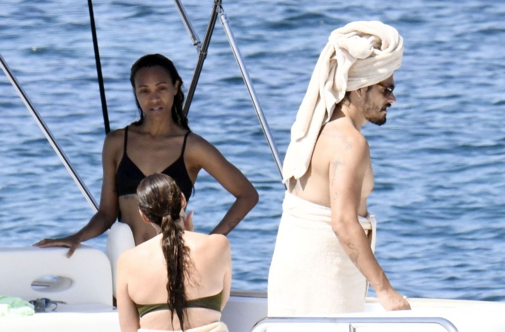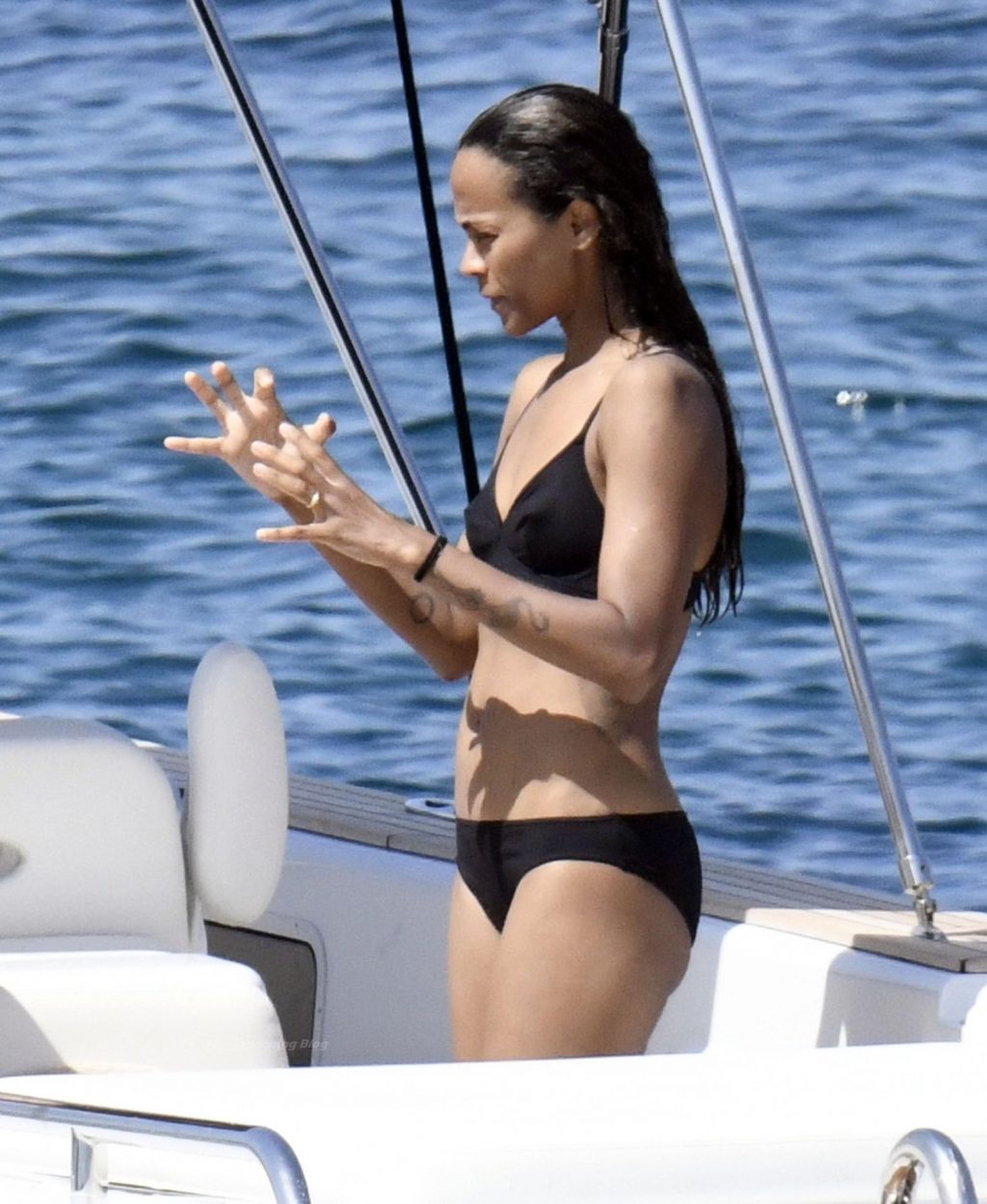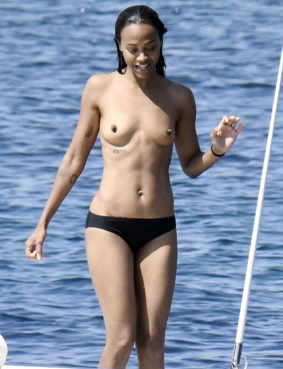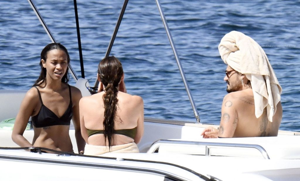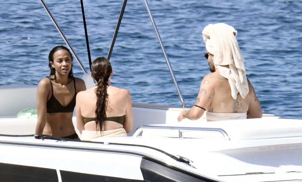 Сексуальная американская актриса Зои Салдана загорает топлесс под жарким итальянским солнцем во время своего солнечного отпуска на Сардинии, 15.08.2021.