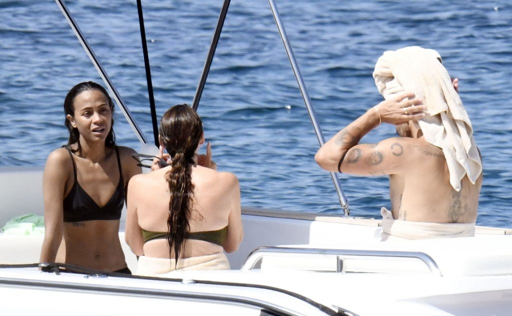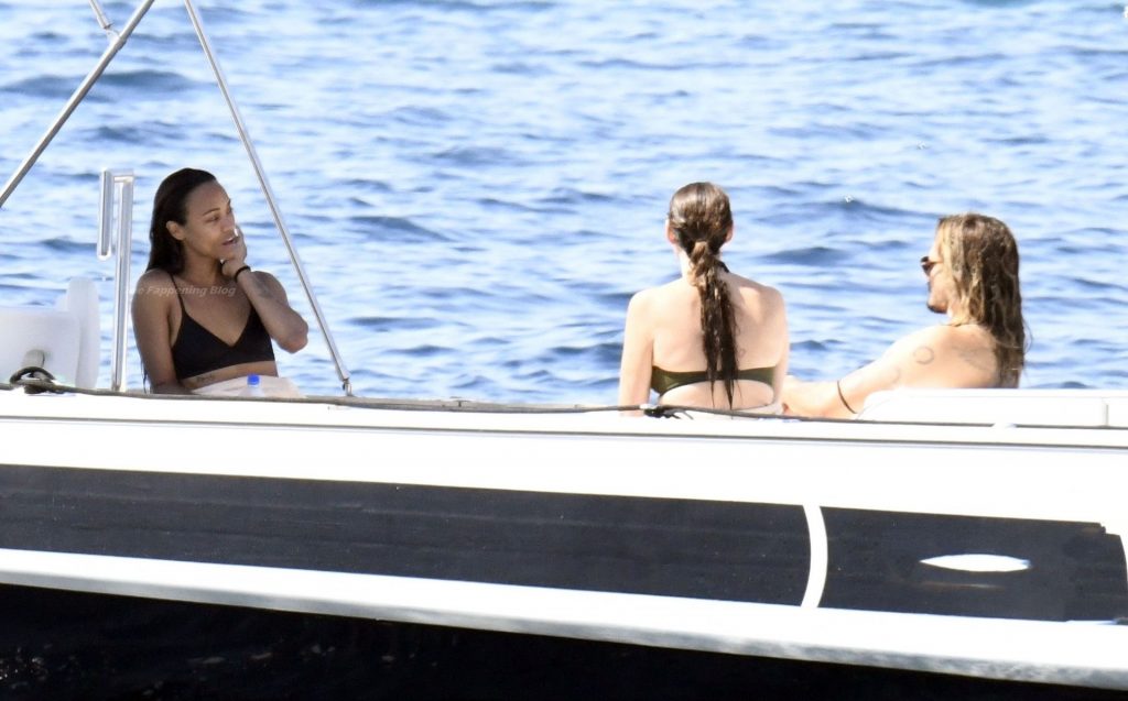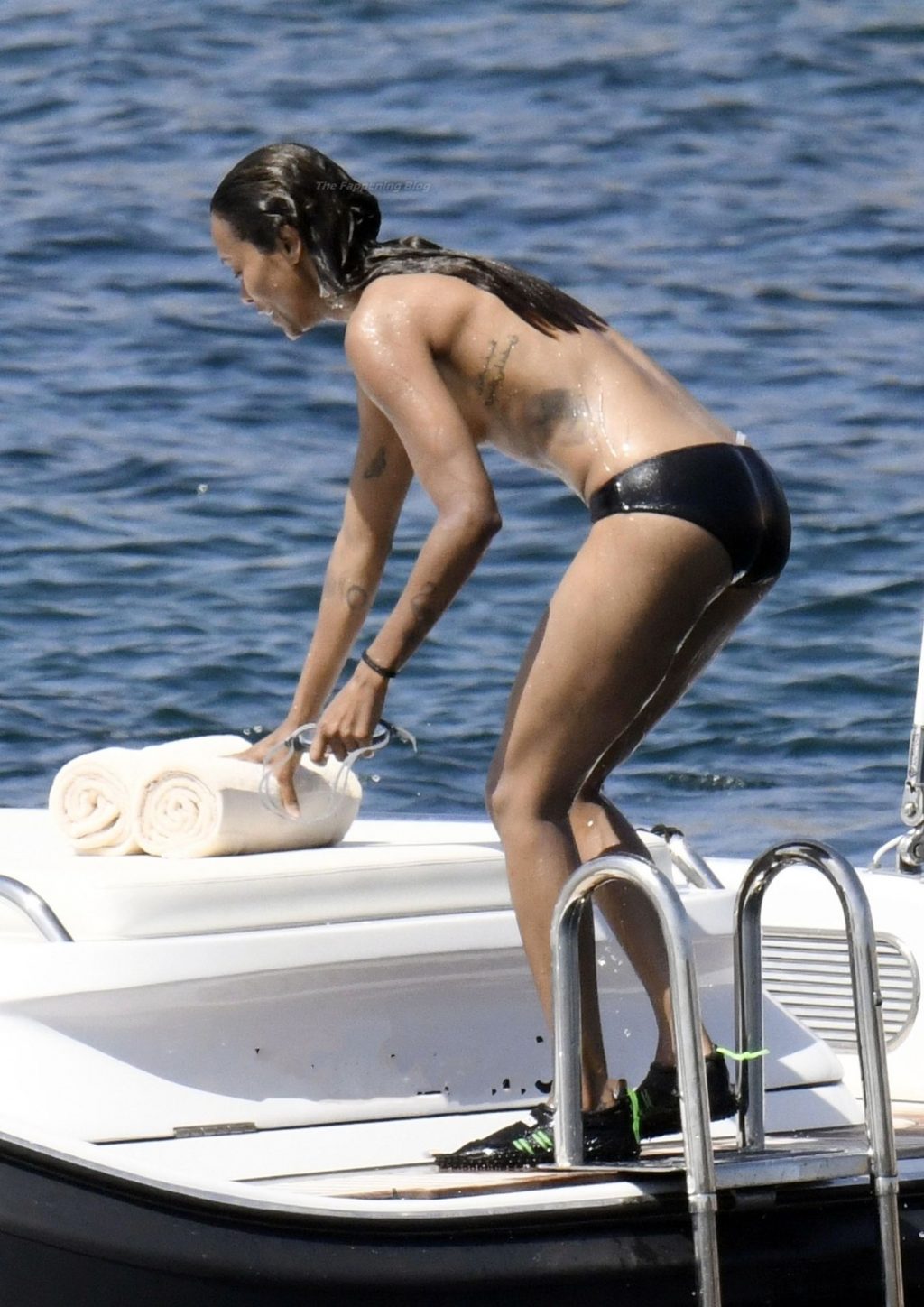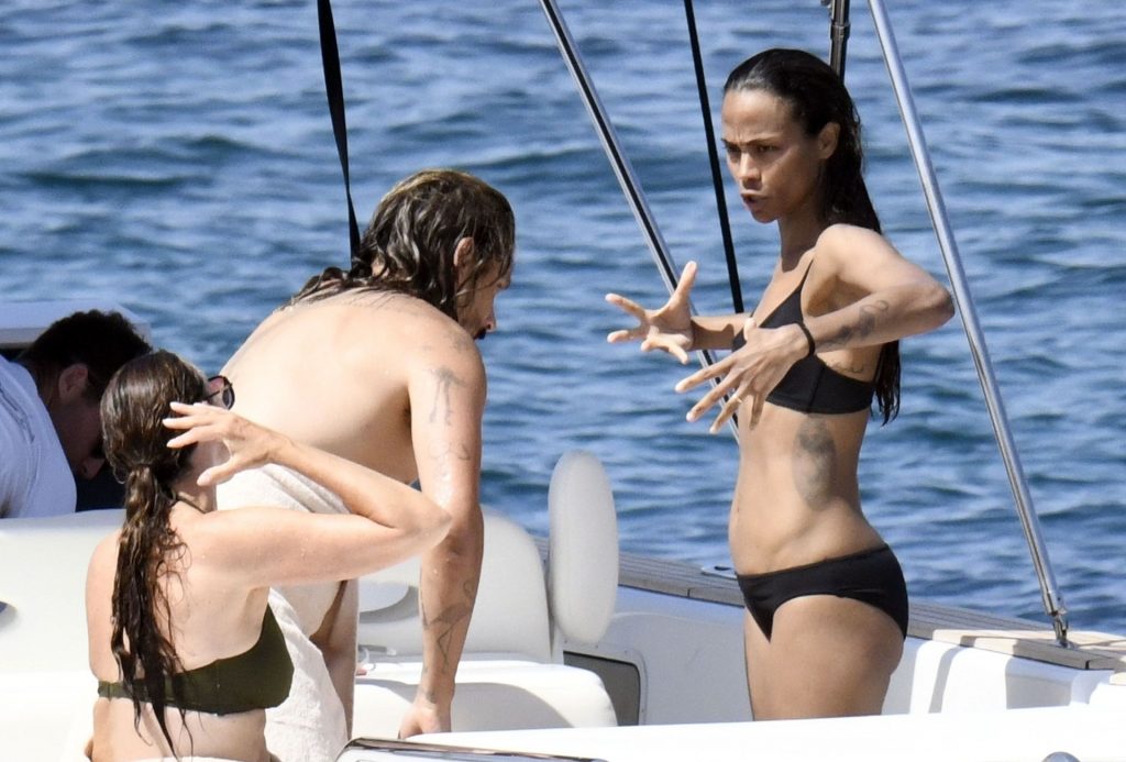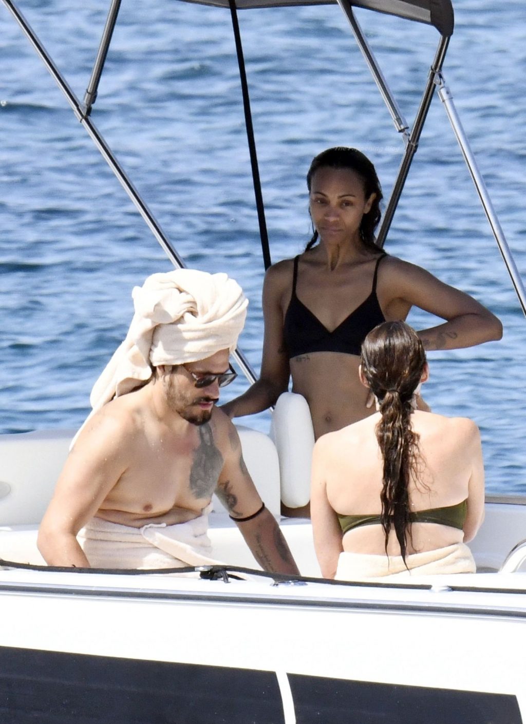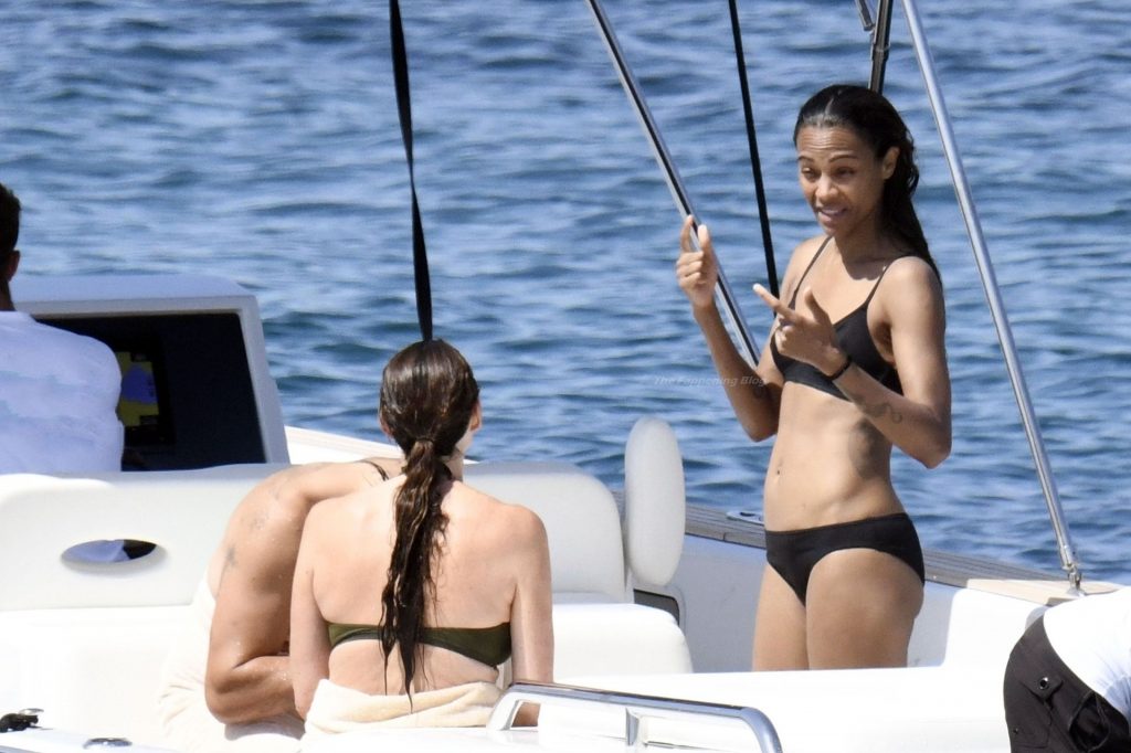 Сексуальная американская актриса Зои Салдана загорает топлесс под жарким итальянским солнцем во время своего солнечного отпуска на Сардинии, 15.08.2021.