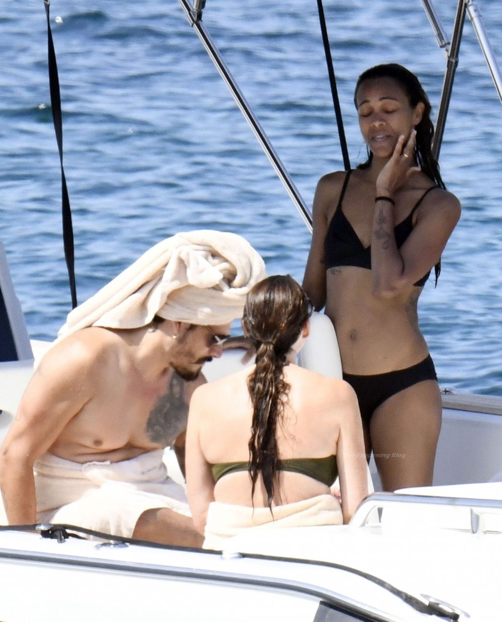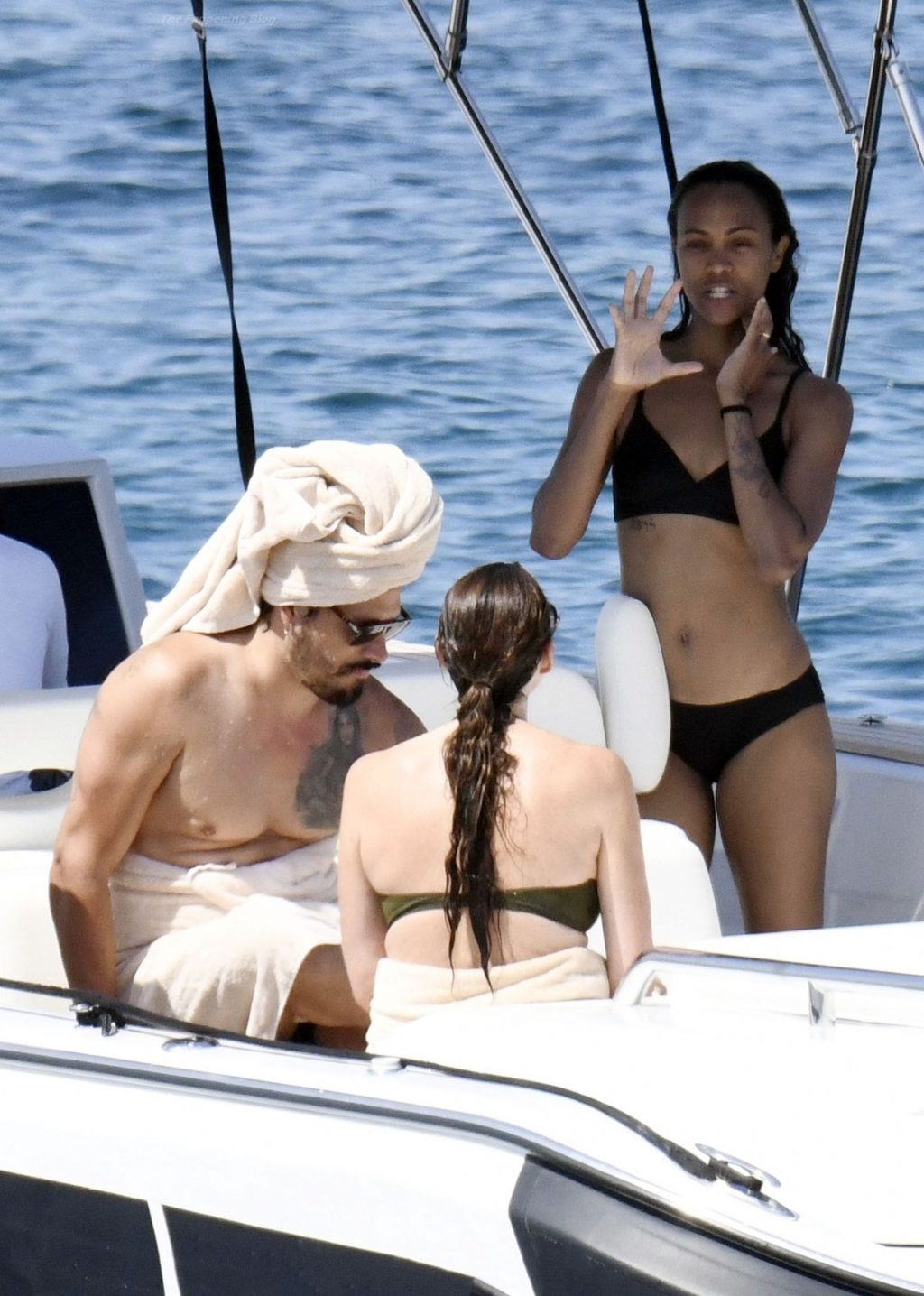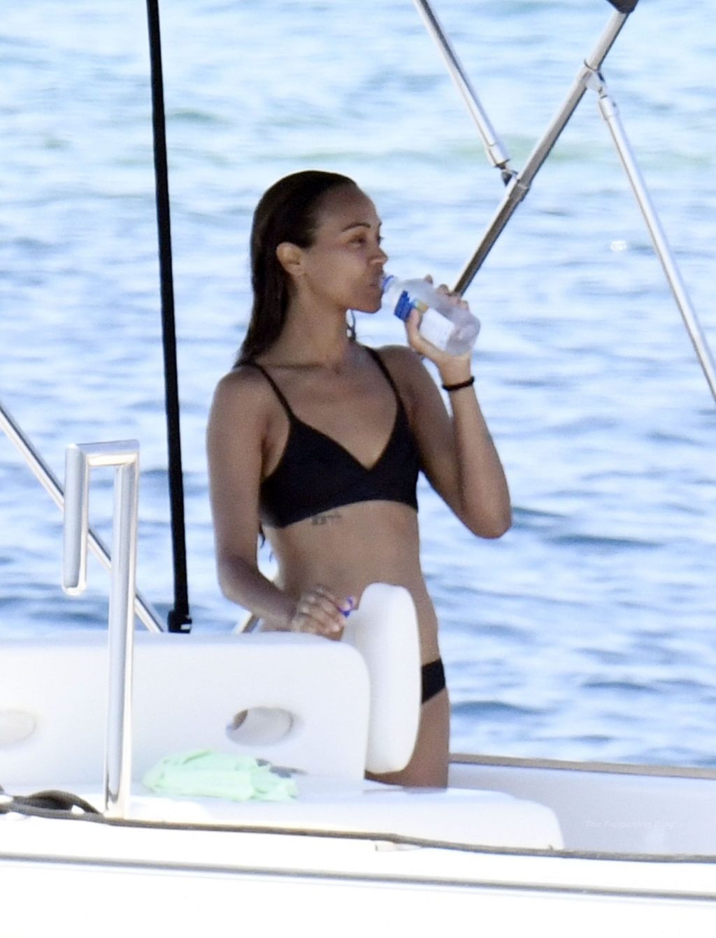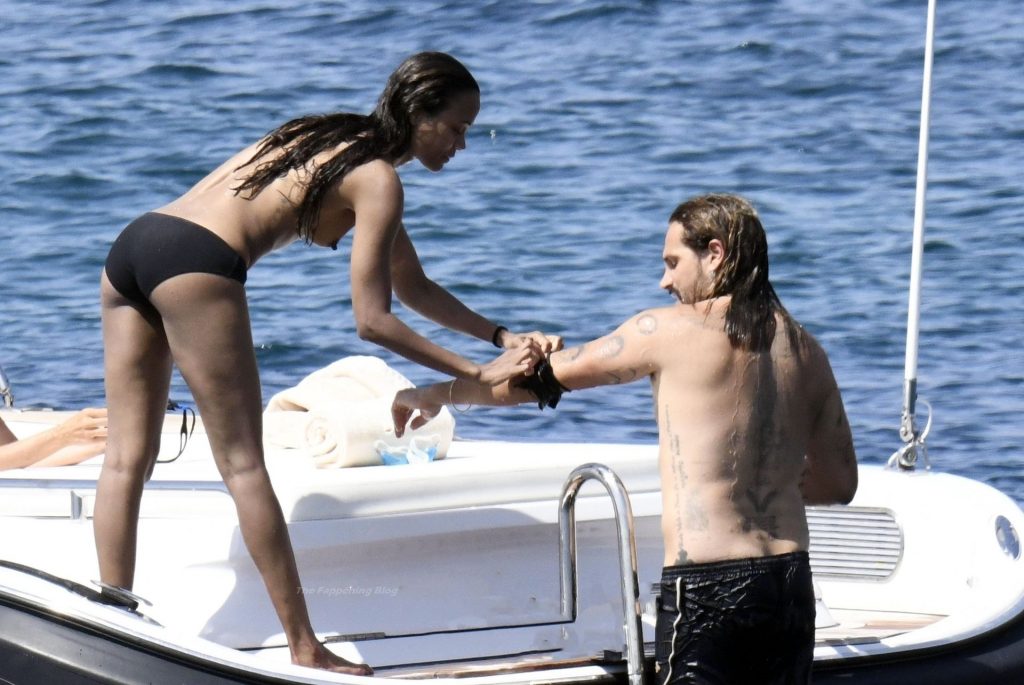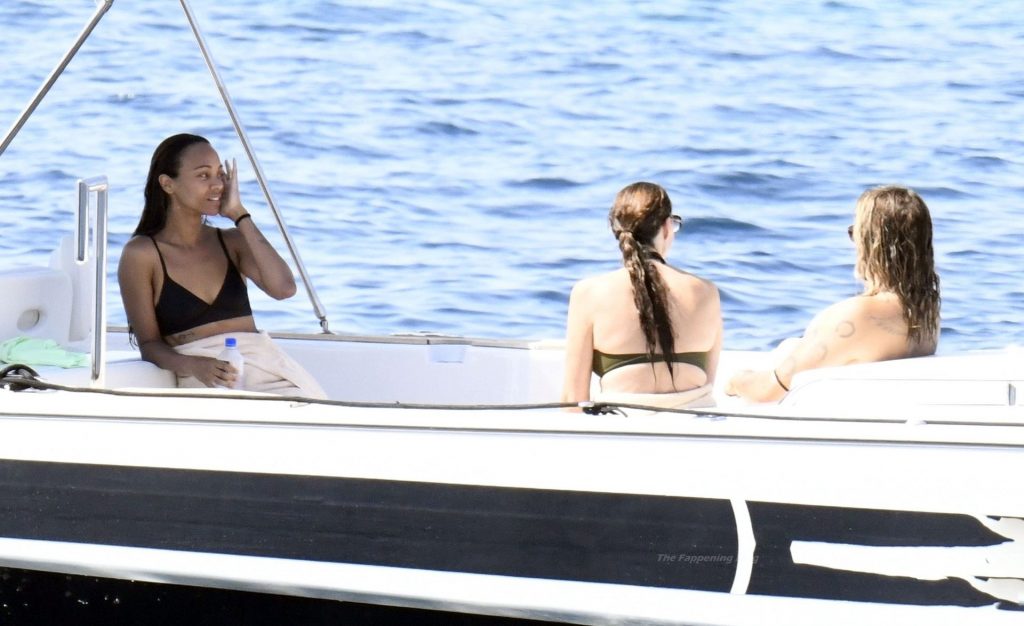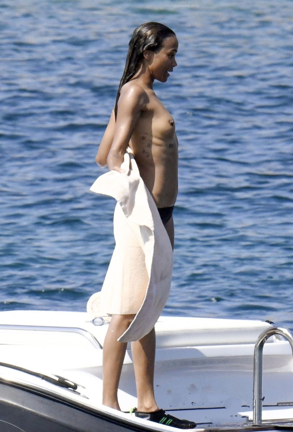 Сексуальная американская актриса Зои Салдана загорает топлесс под жарким итальянским солнцем во время своего солнечного отпуска на Сардинии, 15.08.2021.