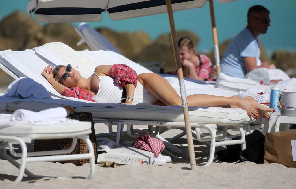 Модель Марина Линчук в белом цельном купальнике наслаждается днем на пляже с актрисой Кэролайн Вриланд в Майами, 09.03.2018.