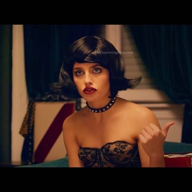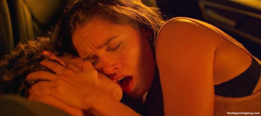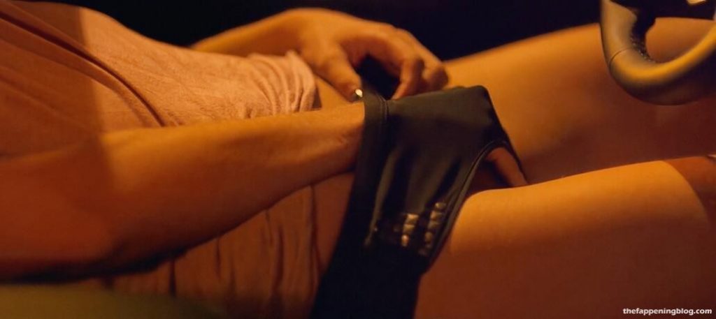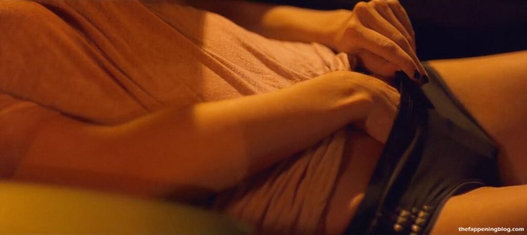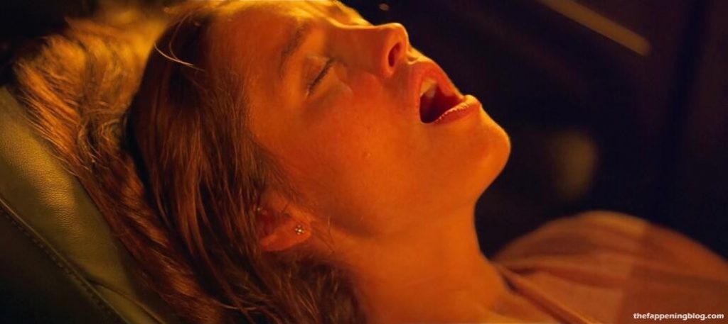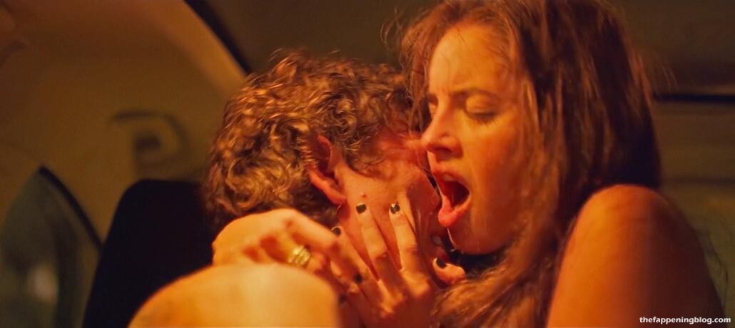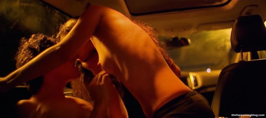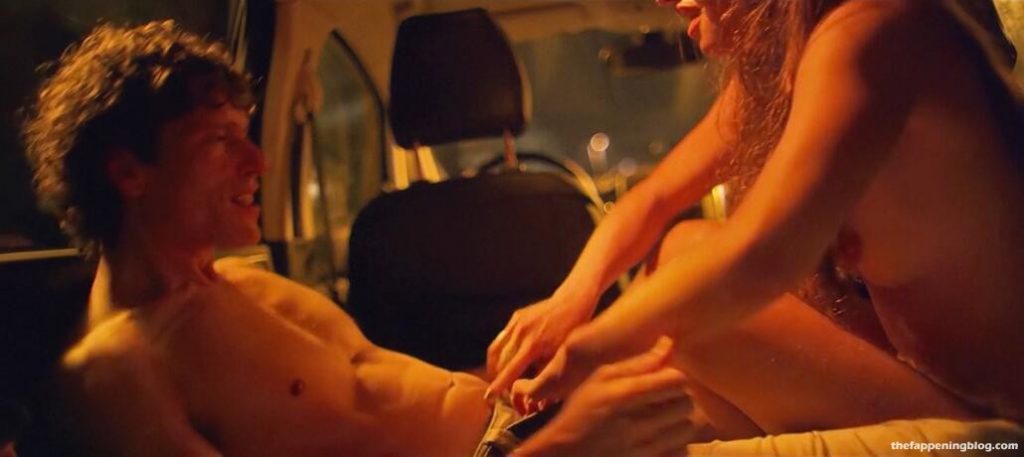Matilde Gioli is sitting in the driver’s seat of a car at night as she looks over at a guy in the passenger seat while they both pull their pants down and then Matilde sliding her hand down her black panties playing with herself and moaning giving us glimpses inside of her panties when they lift up as they both masturbate together separately and then roll over pressing up against each other and passionately kissing including at one point having her slowly lick up his chin and mouth all as she continues to pant and shudder a bit.