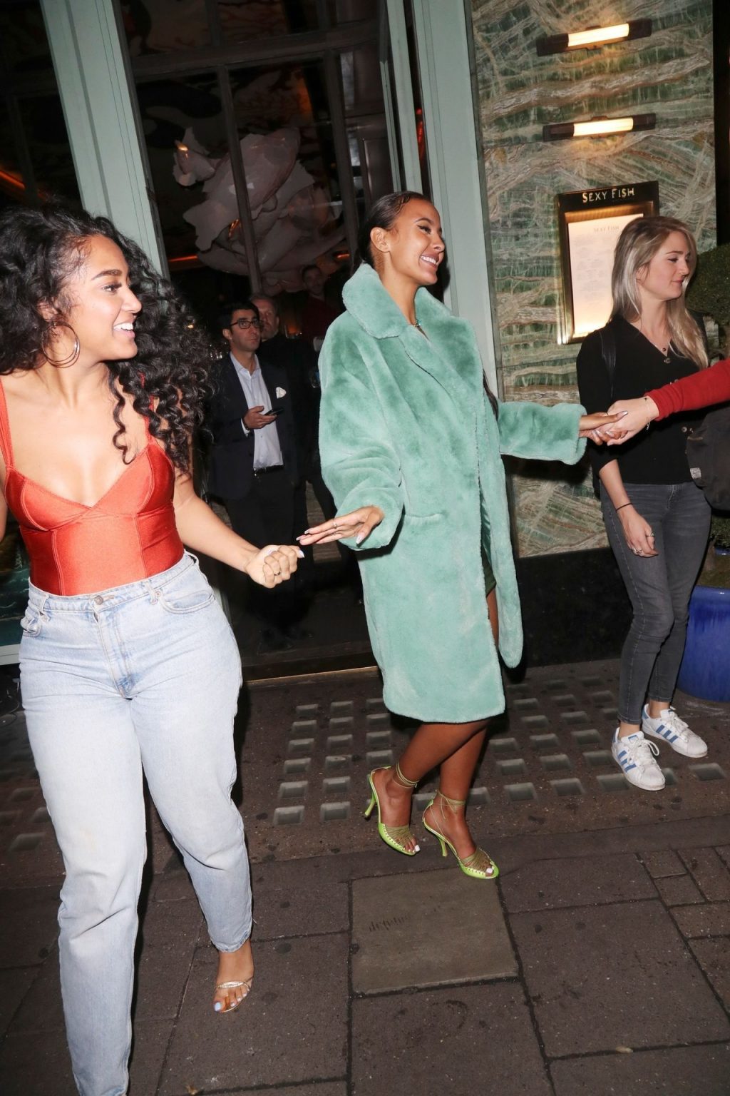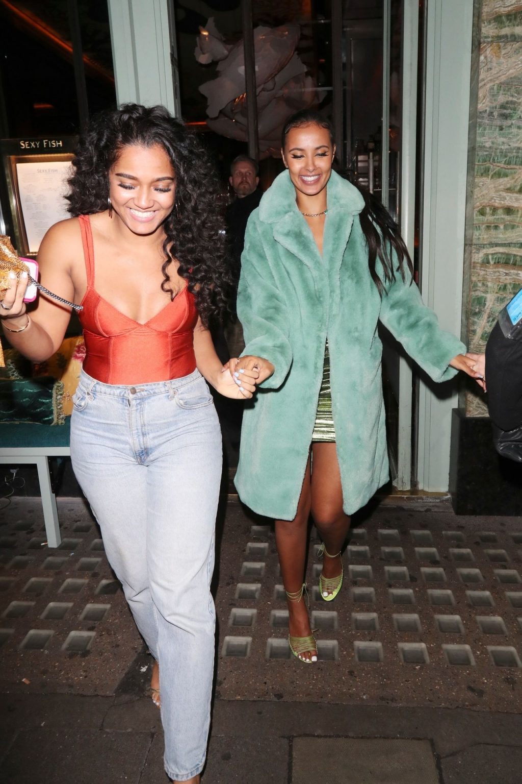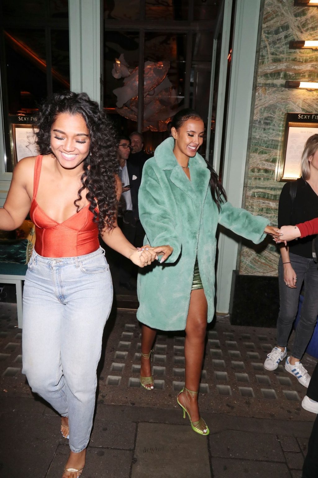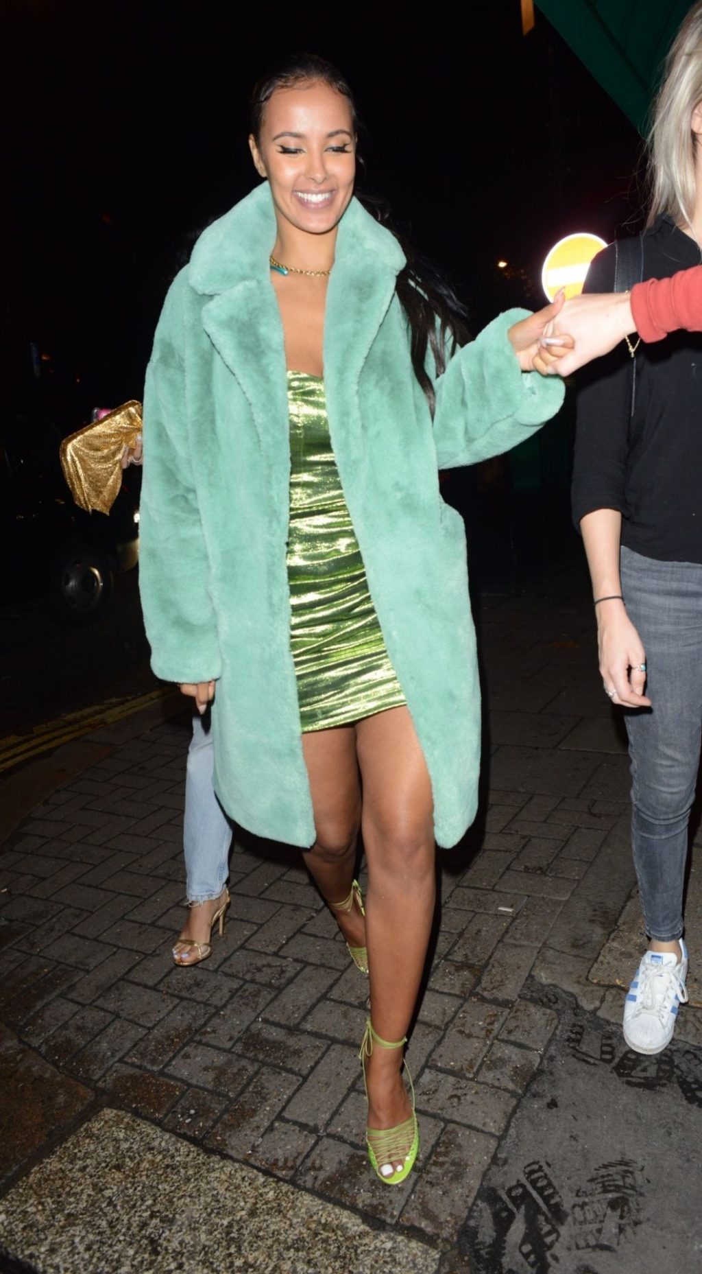 Телеведущая Maya Jama была замечена здесь, покидая ресторан Sexy Fish в Мэйфэре, в коротком зелёном платье и большом зелёном пальто из искусственного меха, 11/08/2019.