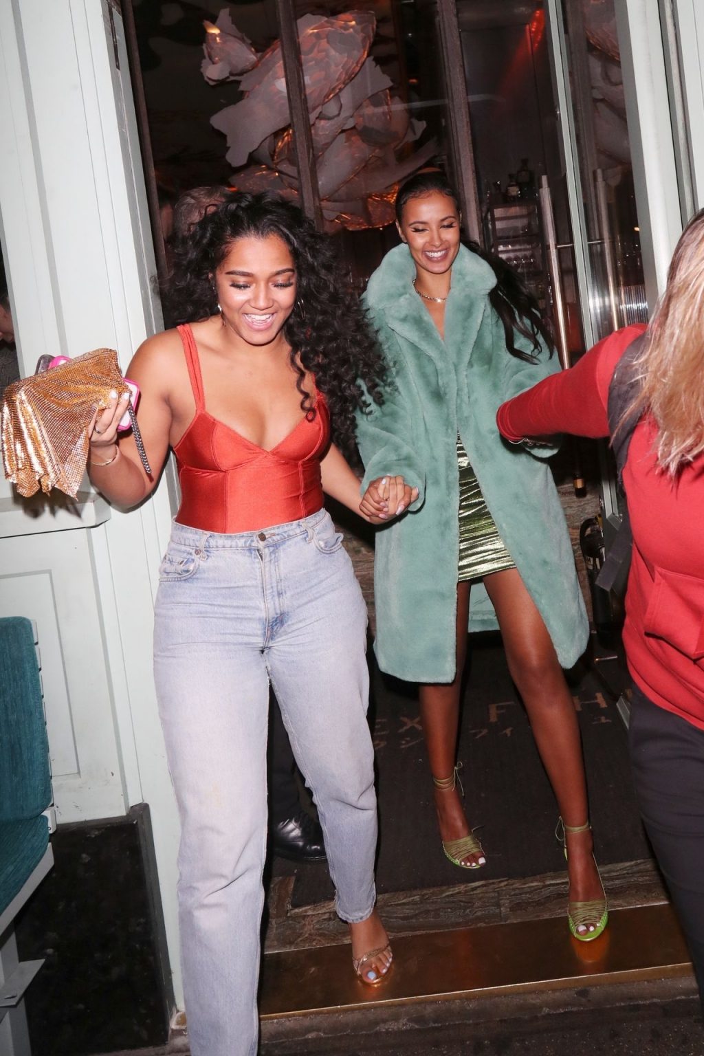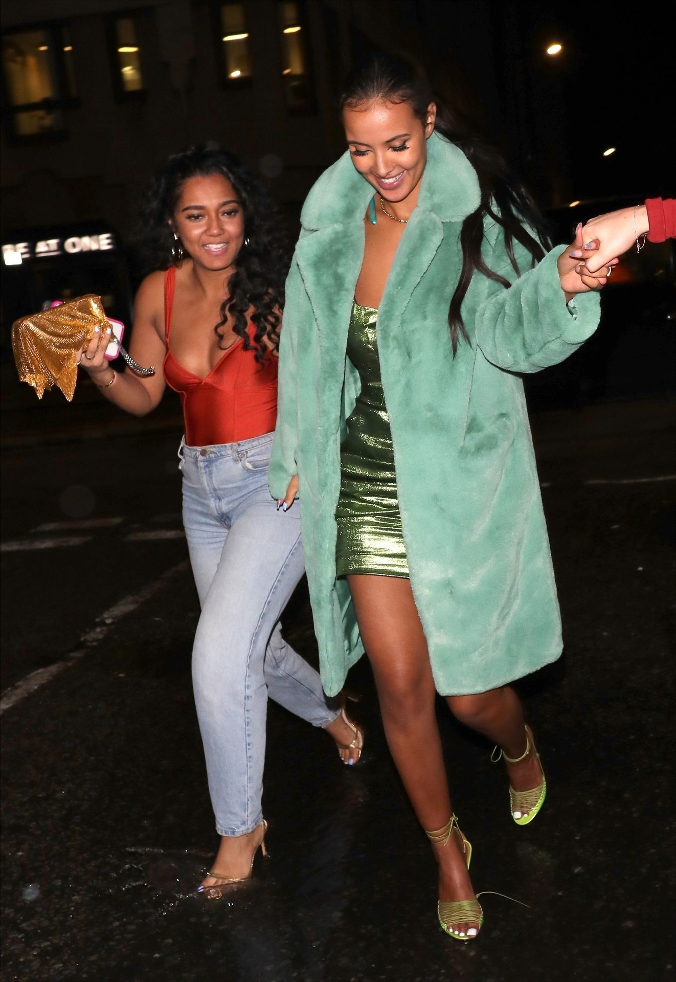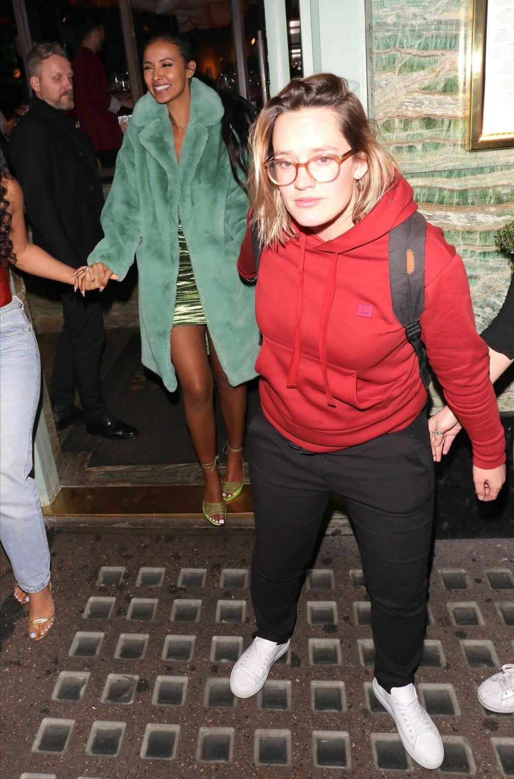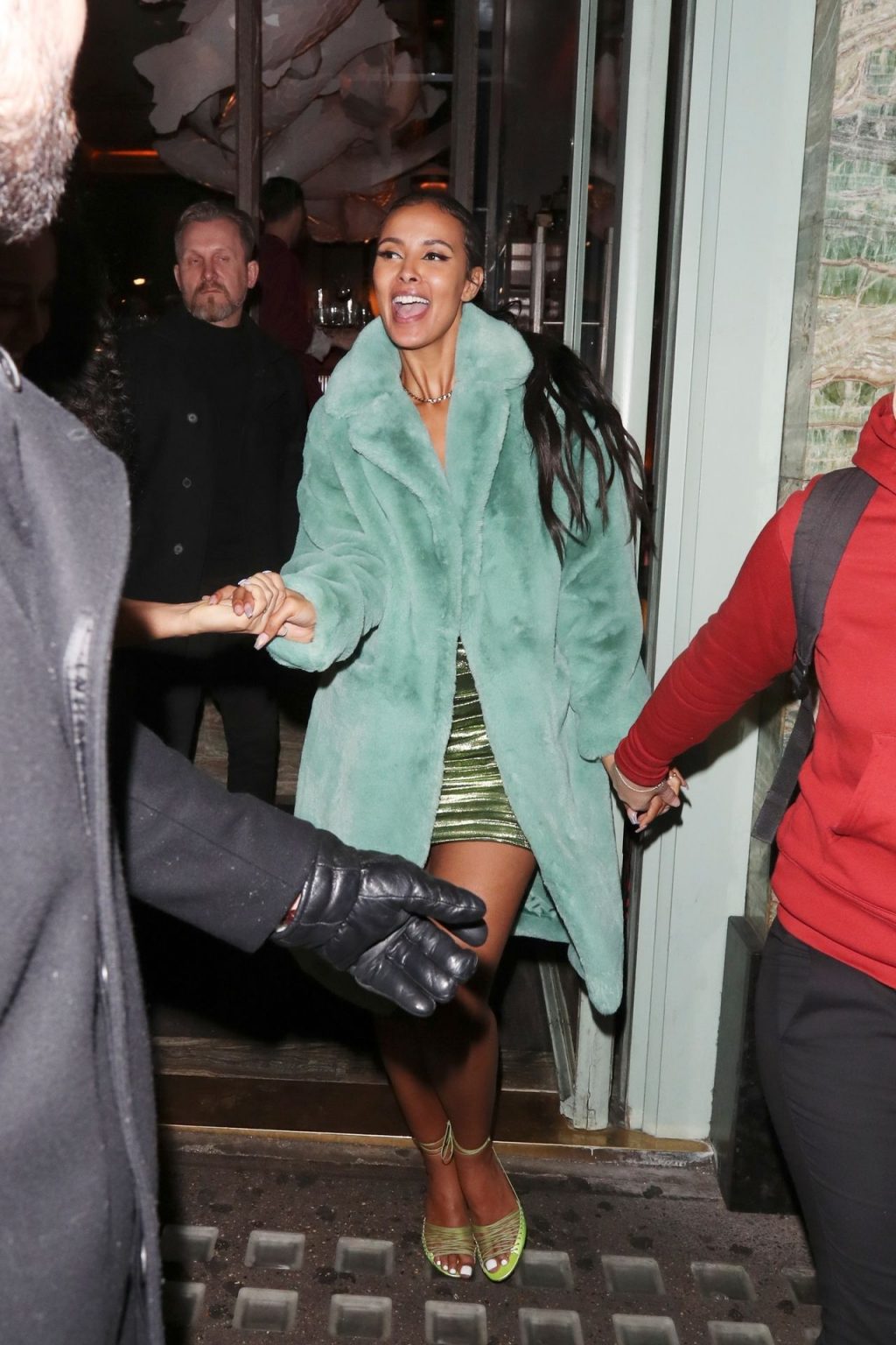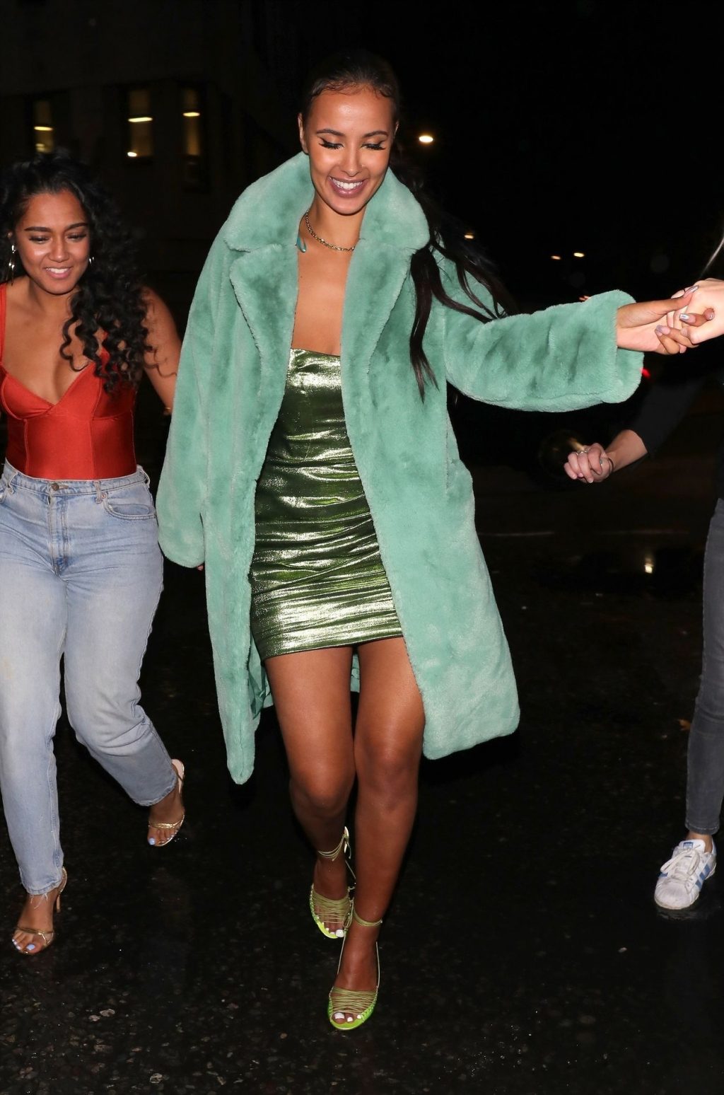 Телеведущая Maya Jama была замечена здесь, покидая ресторан Sexy Fish в Мэйфэре, в коротком зелёном платье и большом зелёном пальто из искусственного меха, 11/08/2019.