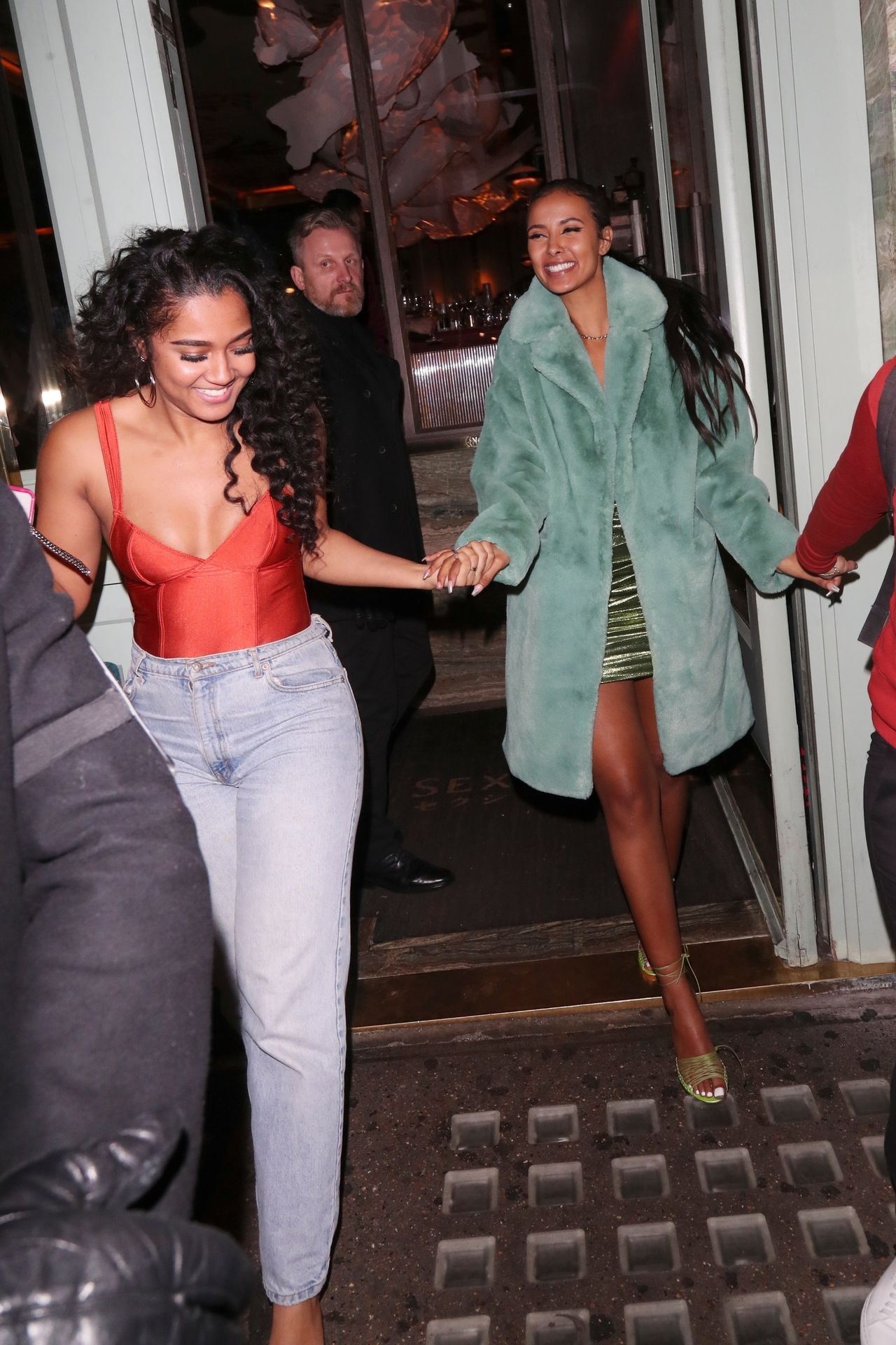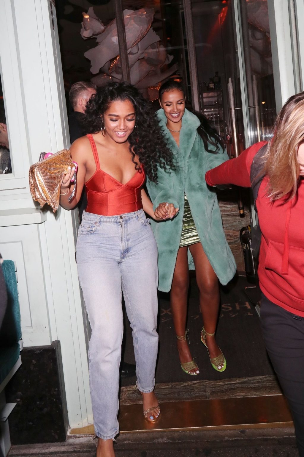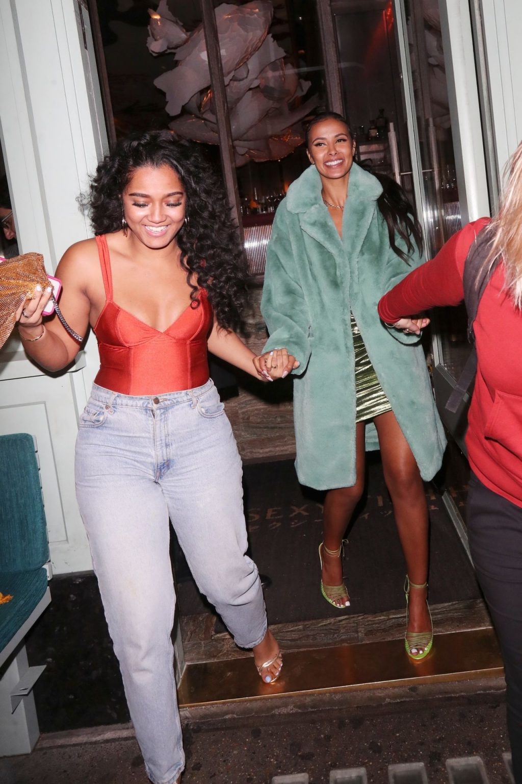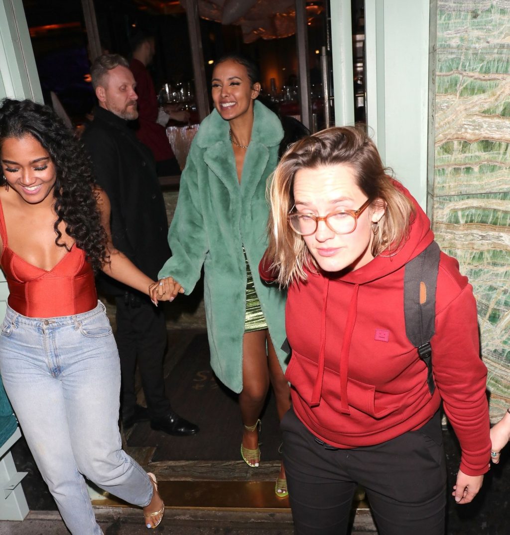 Телеведущая Maya Jama была замечена здесь, покидая ресторан Sexy Fish в Мэйфэре, в коротком зелёном платье и большом зелёном пальто из искусственного меха, 11/08/2019.