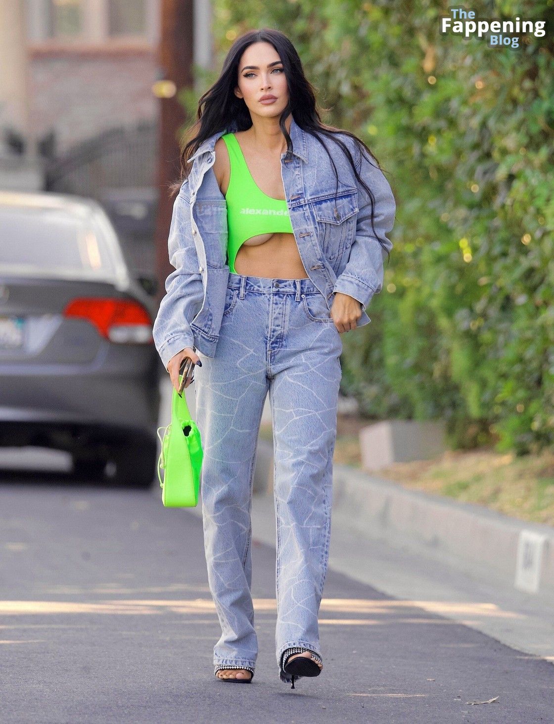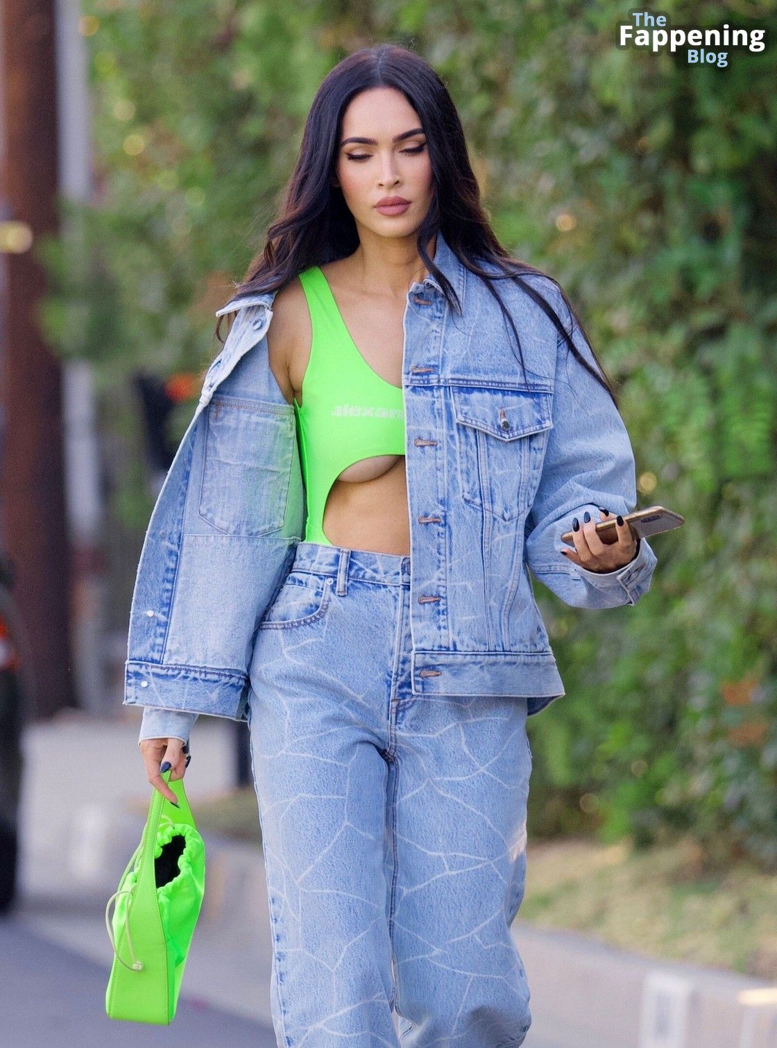 Этот образ — не только о её личной жизни, но и большое изменение стилистов. Это действительно сексуальный осенний наряд. Этот оверсайз джинсовый комплект Alexander Wang с классной мраморной текстурой — настоящий магнит для взглядов. Но честно говоря, все смотрят на неоновый купальник Megan с очень глубоким вырезом — он практически демонстрирует её декольте. Фигура Megan, как всегда, невероятна.