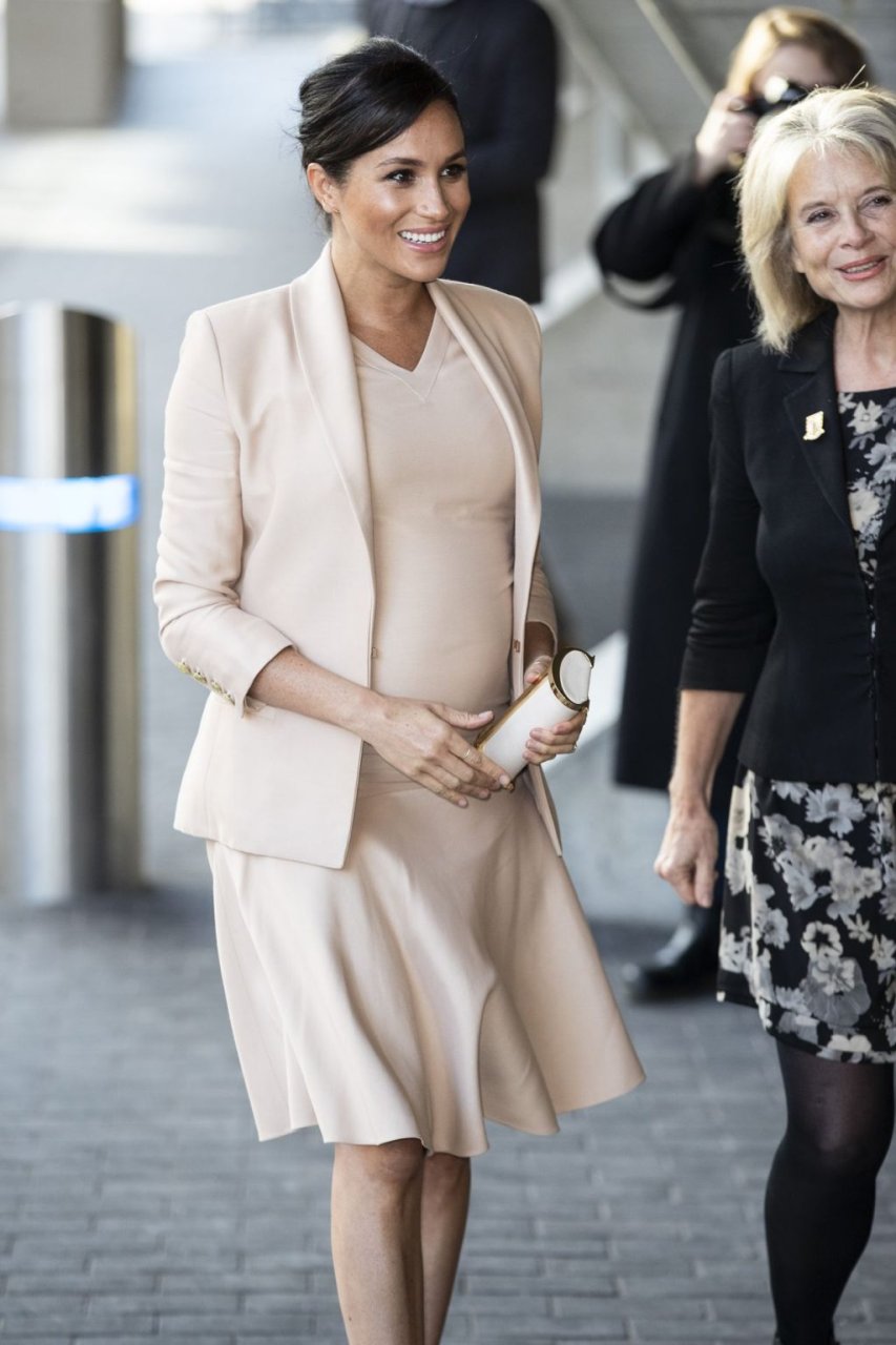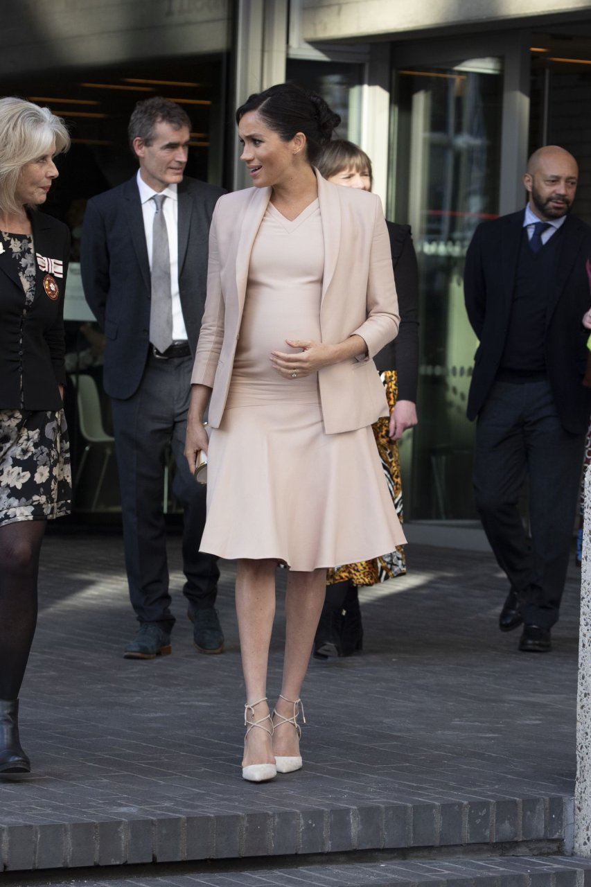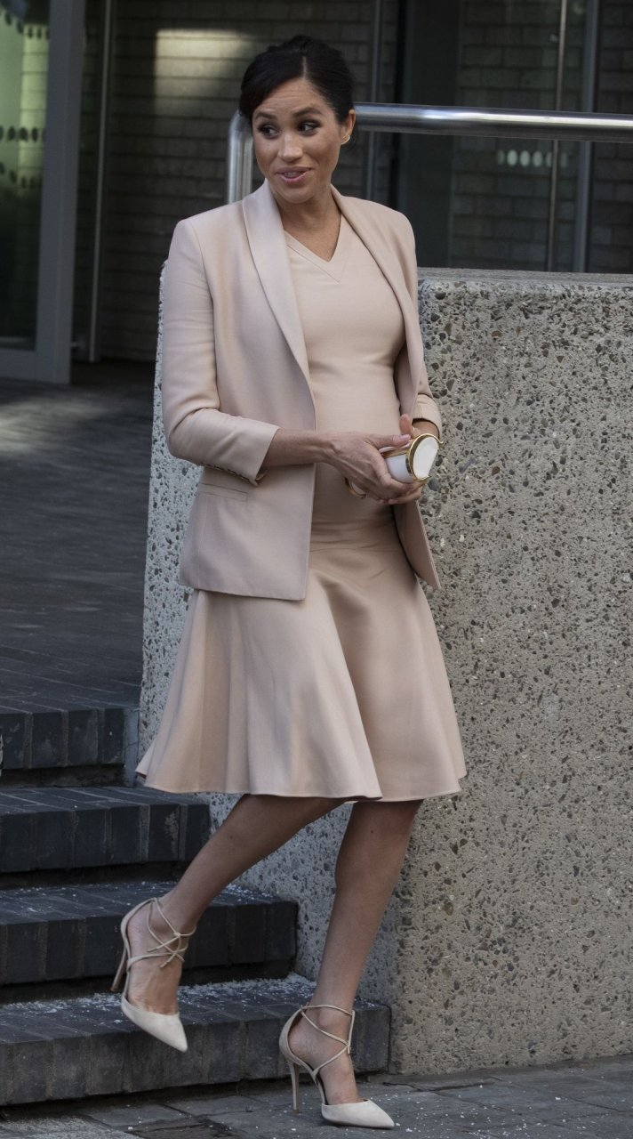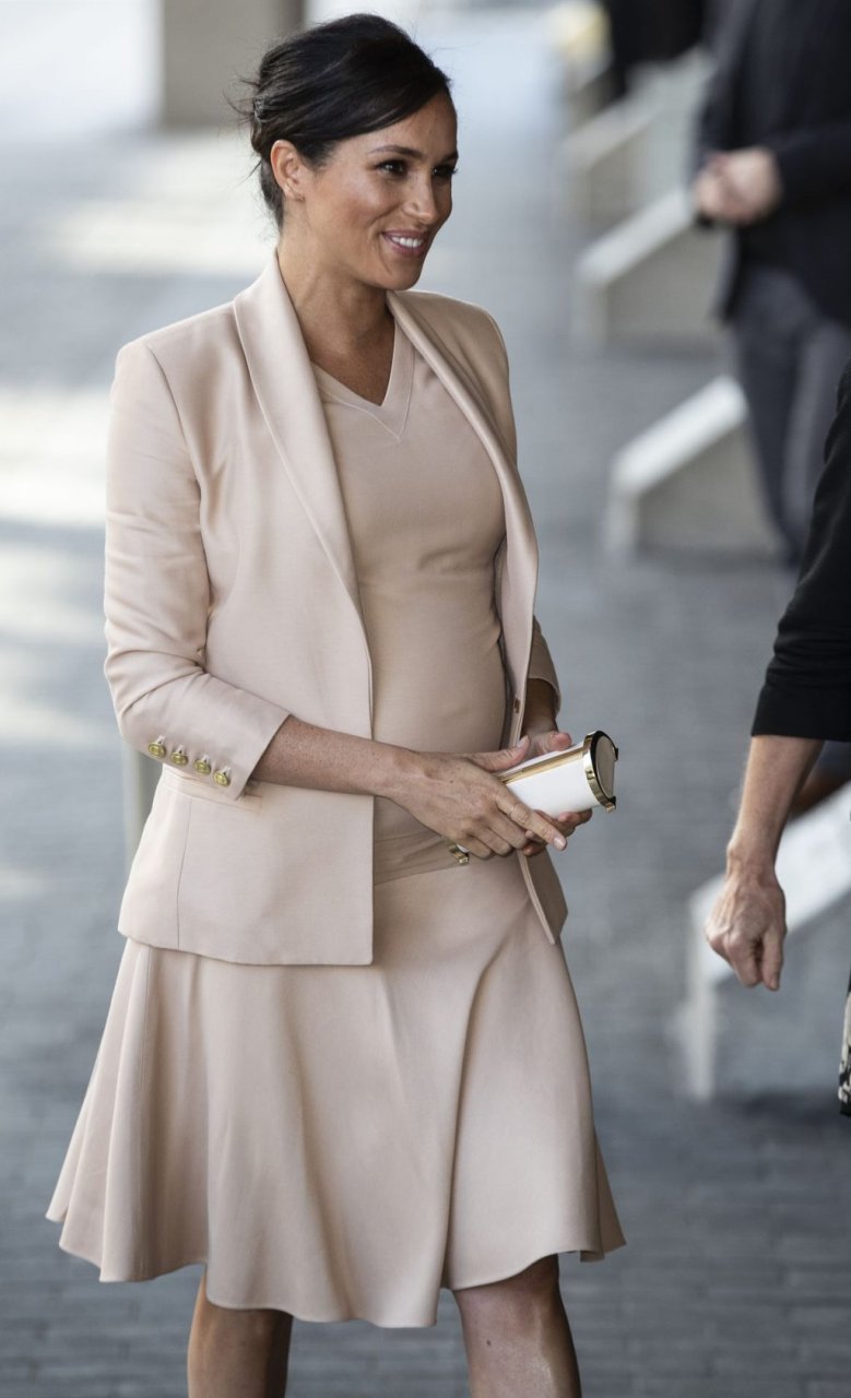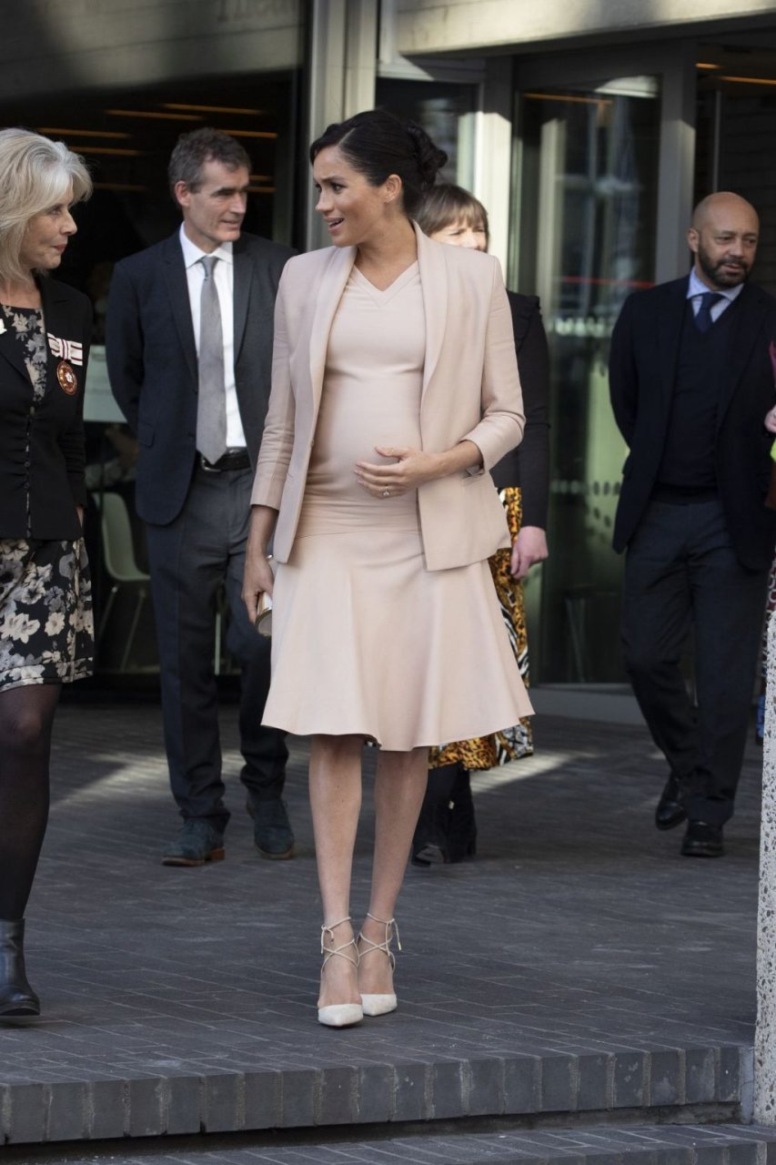 Меган сочетала платье нюдового цвета фасона А-силуэт с подходящим пиджаком, оба от Брандона Максвелла. Она дополнила образ клатчем Carolina Herrera и парой нюдовых кружевных туфель на шнуровке Aquazurra.