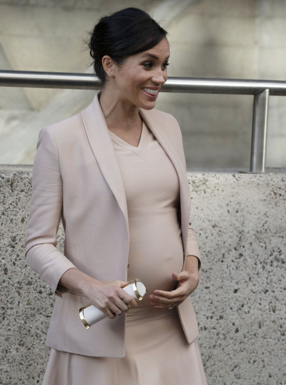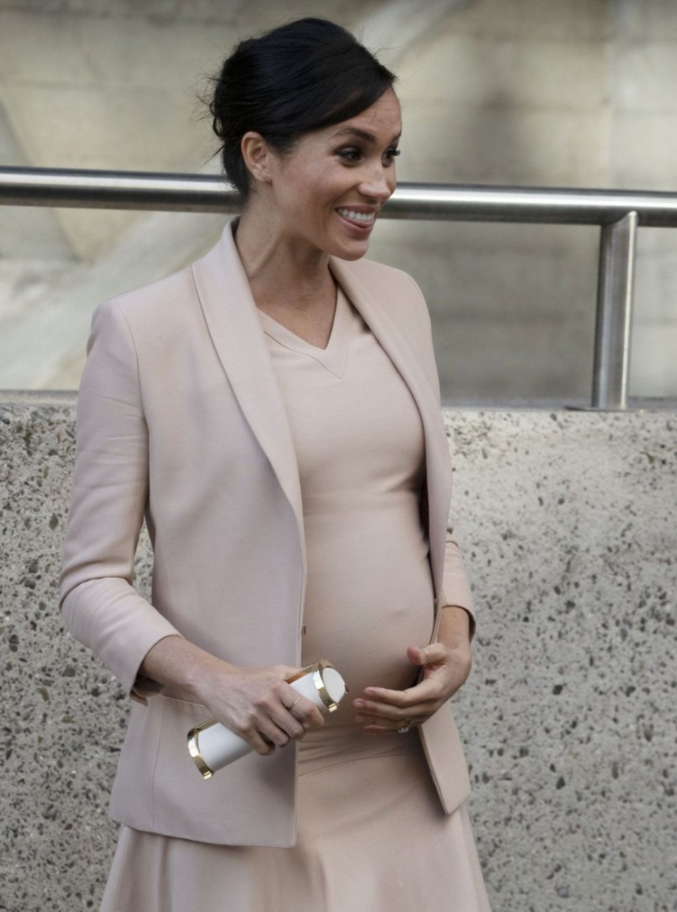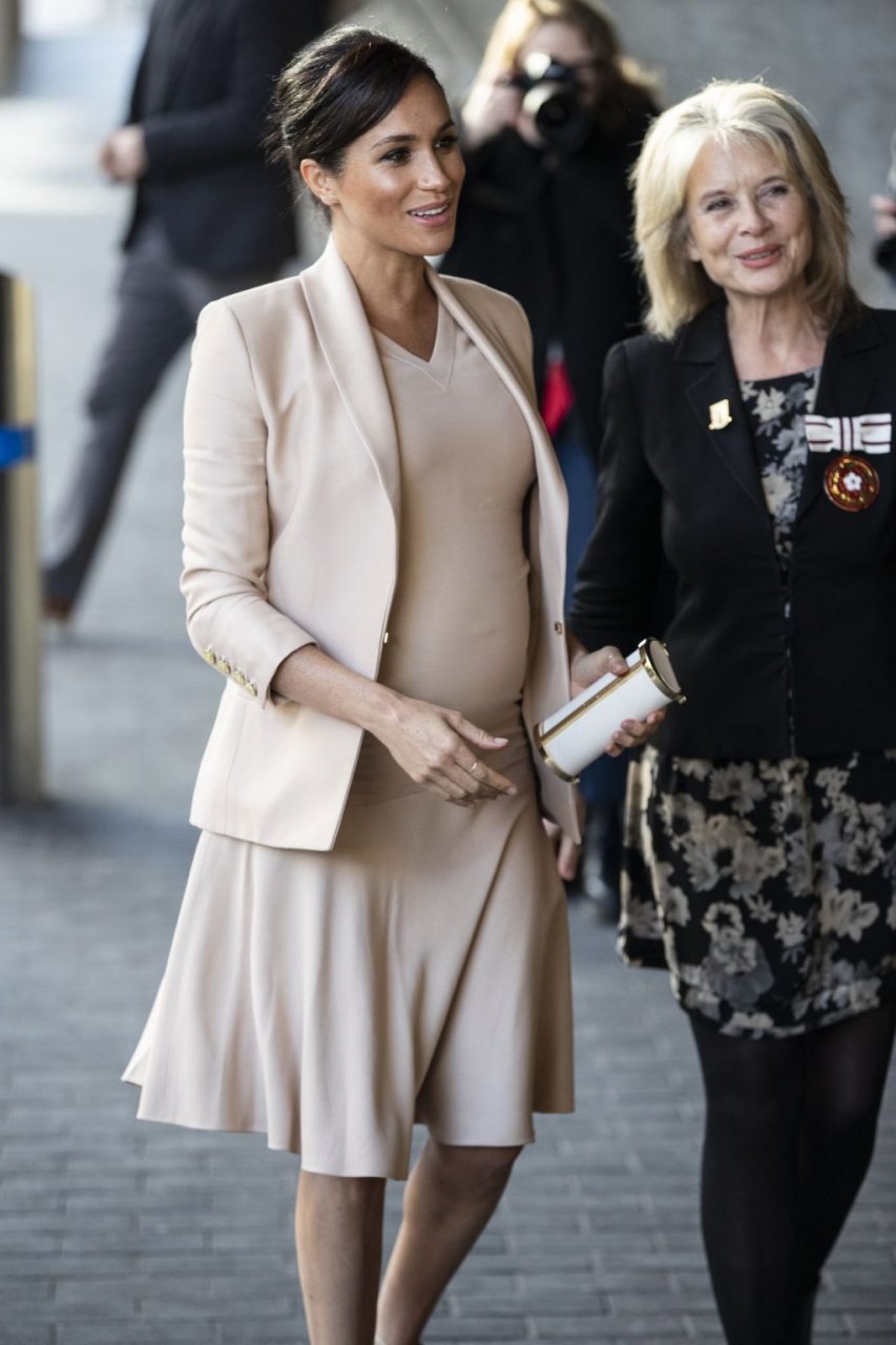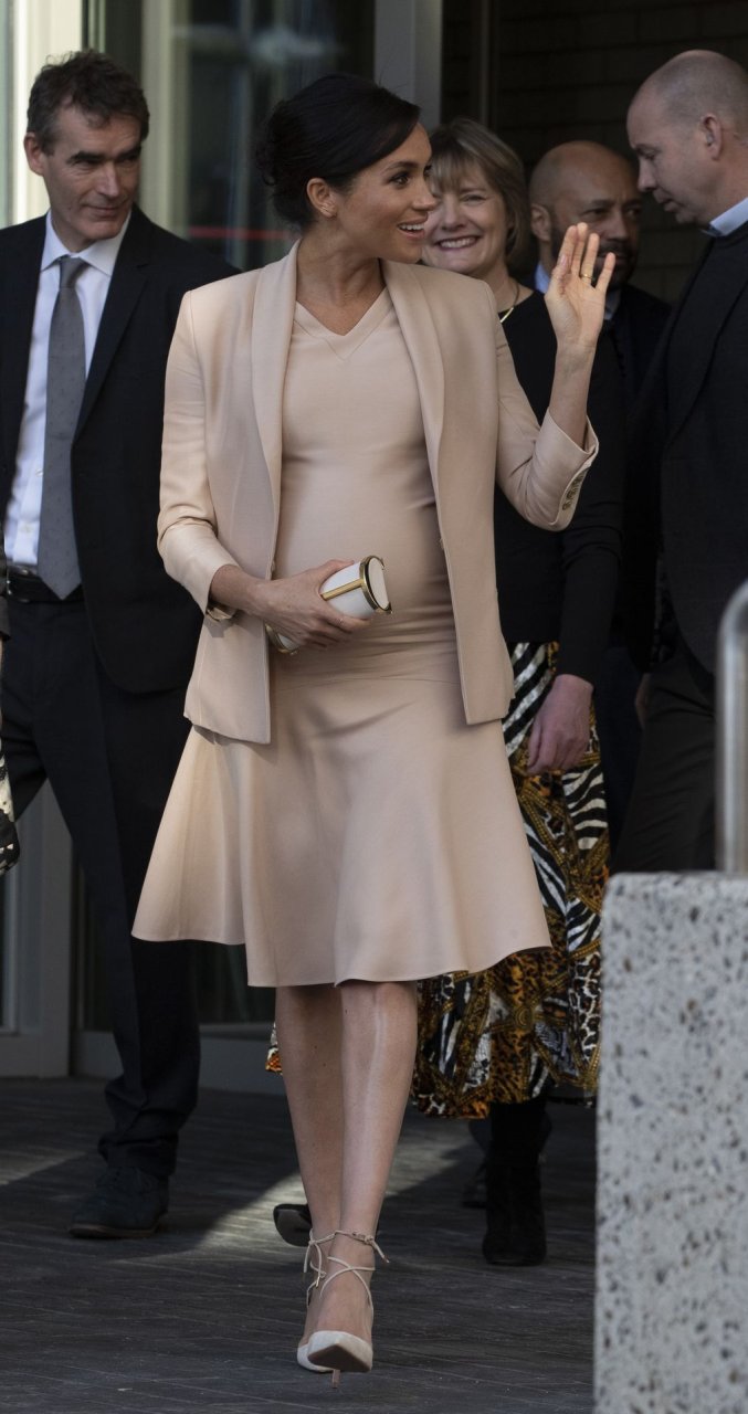 Меган сочетала платье нюдового цвета фасона А-силуэт с подходящим пиджаком, оба от Брандона Максвелла. Она дополнила образ клатчем Carolina Herrera и парой нюдовых кружевных туфель на шнуровке Aquazurra.
