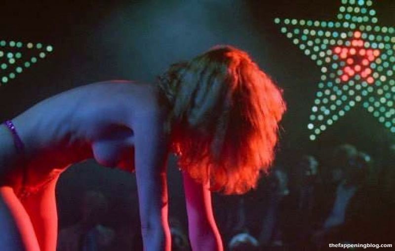 Melanie Griffith is unzipping out of a blue sequined dress during a dance routine and revealing her nice breasts and her ass in a thong underneath during a dance routine at a strip club.