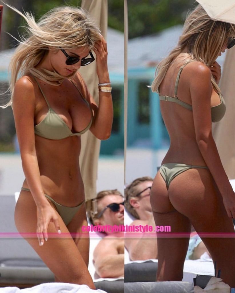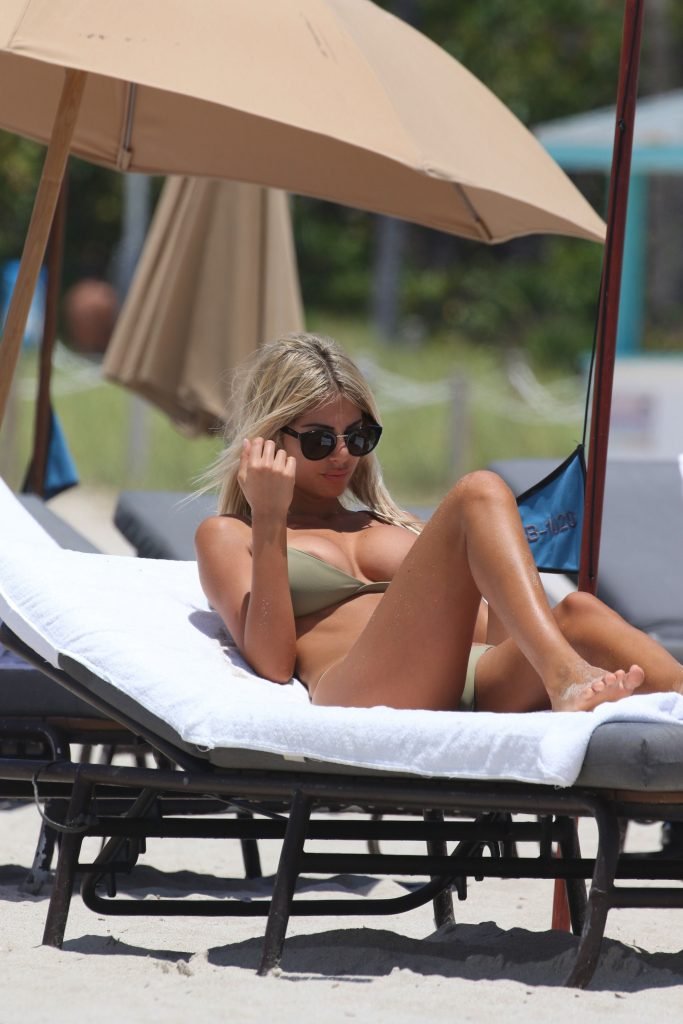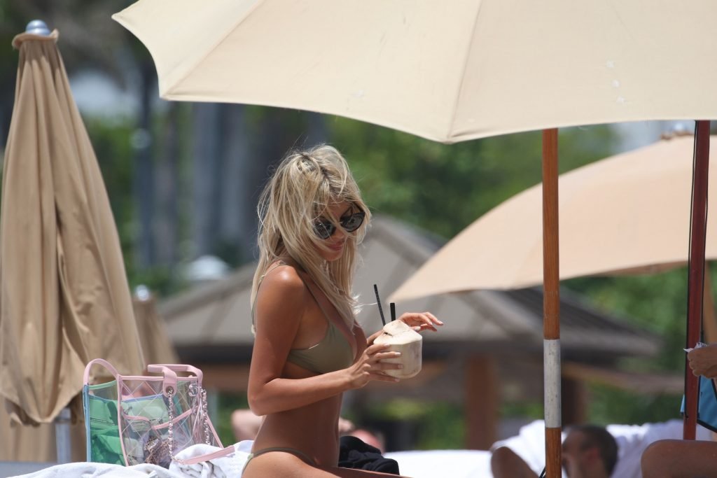 Итальянская модель Мелисса Кастаньоли запечатлена в бежевом бикини-танга на пляже в Майами-Бич, 24.05.2018. Мелисса — бывшая девушка футболиста Марио Балотелли, модель и звезда социальных сетей. Возраст: 27 лет.