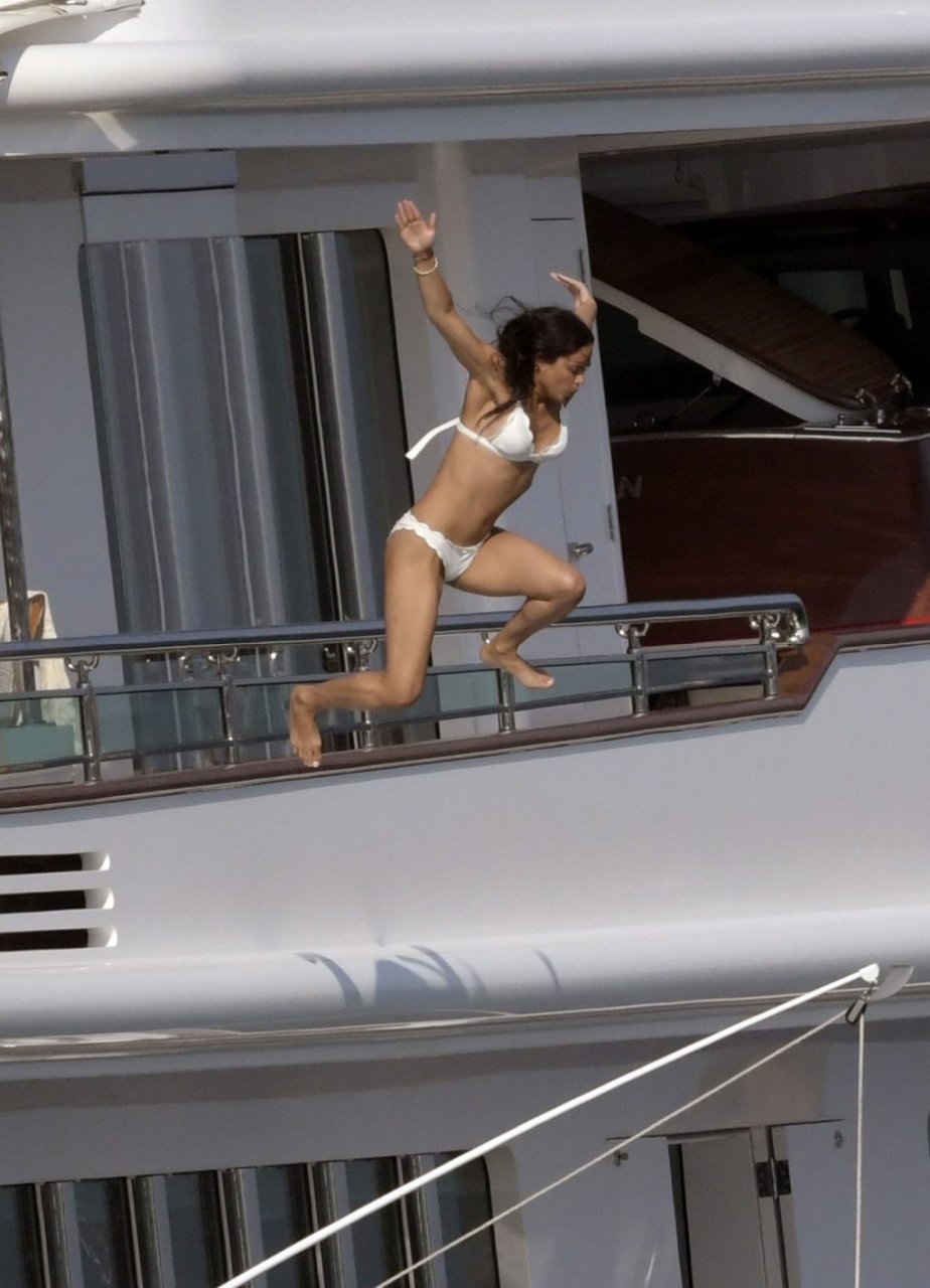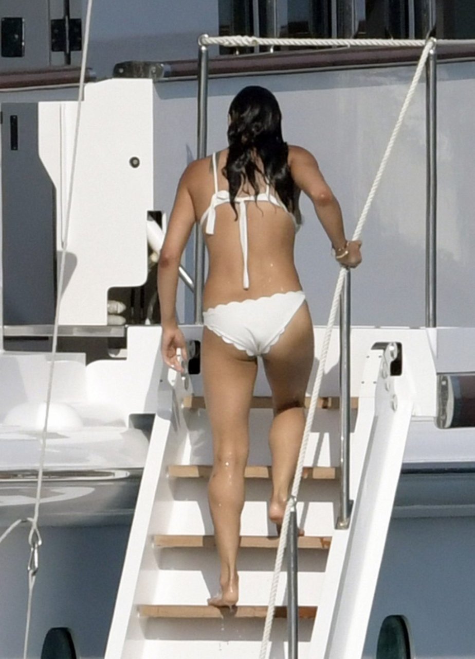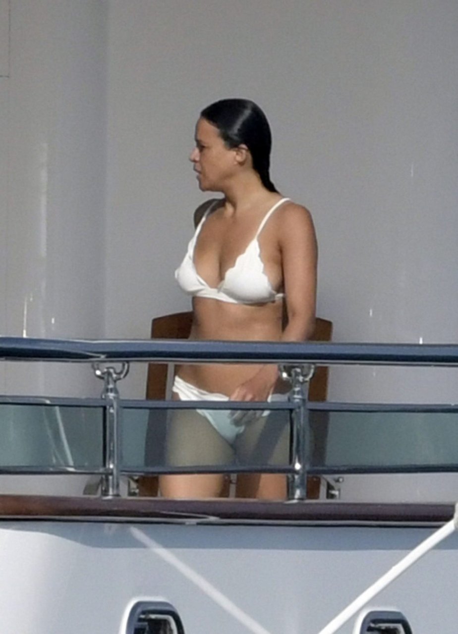 Бисексуальная актриса Мишель Родригес (40) была замечена в белом бикини на яхте в Порто Черво, Италия, 08/10/2018.