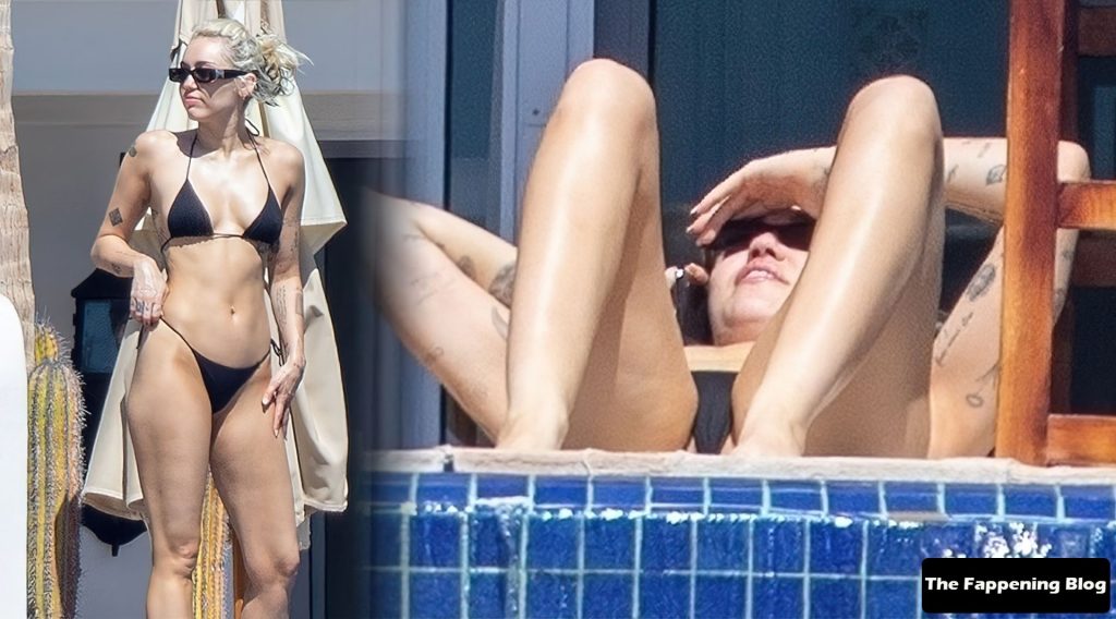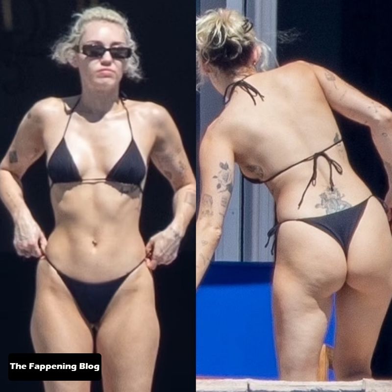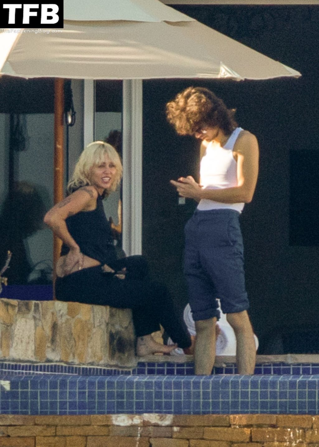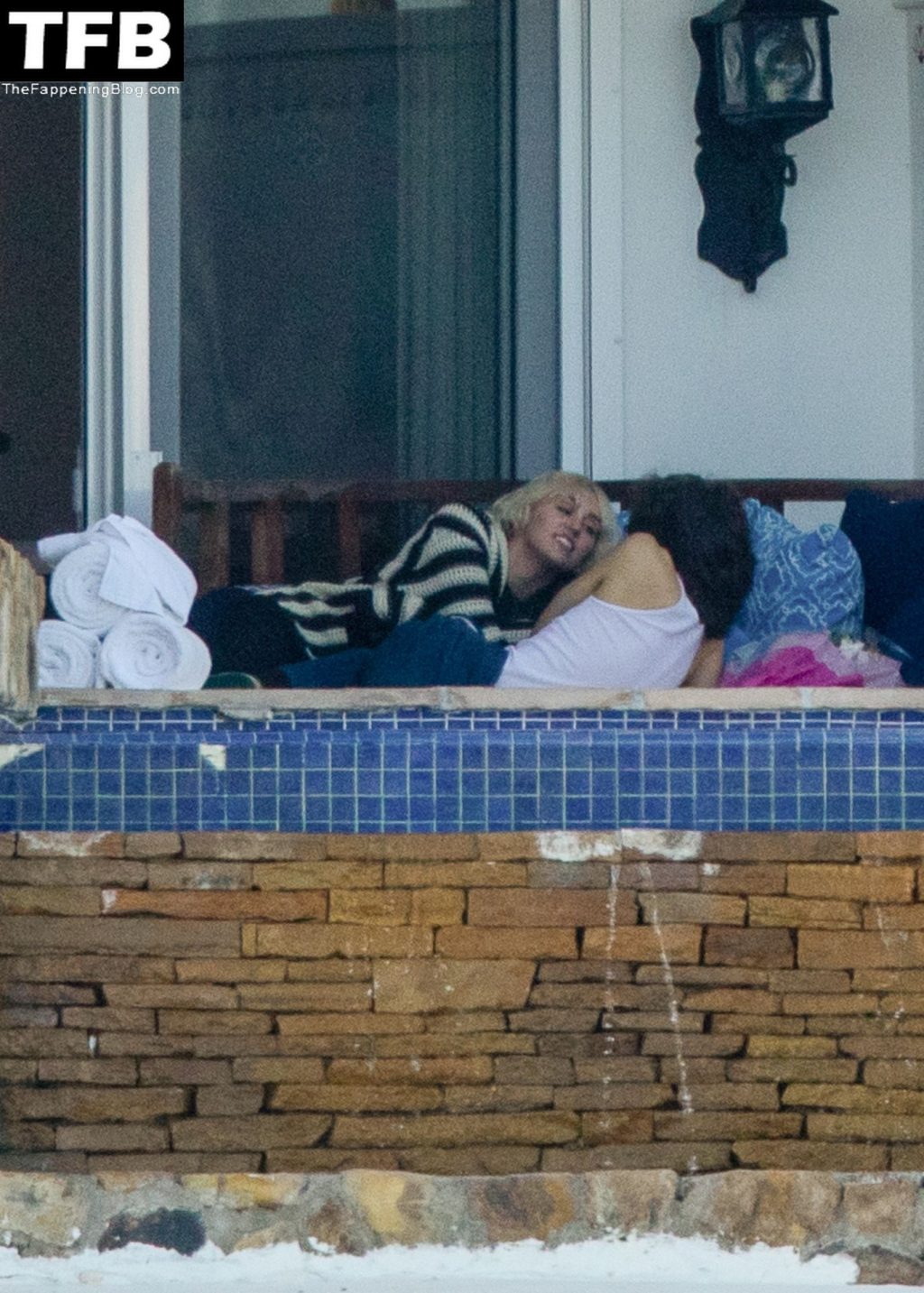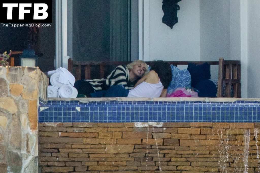 Пара вместе наслаждается тёплым солнцем: Майли в чёрном бикини, а её возлюбленный — в нижнем белье.