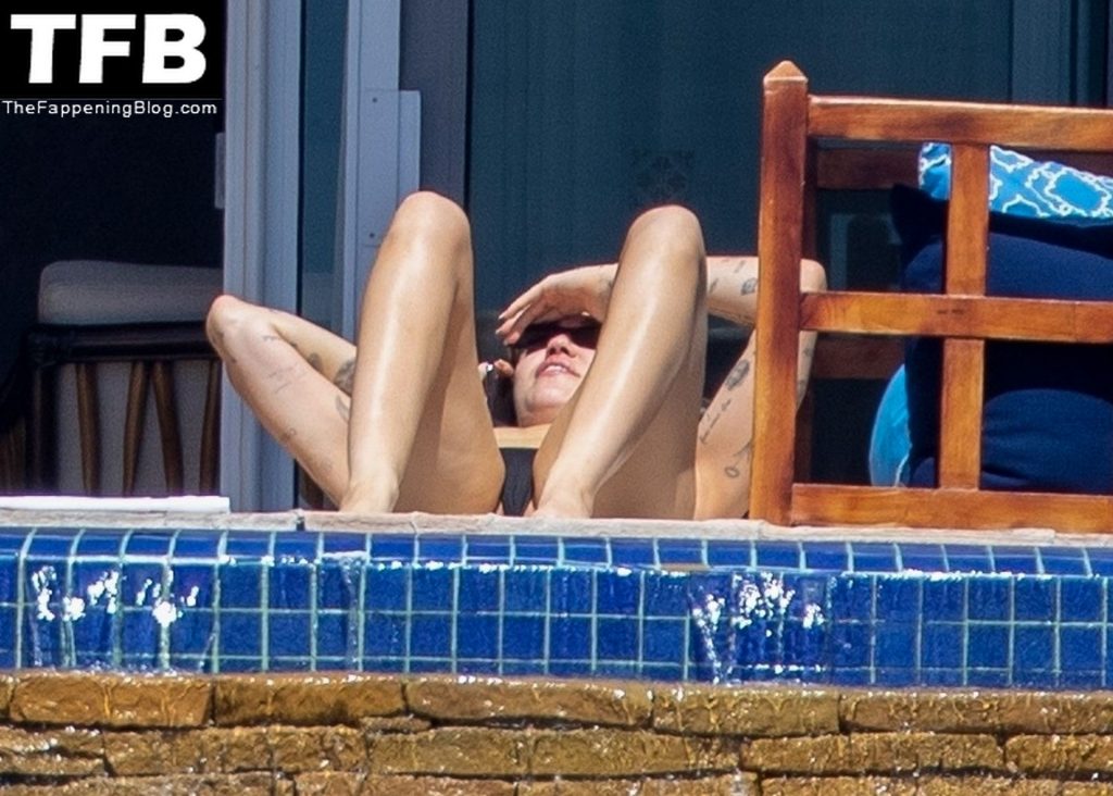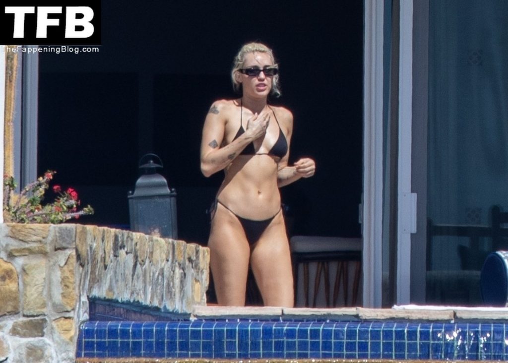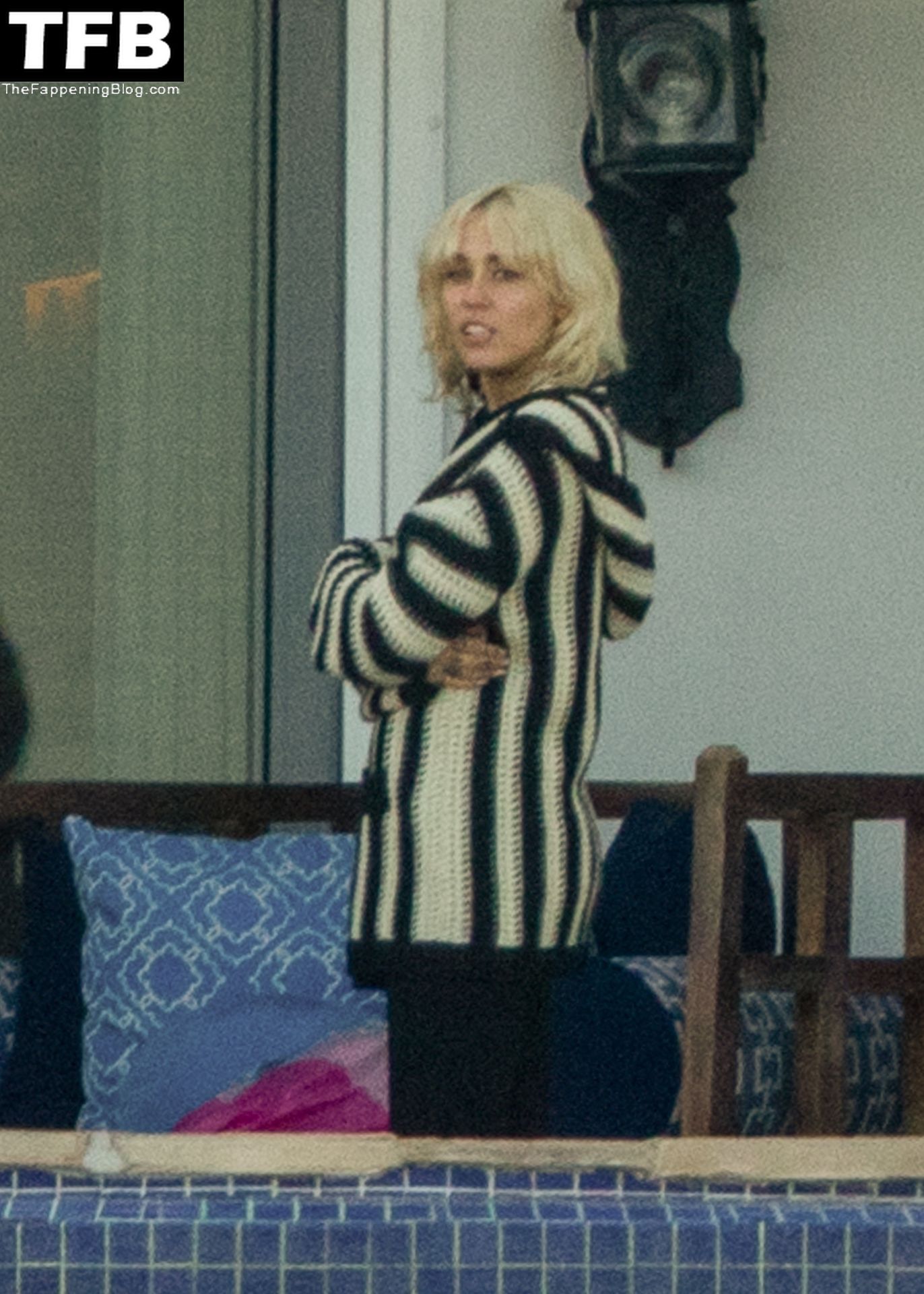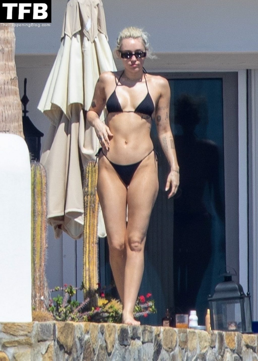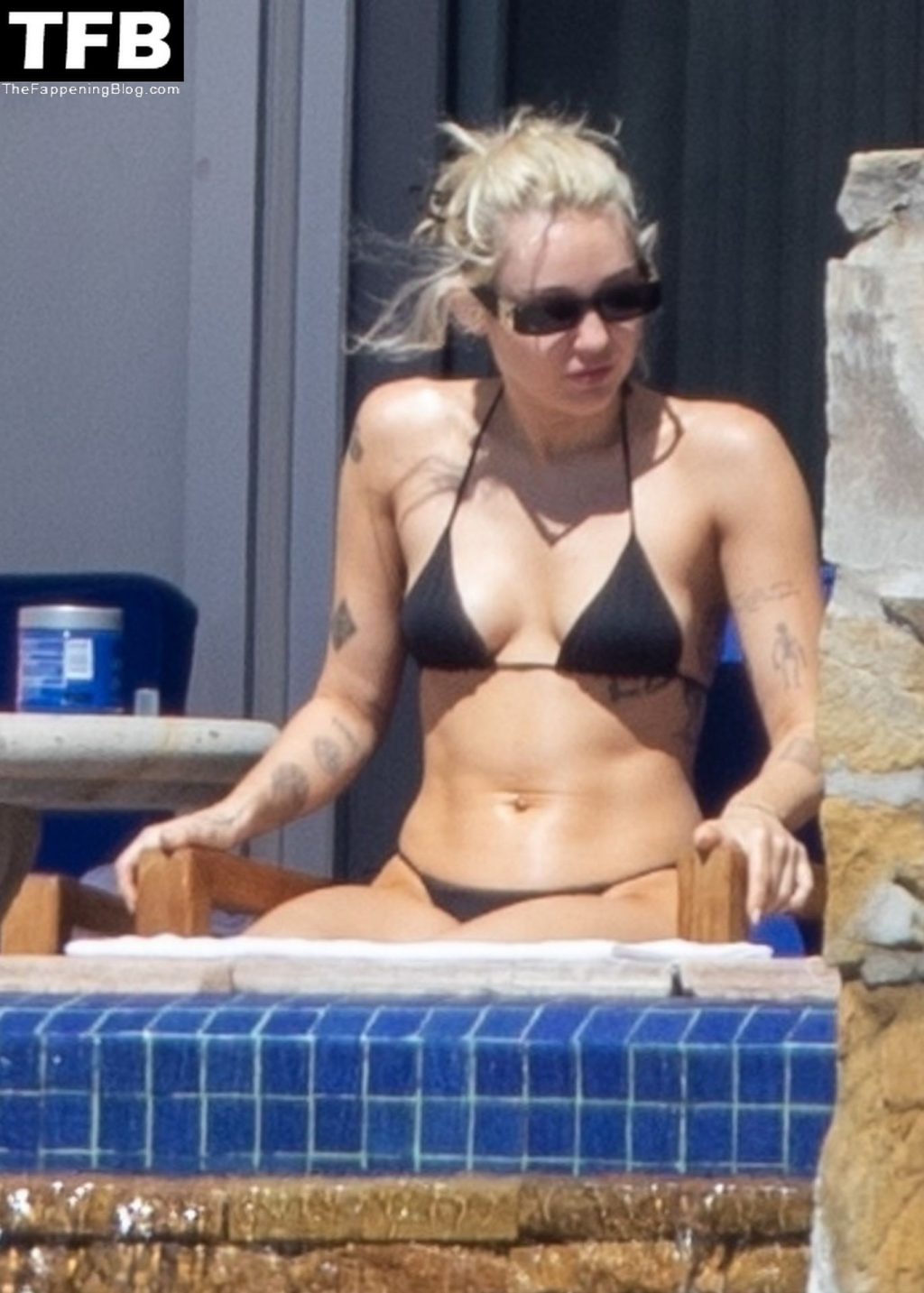 Пара вместе наслаждается тёплым солнцем: Майли в чёрном бикини, а её возлюбленный — в нижнем белье.