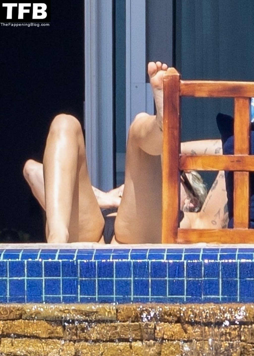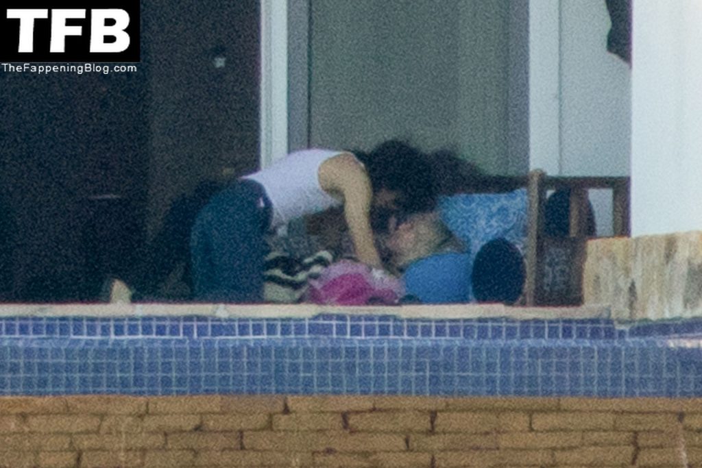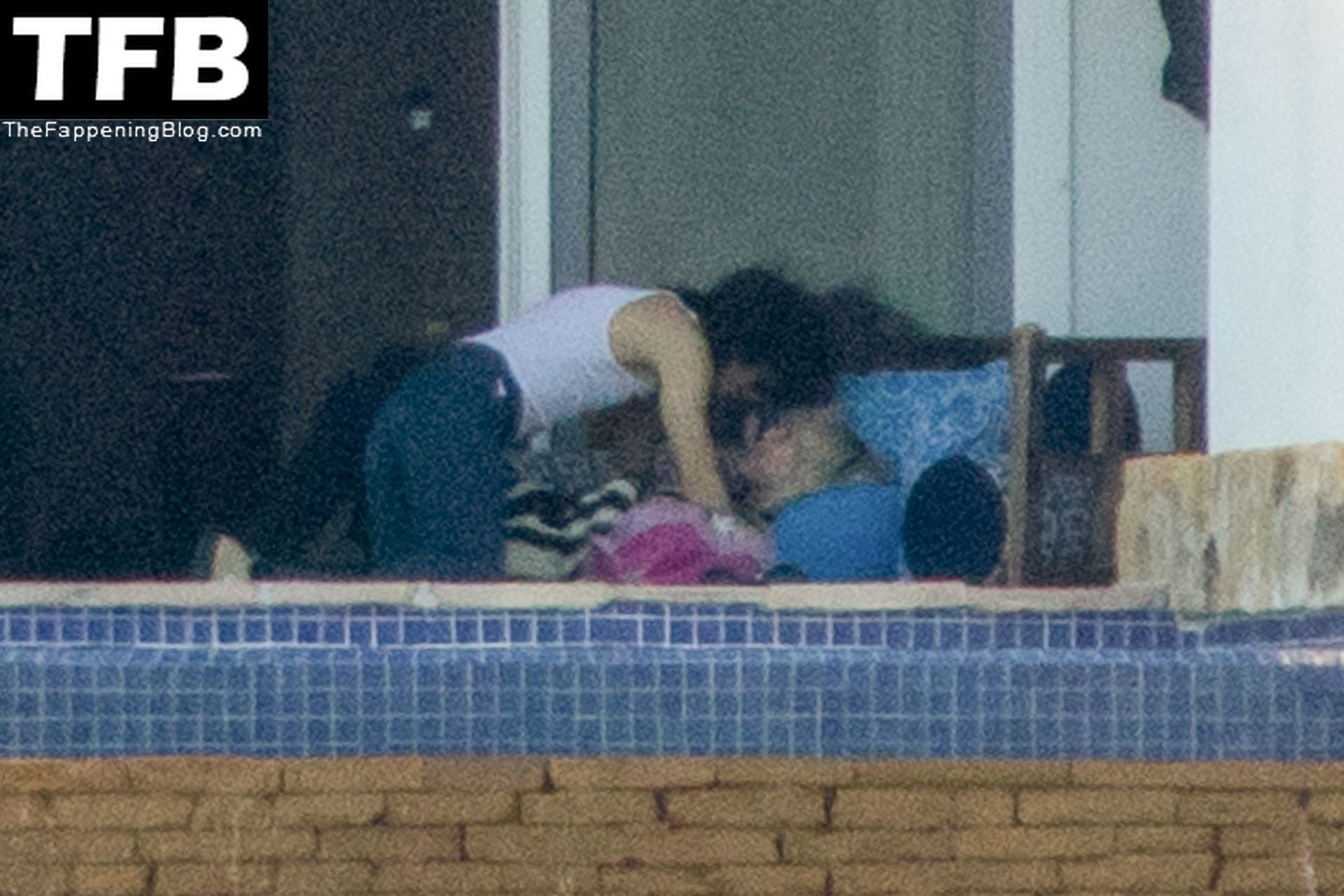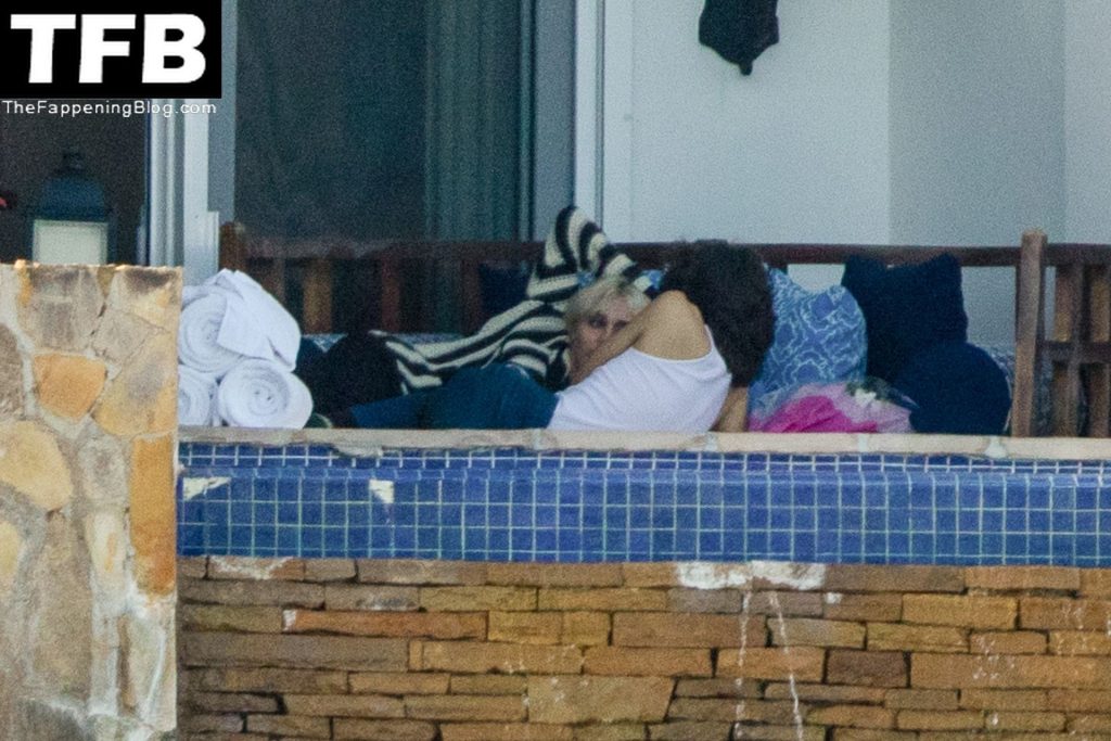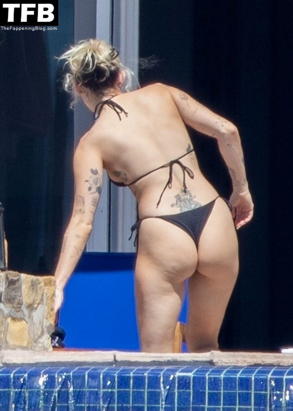Пара вместе наслаждается тёплым солнцем: Майли в чёрном бикини, а её возлюбленный — в нижнем белье.