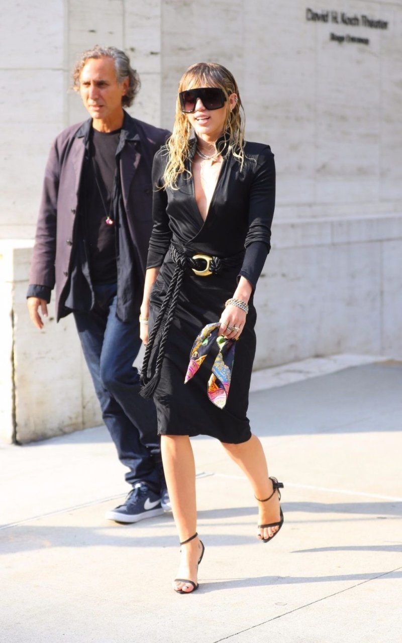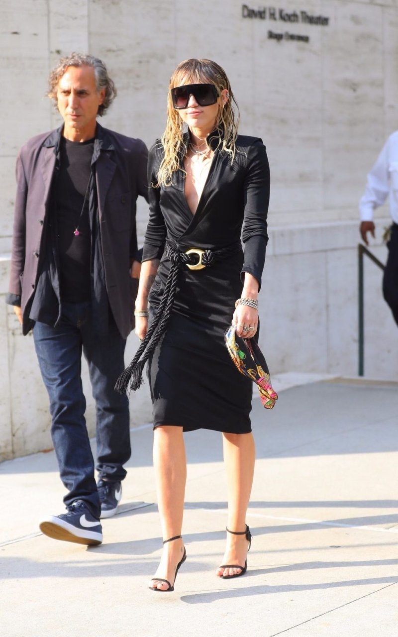 Miley Cyrus была замечена, покидая центр Дэвида Коха после трибьют-выступления в Нью-Йорке, 10.09.2019. Актриса и певица одета в элегантное и сексуальное черное платье с глубоким вырезом!