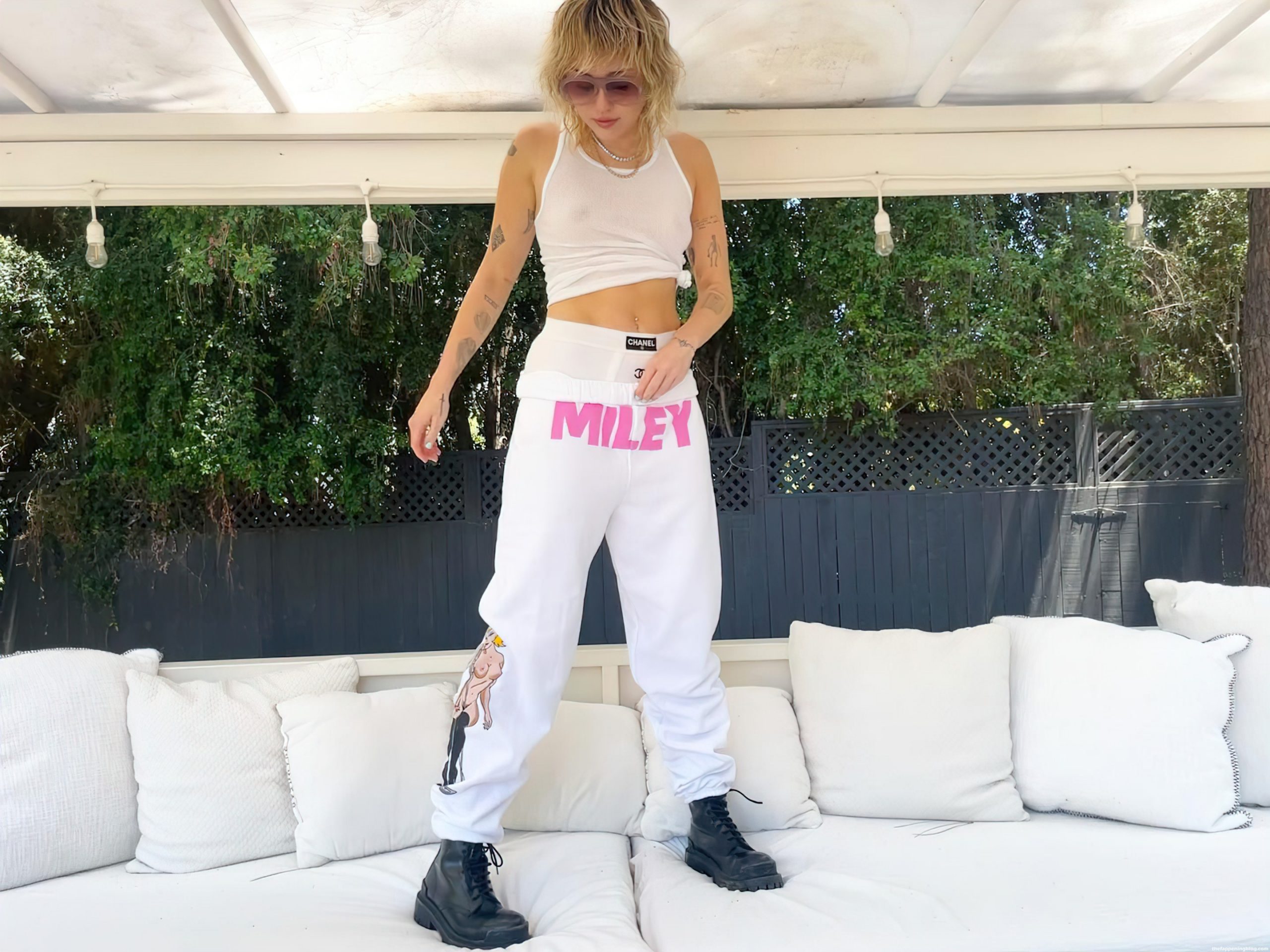 Звезда Фаппенинга Майли Сайрус делает новую промо-фотосессию для соцсетей в поддержку своего мерча, позируя в прозрачной белой футболке без бюстгальтера (июль 2021).