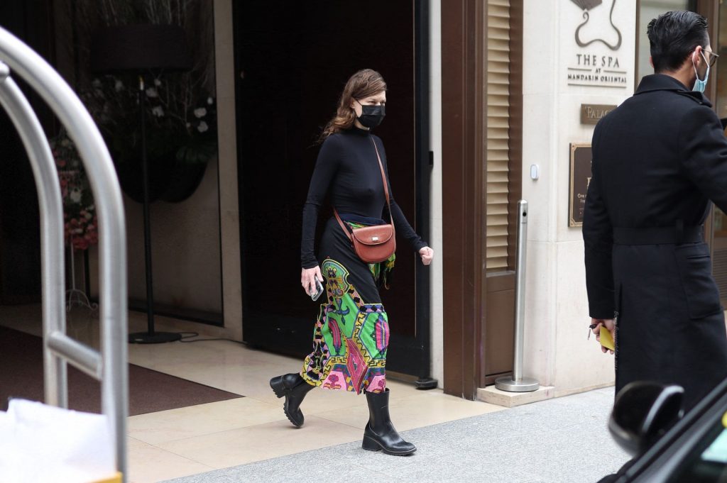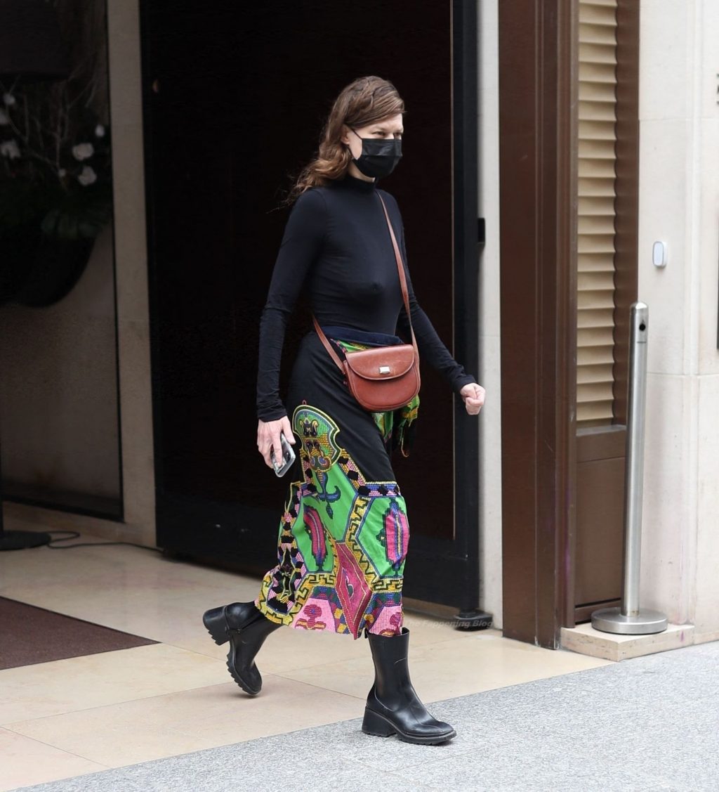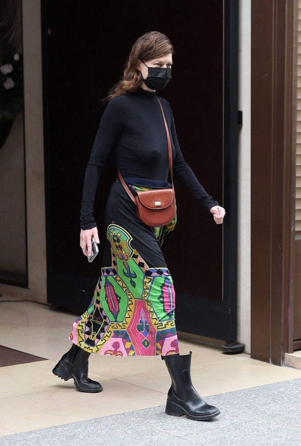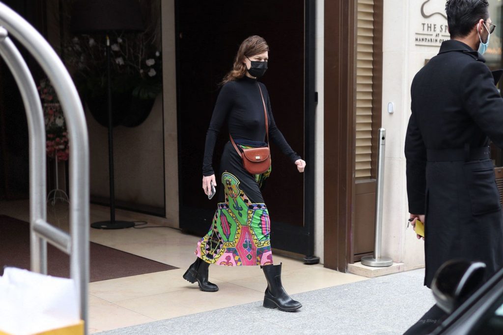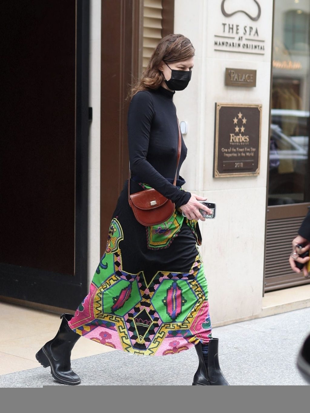 Американская актриса Милла Йовович демонстрирует стиль, покидая отель Mandarin. Она надела маску для лица и носила многоцветную юбку и черные ботинки во время недели моды в Париже, 03/05/2021.