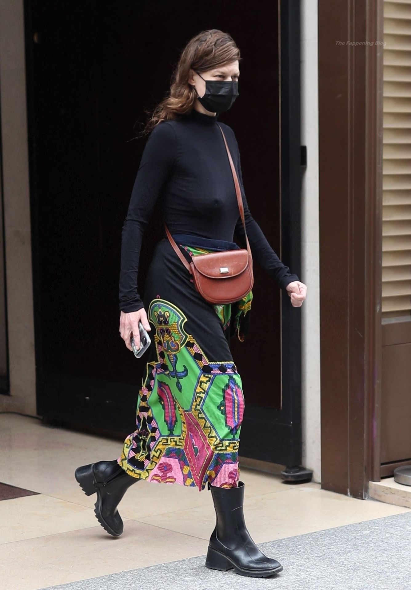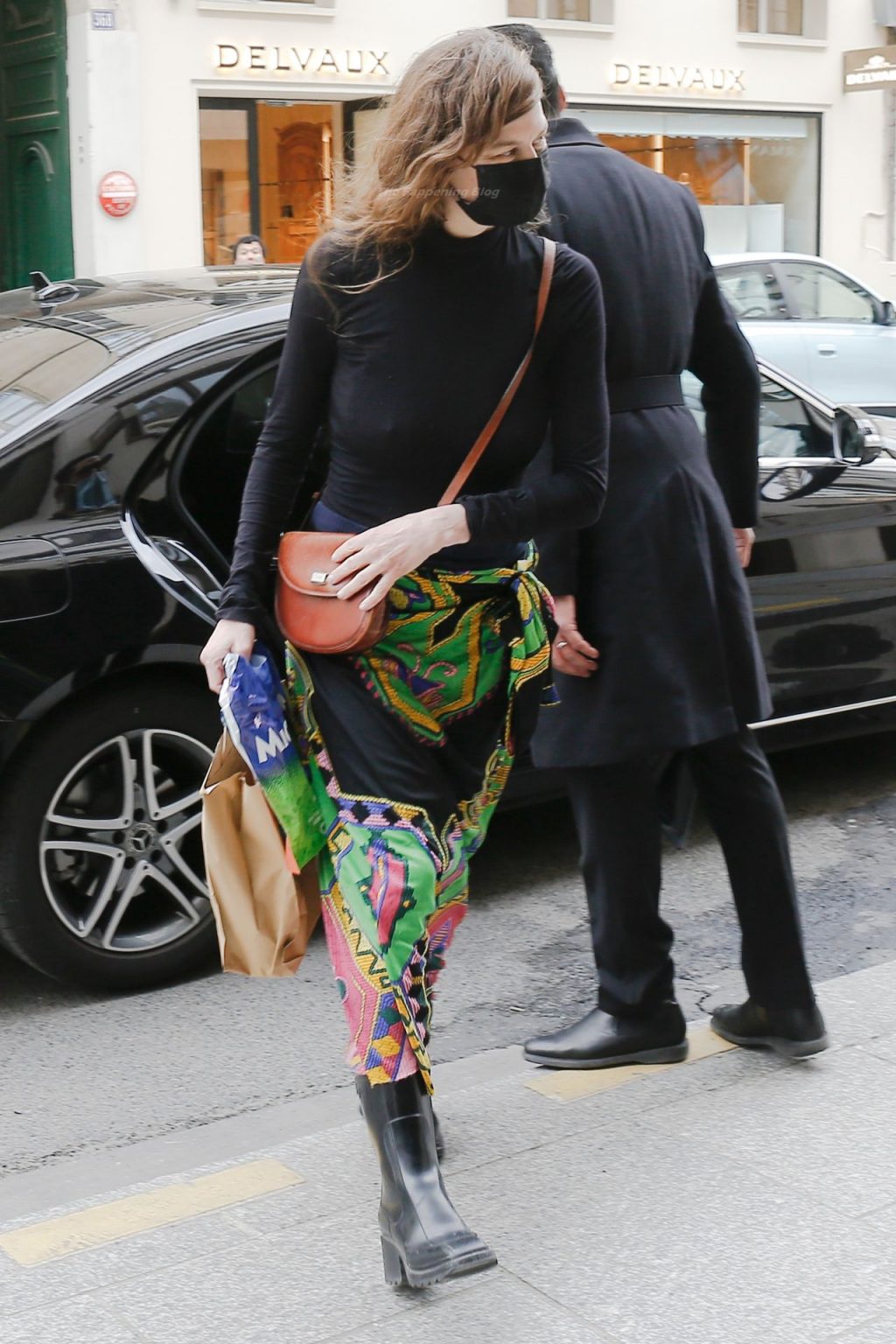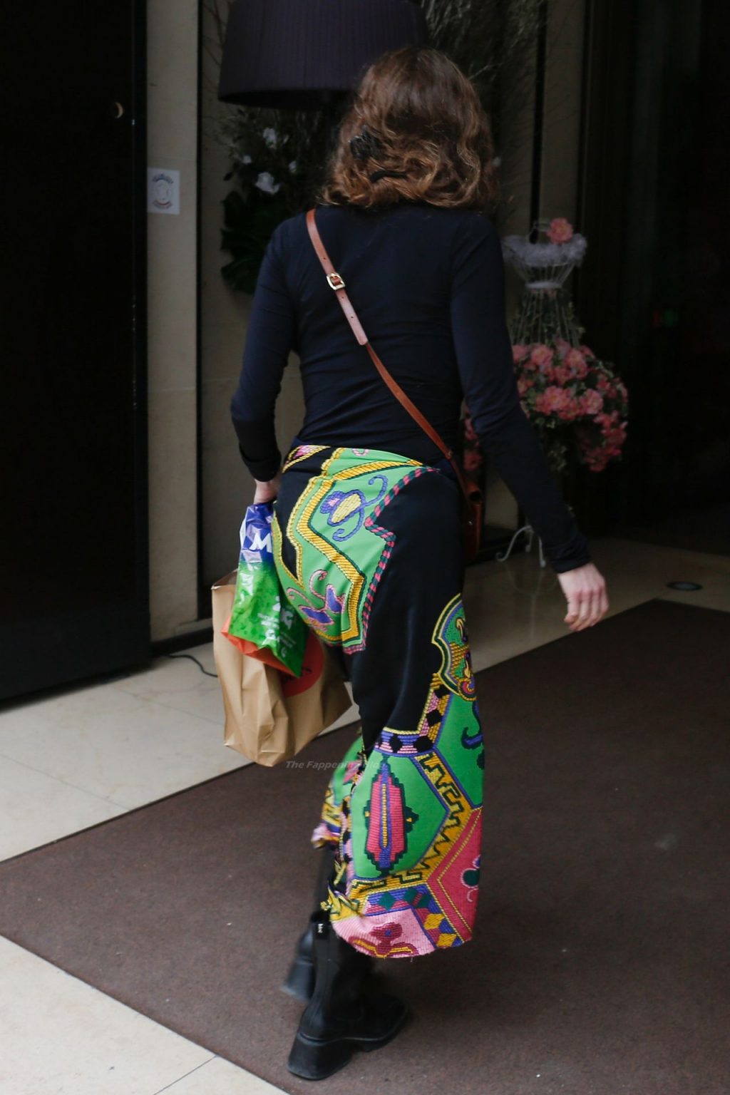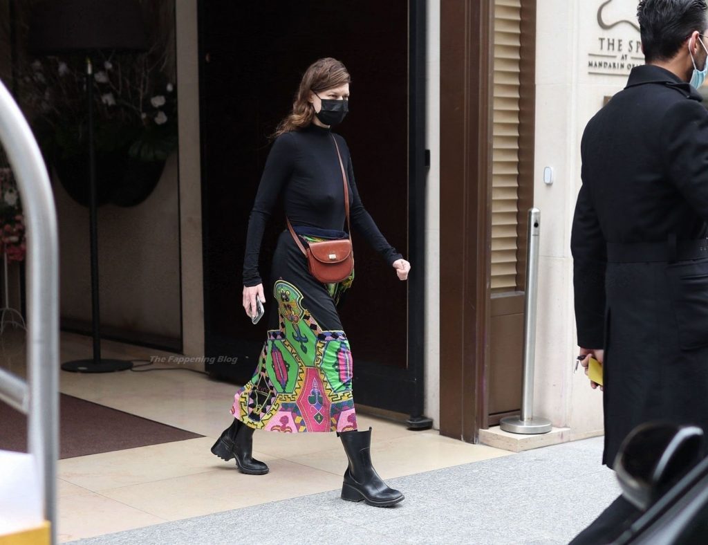 Американская актриса Милла Йовович демонстрирует стиль, покидая отель Mandarin. Она надела маску для лица и носила многоцветную юбку и черные ботинки во время недели моды в Париже, 03/05/2021.