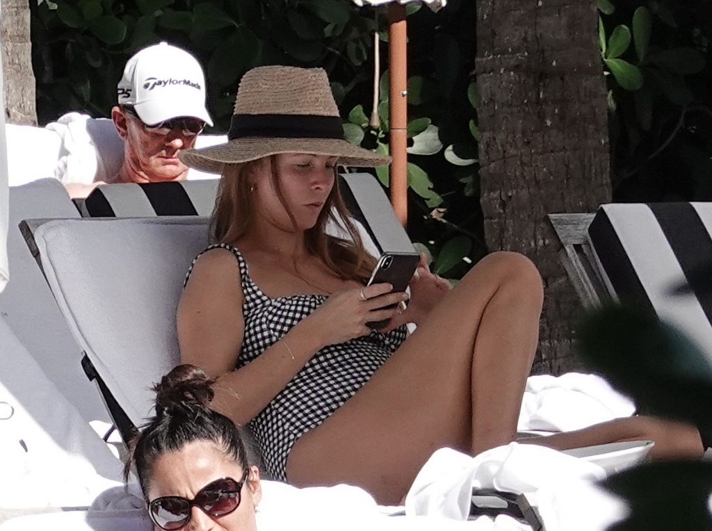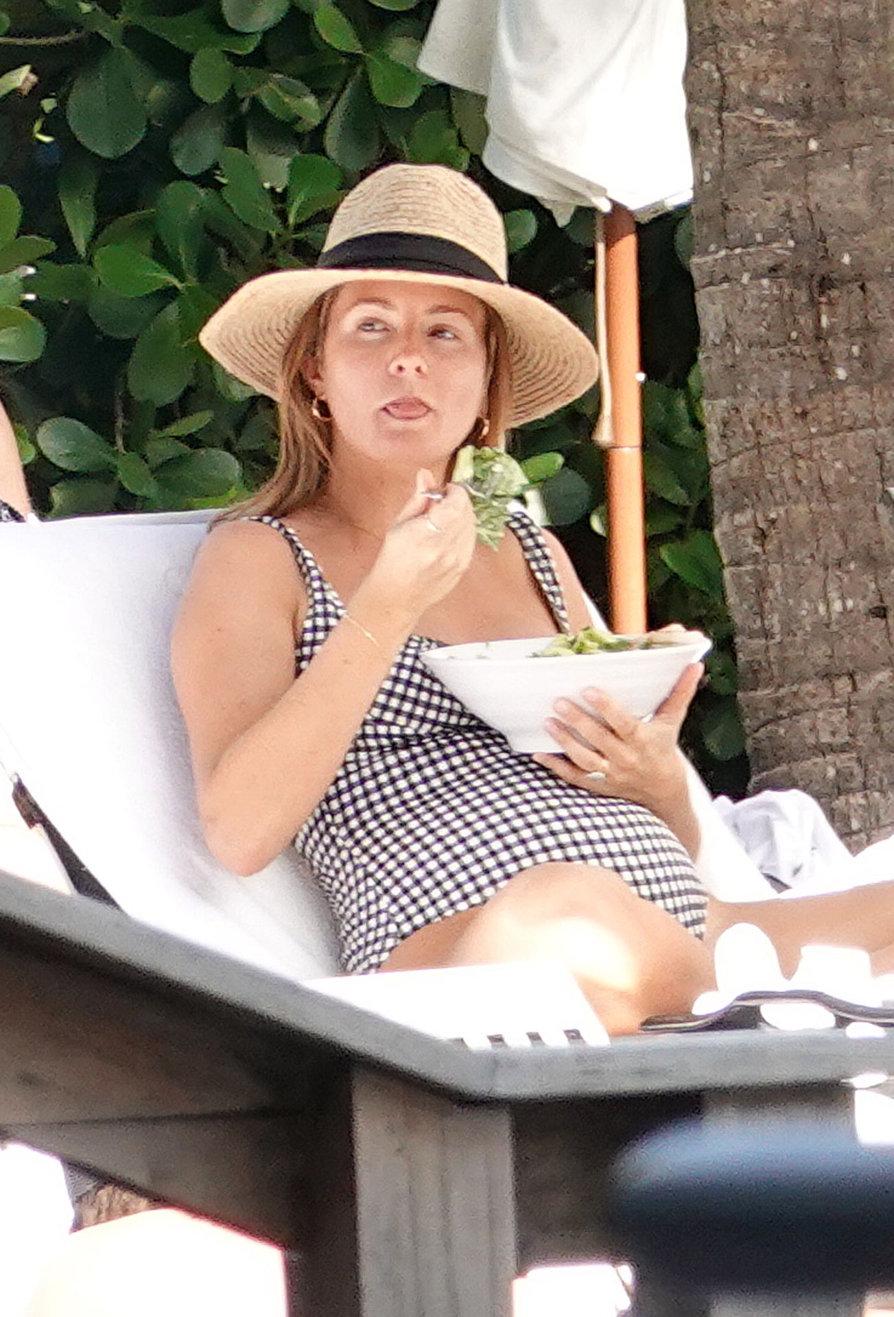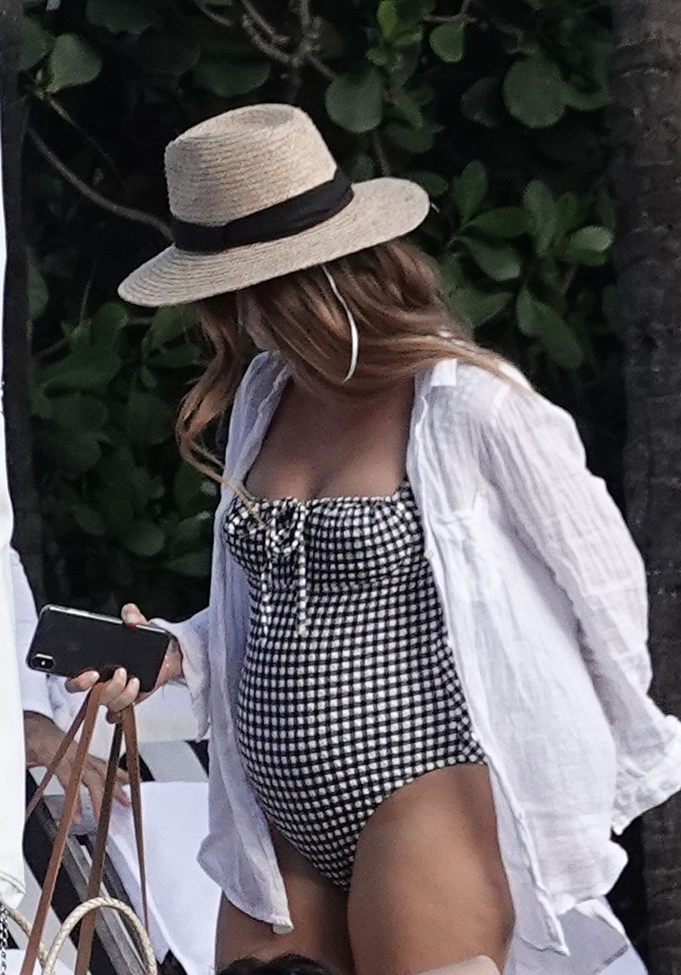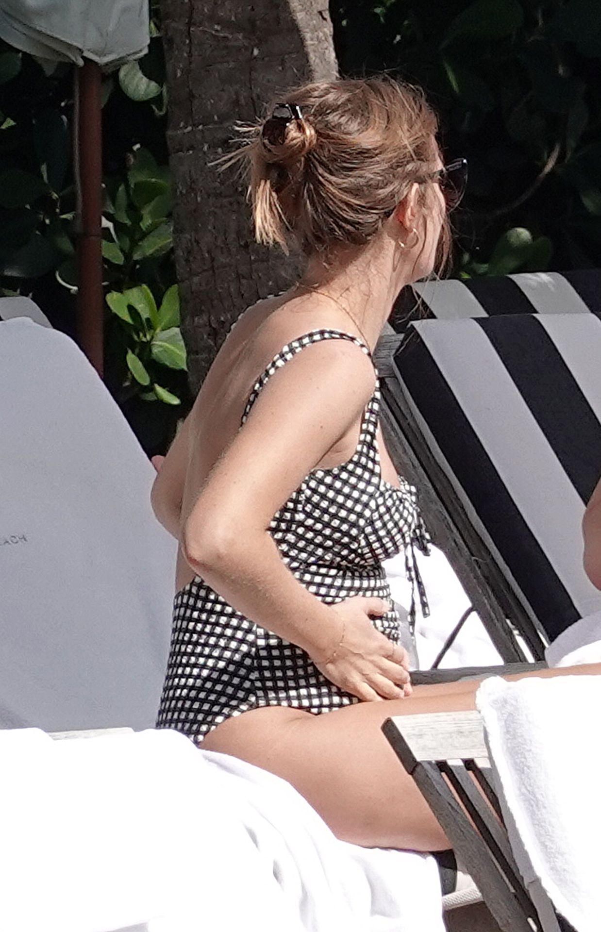 Беременная звезда Милли Маккинтош демонстрирует свой животик в купальнике и нежно прижимает живот, отдыхая у бассейна в Майами, 21.11.2019.