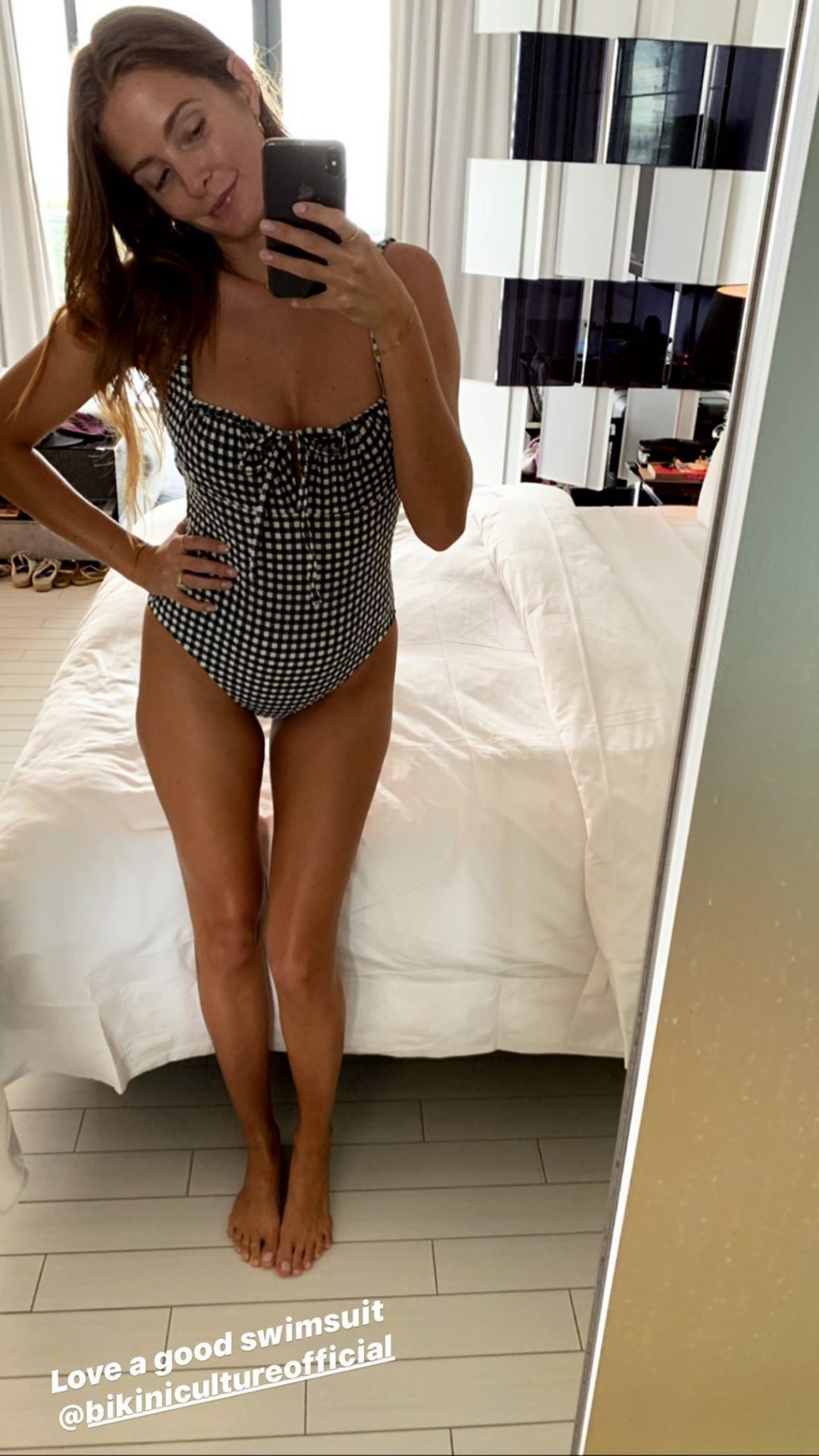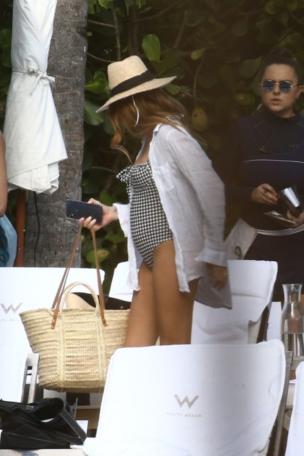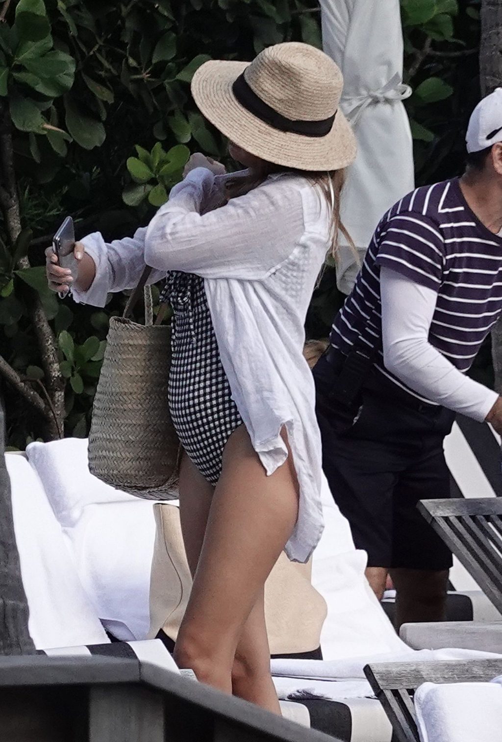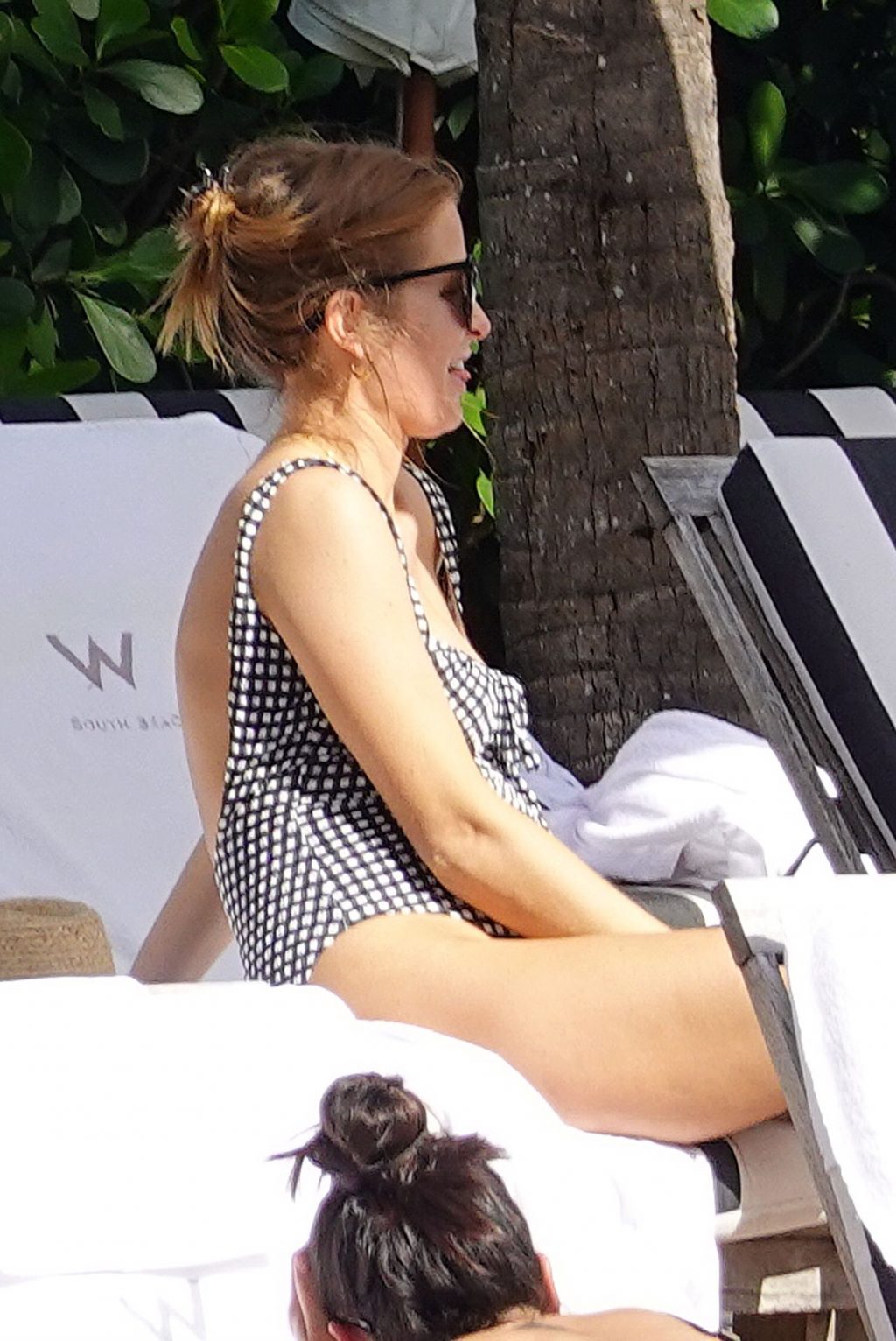 Беременная звезда Милли Маккинтош демонстрирует свой животик в купальнике и нежно прижимает живот, отдыхая у бассейна в Майами, 21.11.2019.