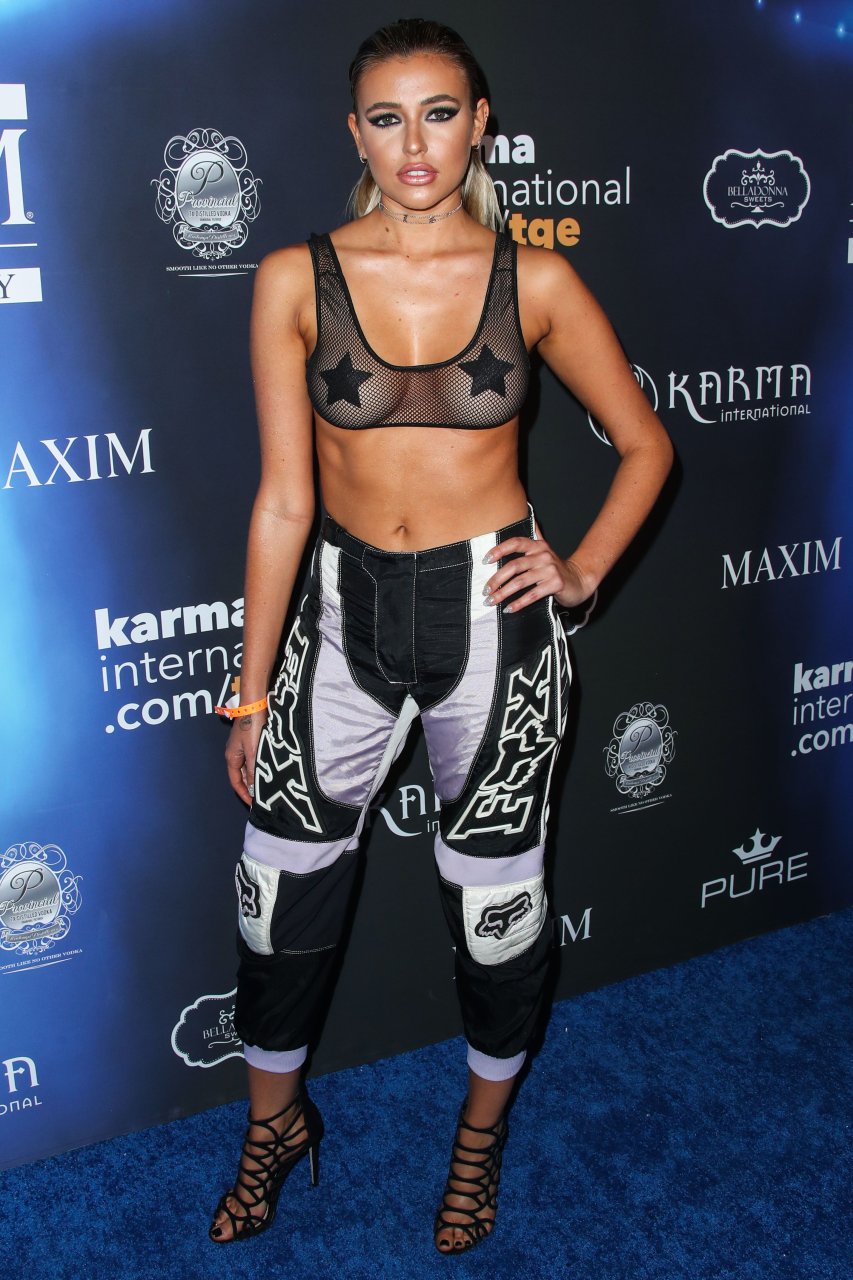 Monica Sims носит прозрачный топ с наклейками на груди на вечеринке Maxim Halloween Party 2017 в Лос-Анджелесе, 21.10.2017. Monica Sims — американская модель, Playmate месяца Playboy (2015). Возраст — 25.
