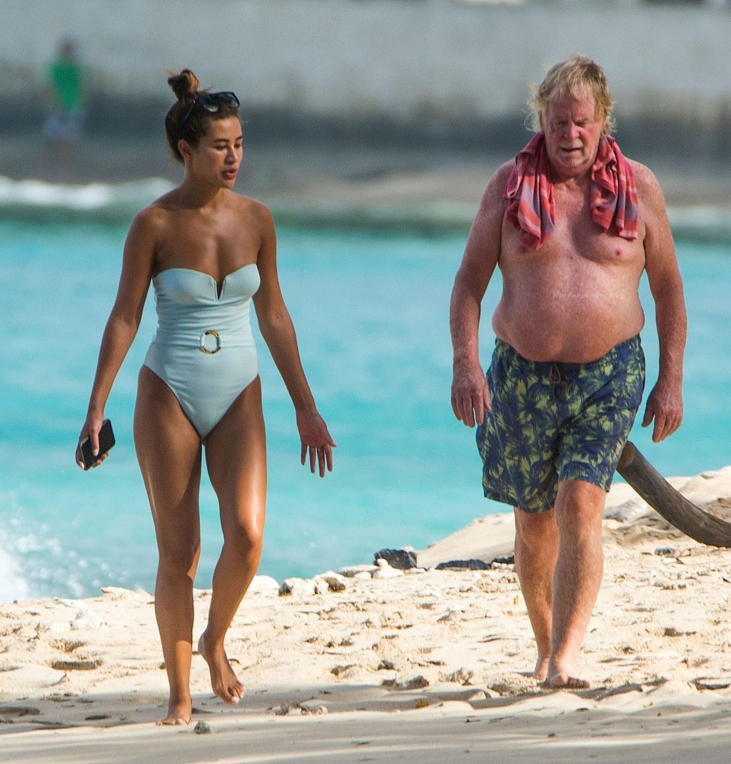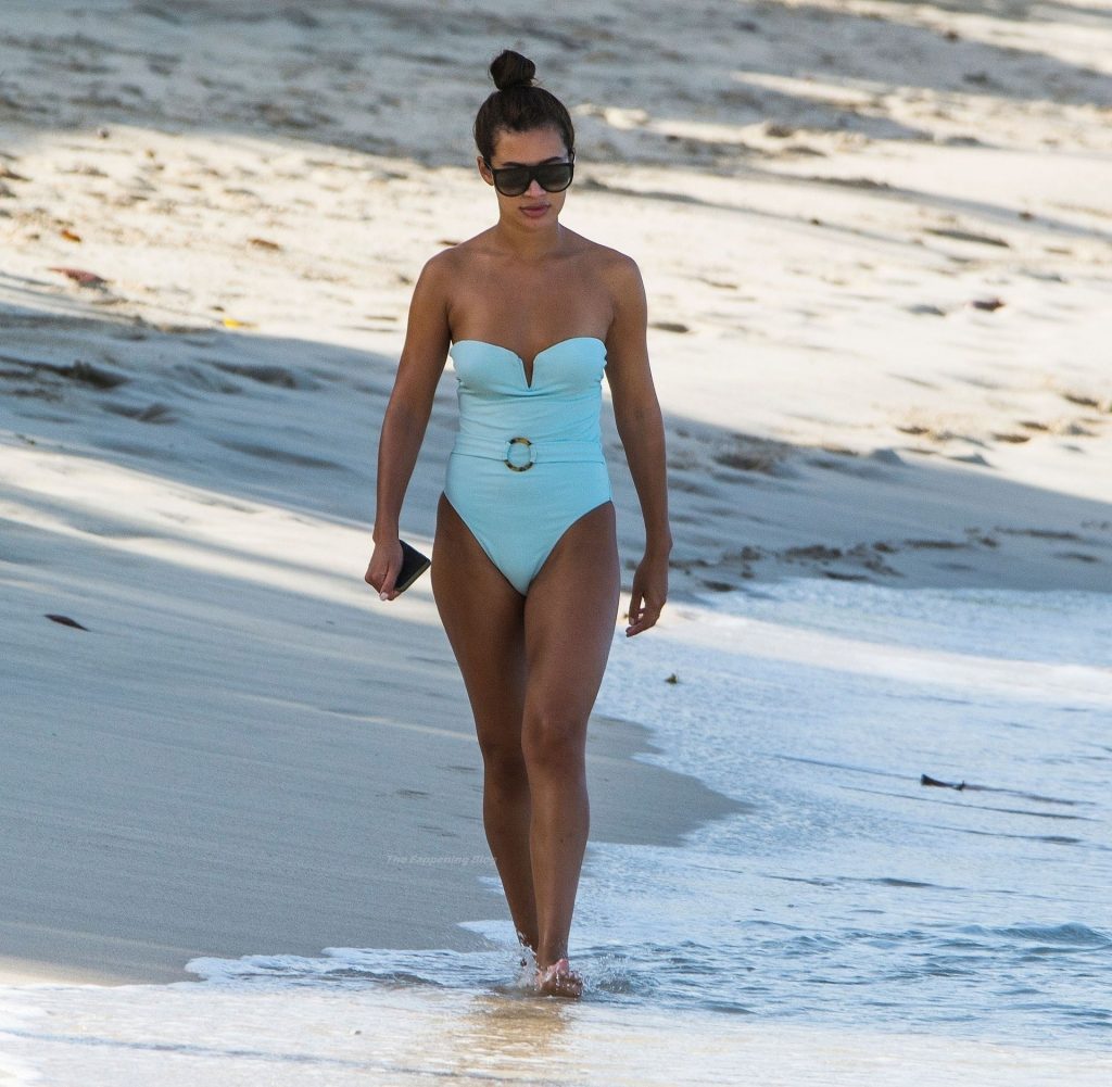 В надетом ею откровенном светло-голубом купальнике, сексуальная звезда прогуливалась по золотистому песчаному пляжу в приходе Сент-Питер.