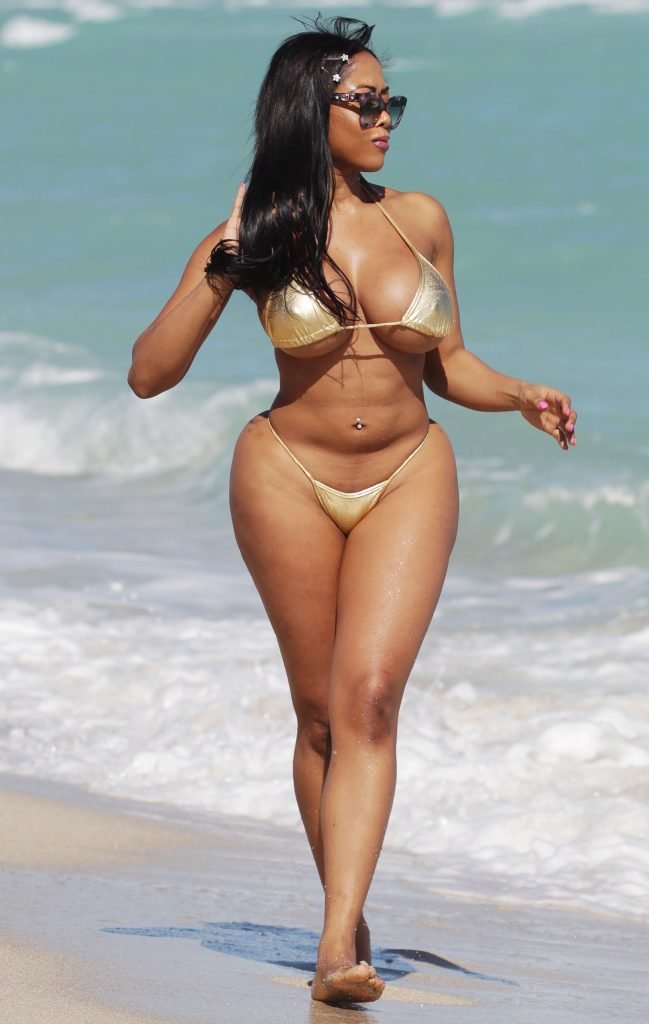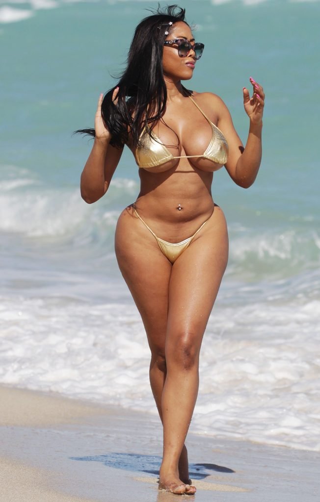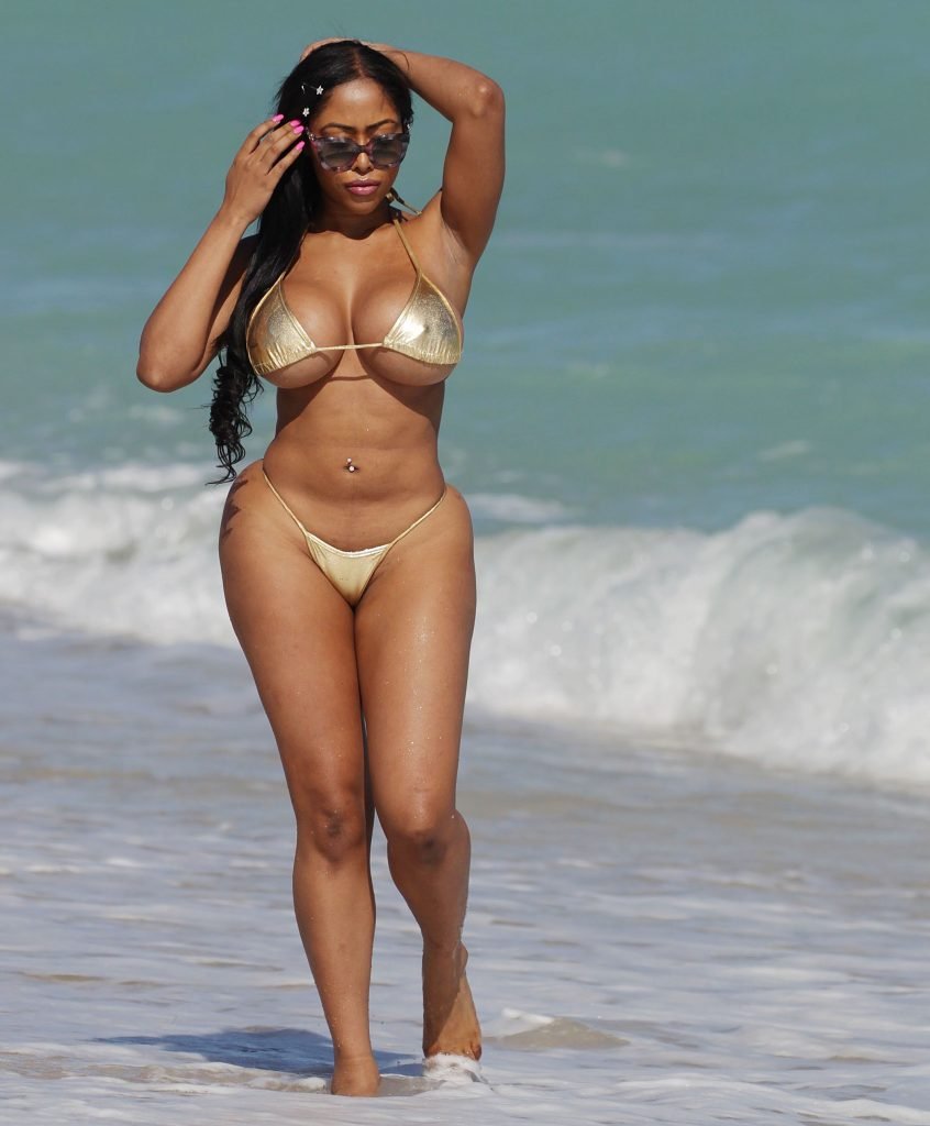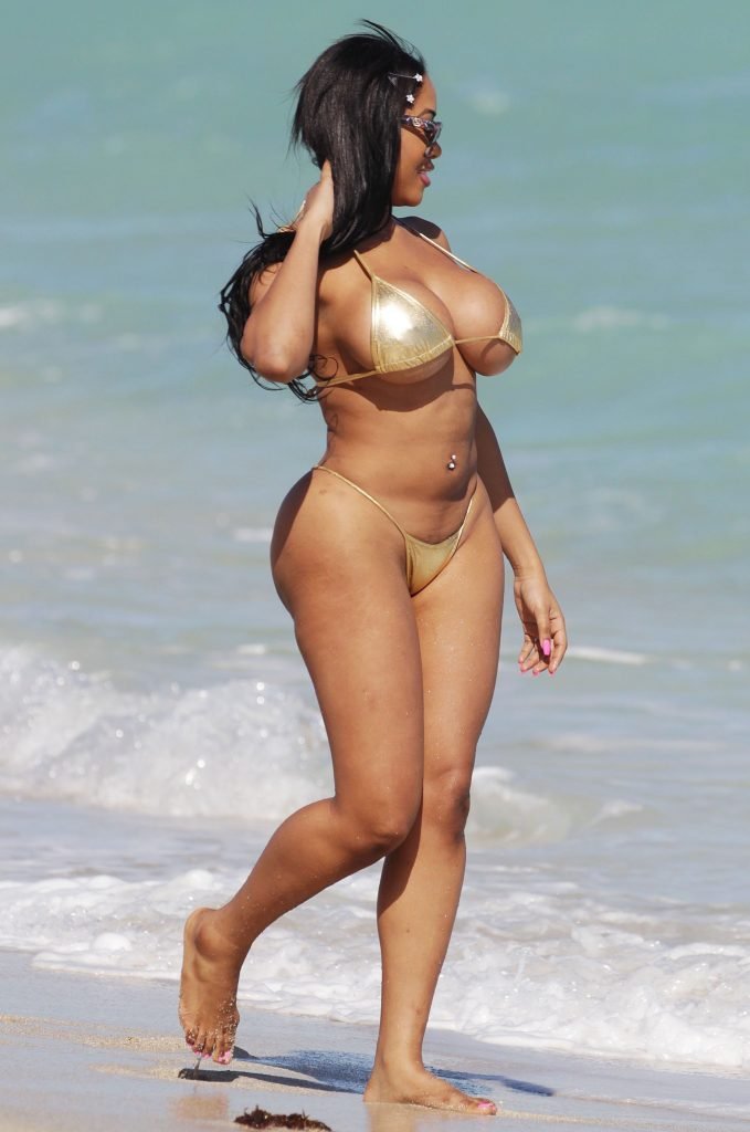 Instagram-звезда Moriah Mills носит крошечное золотое бикини на пляже в Майами-Бич, 17.01.2018.