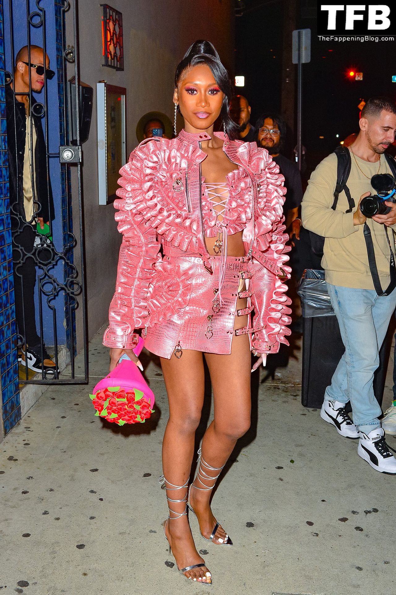 Певица с длинными ногами Муни Лонг запечатлена в сексуальном розовом наряде в Лос-Анджелесе, 14.02.2022.