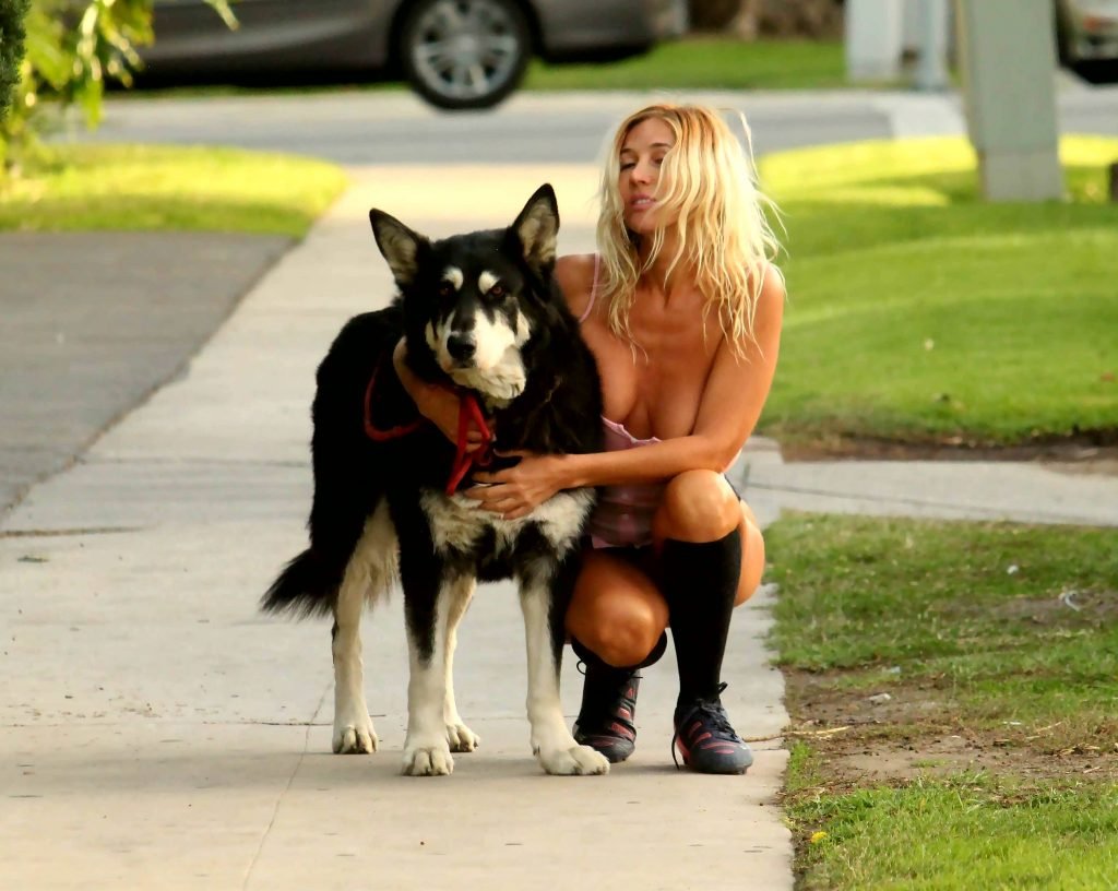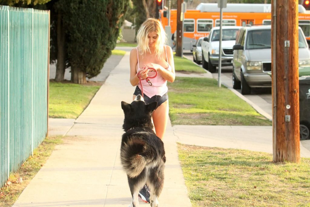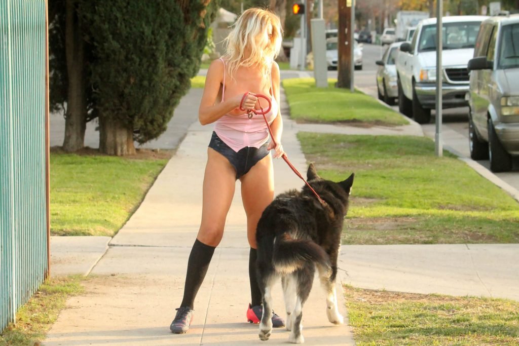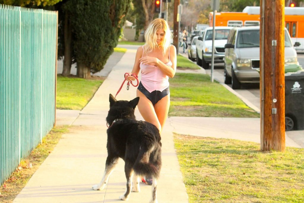 Российская певица Надея Волиянова, 31 год, столкнулась с проблемой в гардеробе, выгуливая собаку в Беверли-Хиллз, 25.01.2018.